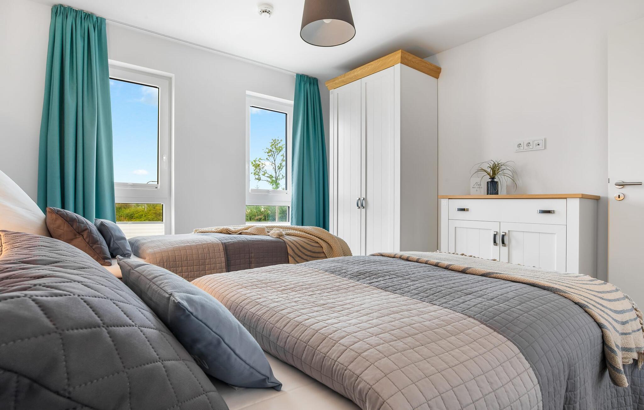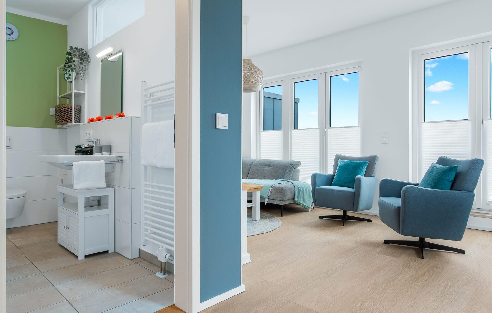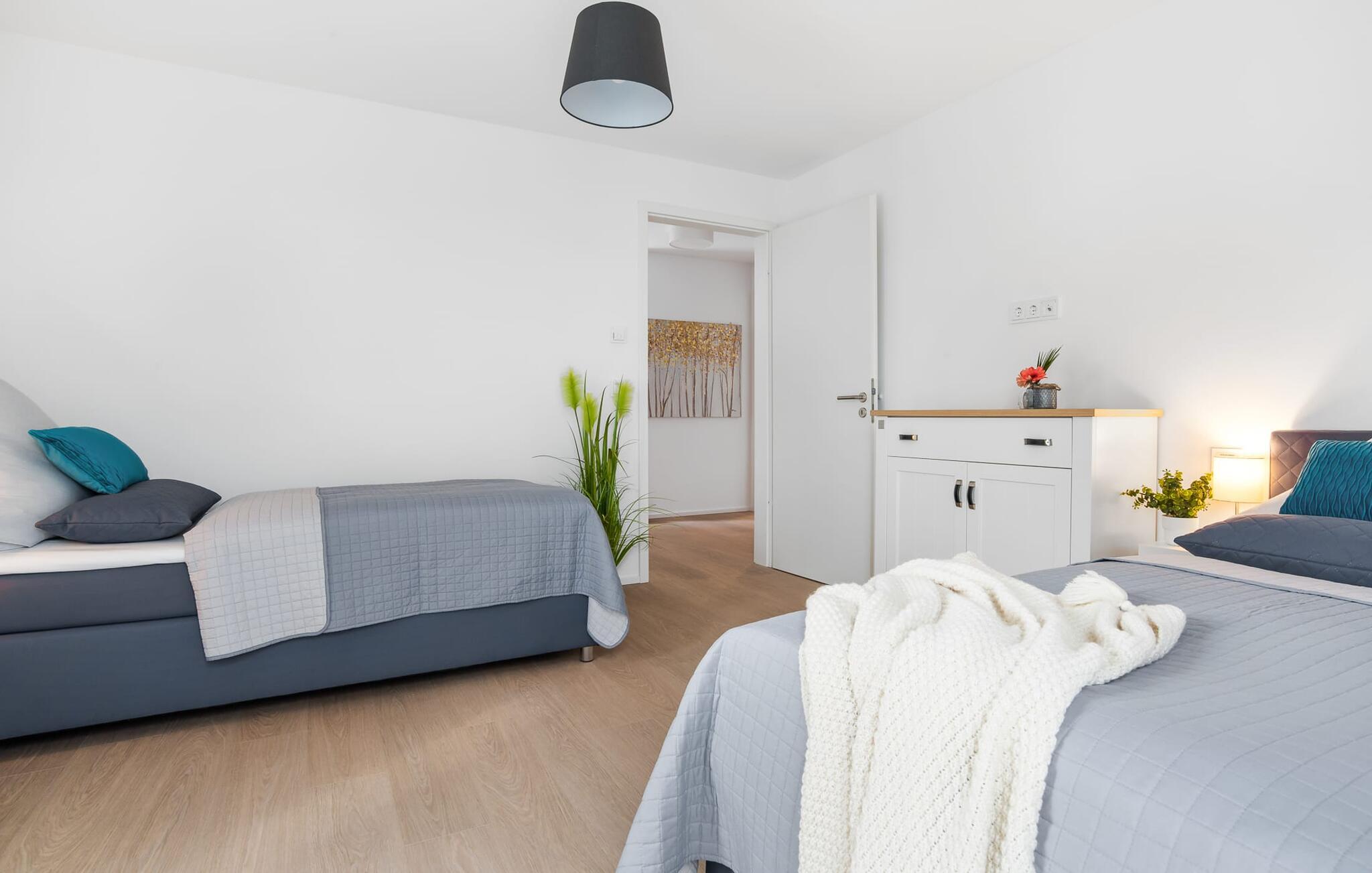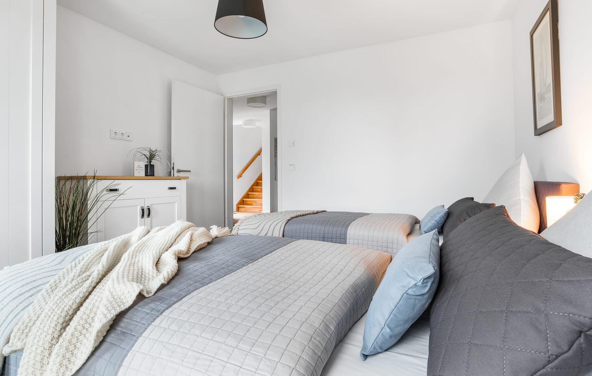 Beim Betreten der Ferienwohnung im ersten Obergeschoss, beginnt vom ersten Moment an die Entschleunigung. Sie befinden sich direkt im Ruhebereich der Wohnung. In dieser Etage befinden sich die drei Schlafzimmer der Wohnung. Egal für welches Schlafzimmer Sie sich entscheiden, erholsamer Schlaf ist Ihnen sicher. Ein Schlafzimmer ist mit einem Doppelbett und einem Fernseher ausgestattet. Die anderen beiden Schlafzimmer bieten je zwei Einzelbetten für erholsame Nächte im Urlaub.