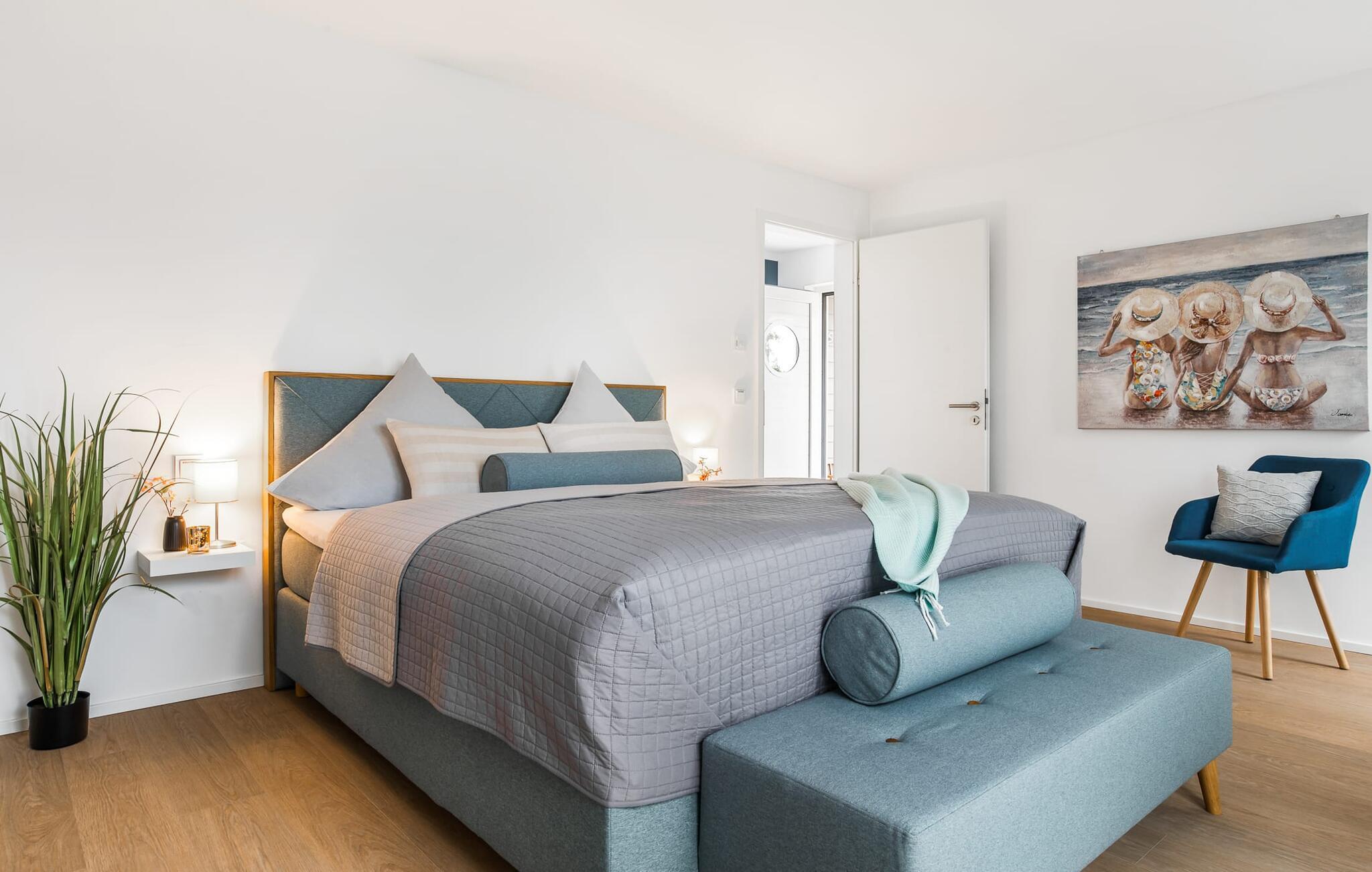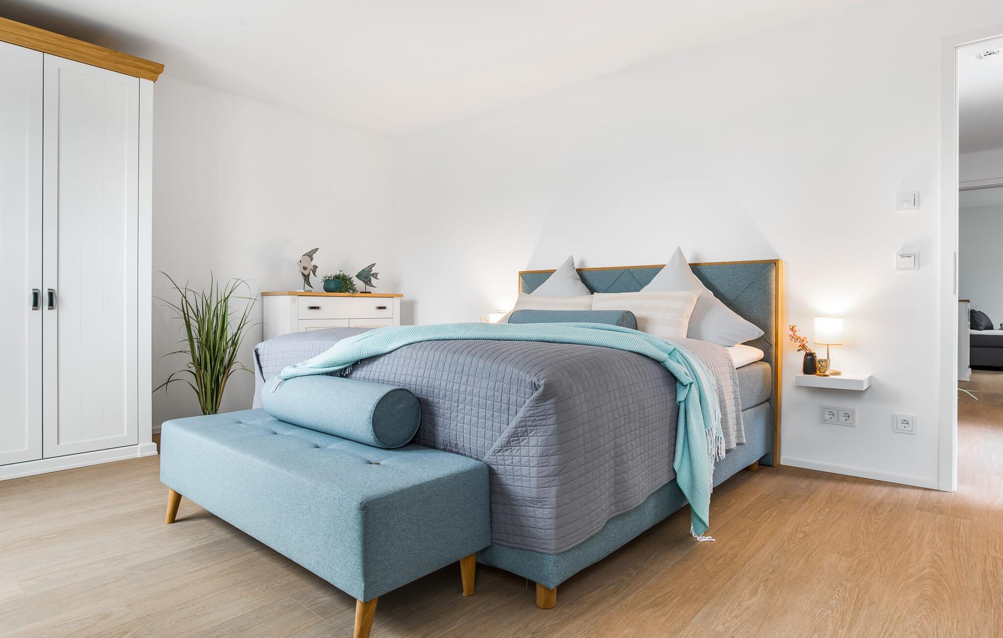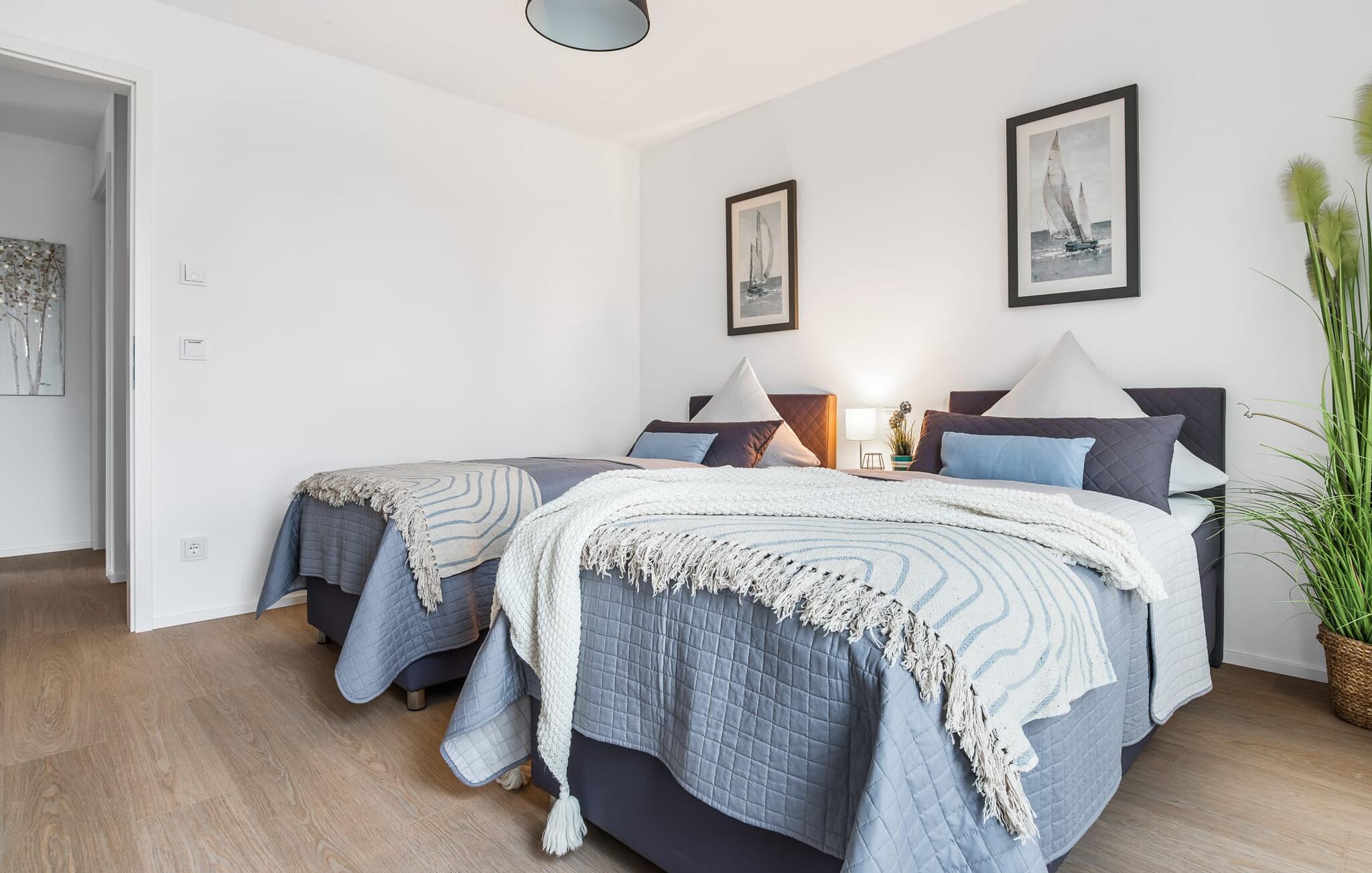 Beim Betreten der Ferienwohnung im ersten Obergeschoss, beginnt vom ersten Moment an die Entschleunigung. Sie befinden sich direkt im Ruhebereich der Wohnung. In dieser Etage befinden sich die drei Schlafzimmer der Wohnung. Egal für welches Schlafzimmer Sie sich entscheiden, erholsamer Schlaf ist Ihnen sicher. Ein Schlafzimmer ist mit einem Doppelbett und einem Fernseher ausgestattet. Die anderen beiden Schlafzimmer bieten je zwei Einzelbetten für erholsame Nächte im Urlaub.