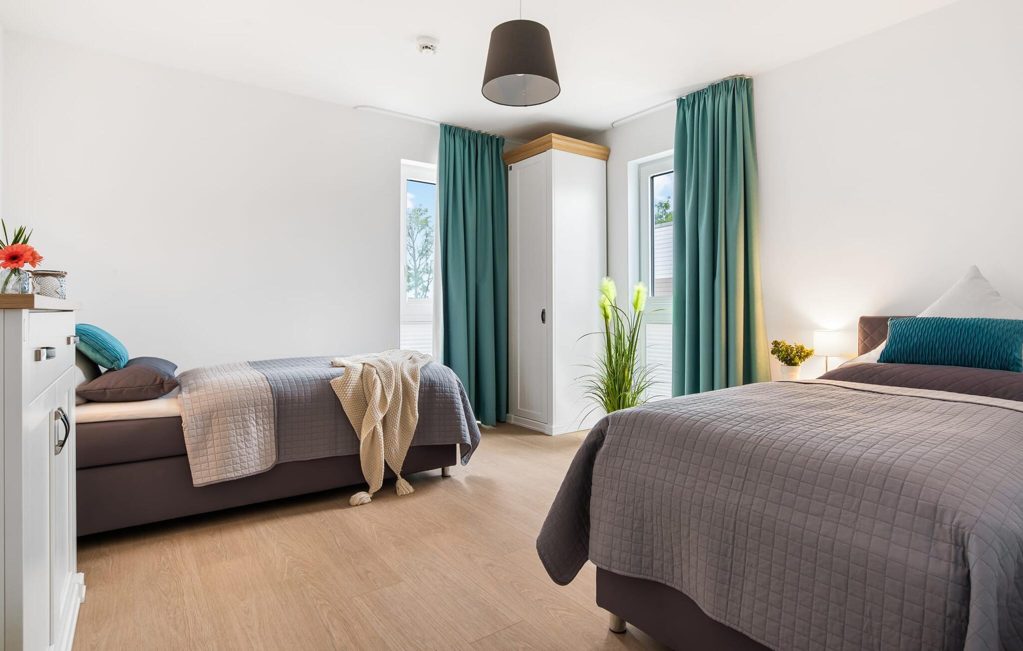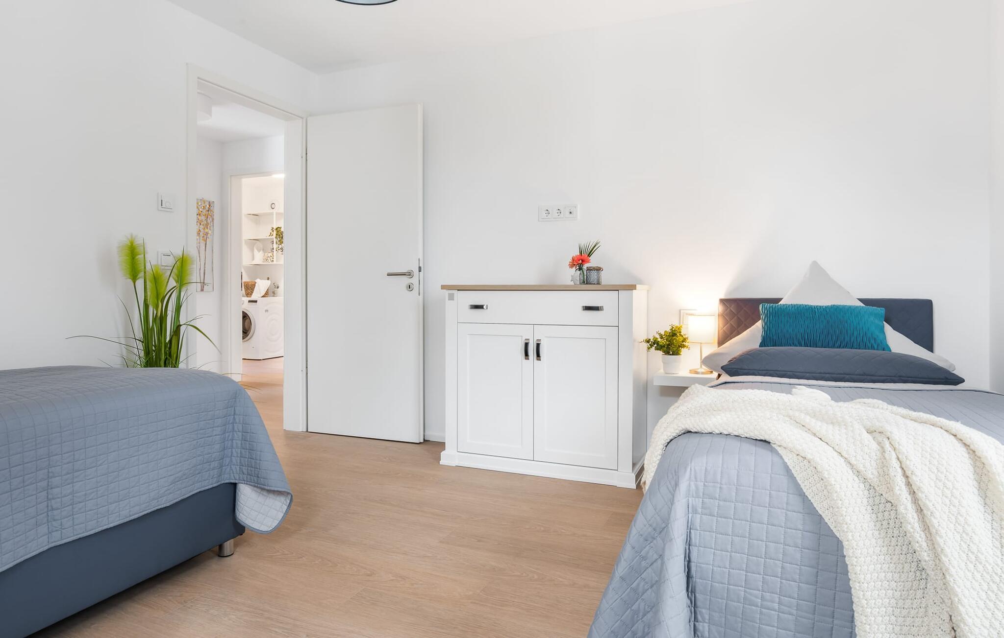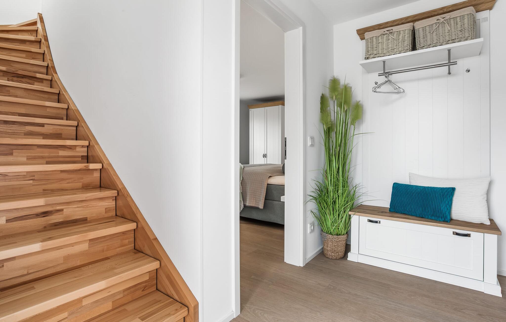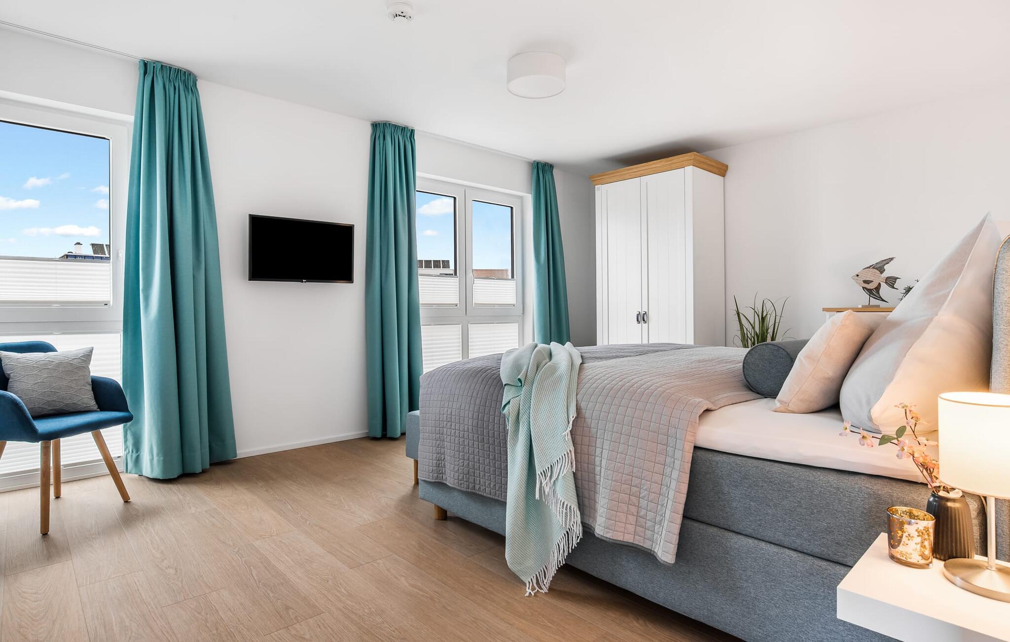 Beim Betreten der Ferienwohnung im ersten Obergeschoss, beginnt vom ersten Moment an die Entschleunigung. Sie befinden sich direkt im Ruhebereich der Wohnung. In dieser Etage befinden sich die drei Schlafzimmer der Wohnung. Egal für welches Schlafzimmer Sie sich entscheiden, erholsamer Schlaf ist Ihnen sicher. Ein Schlafzimmer ist mit einem Doppelbett und einem Fernseher ausgestattet. Die anderen beiden Schlafzimmer bieten je zwei Einzelbetten für erholsame Nächte im Urlaub.
