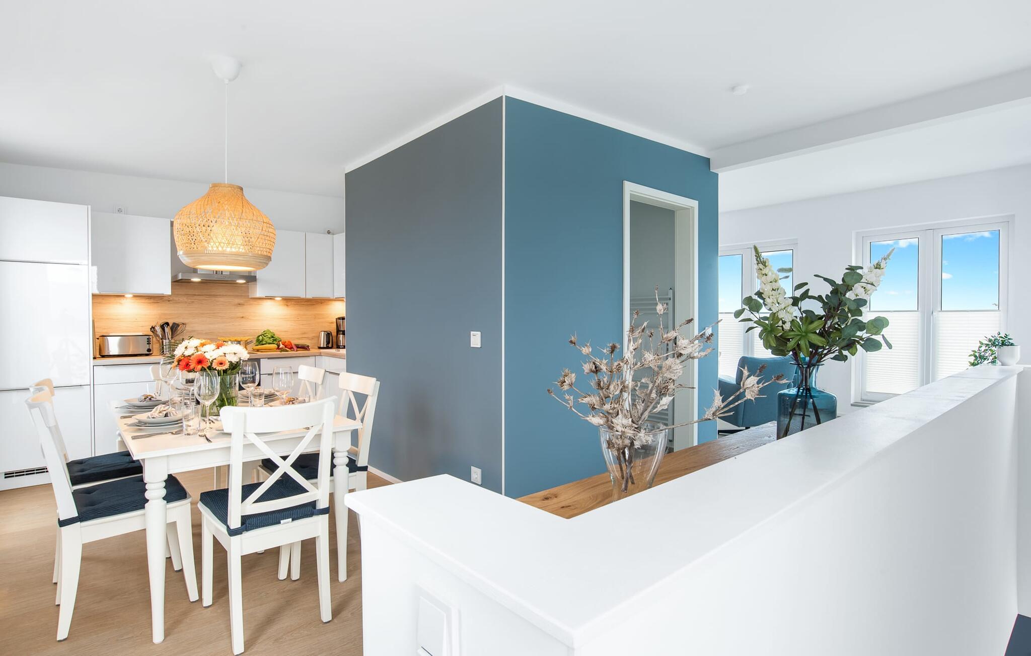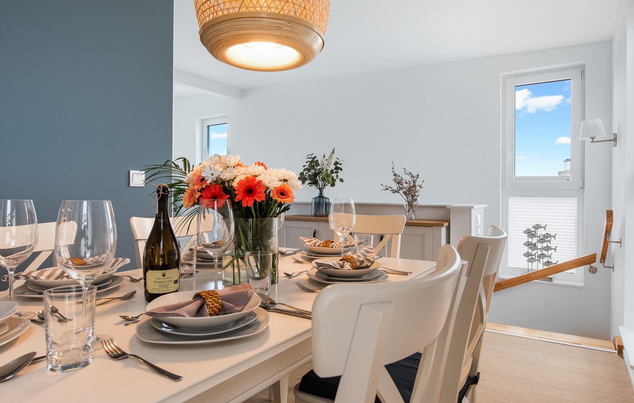 Die großzügige Maisonette-Ferienwohnung STRANDDECK für 6 Personen liegt im ersten und zweiten Obergeschoss und bietet einen direkten Blick auf die Naturschutz-Salzwiesen und Felder.