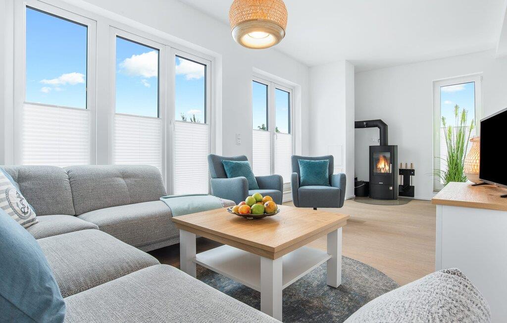 Im zweiten Obergeschoss angekommen, macht STRANDDECK dem Namen alle Ehre. Hochwertig im Landhausstil mit maritimen Elementen eingerichtet werdet ihr von einer bodentiefen Fensterfront mit der angrenzenden Terrasse und Blick auf die Naturschutz-Salzwiesen empfangen. Eintreten und sich sofort Zuhause fühlen ist eins. Auf der Wohnlandschaft mit Kuschelfaktor zu entspannen, aus dem Fenster die Ruhe der Natur genießen oder fernsehen ist Entspannung und Erholung pur! Der Alltag entrückt immer mehr... Sollte das Wetter sich einmal von der nordischen Seite zeigen, sorgt der Kaminofen mit seinem prasselnden Feuer für weitere Behaglichkeit.