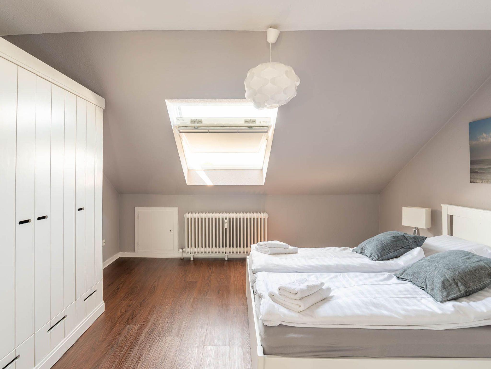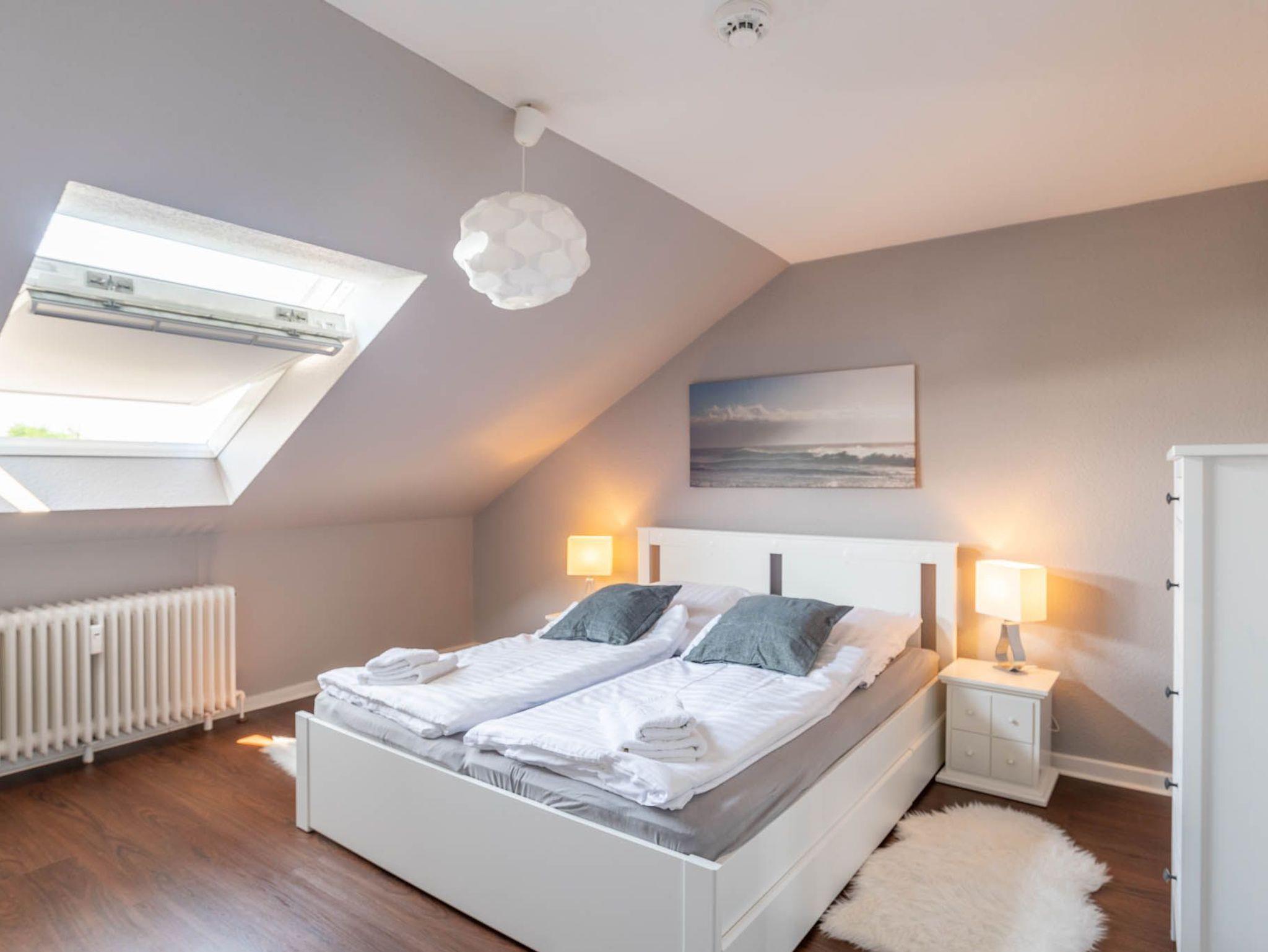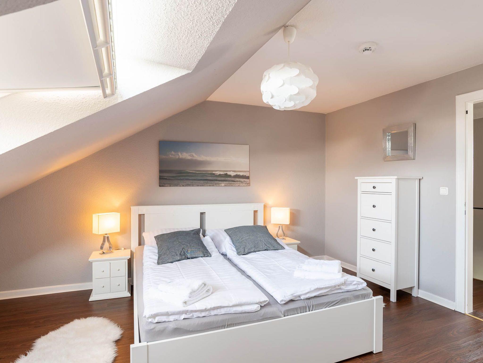 Für den erholsamen Schlaf stehen im oberen Geschoss zwei separate Schlafzimmer zur Verfügung. Sie gelangen über die Holztreppe im Wohnzimmer ins obere Stockwerk. Das größere Schlafzimmer wirkt durch die weißen Möbel hell und einladend. Nachtschränkchen, der Kleiderschrank sowie die Kommode runden die cleane Einrichtung ab. Das Veluxfenster in der Dachschräge lässt sich mit einer Jalousie abdunkeln. Neben dem Doppelbett mit den Maßen 160x200 cm, befindet sich im anderen Schlafzimmer ein weiteres Bett mit der Größe 140x200 cm.