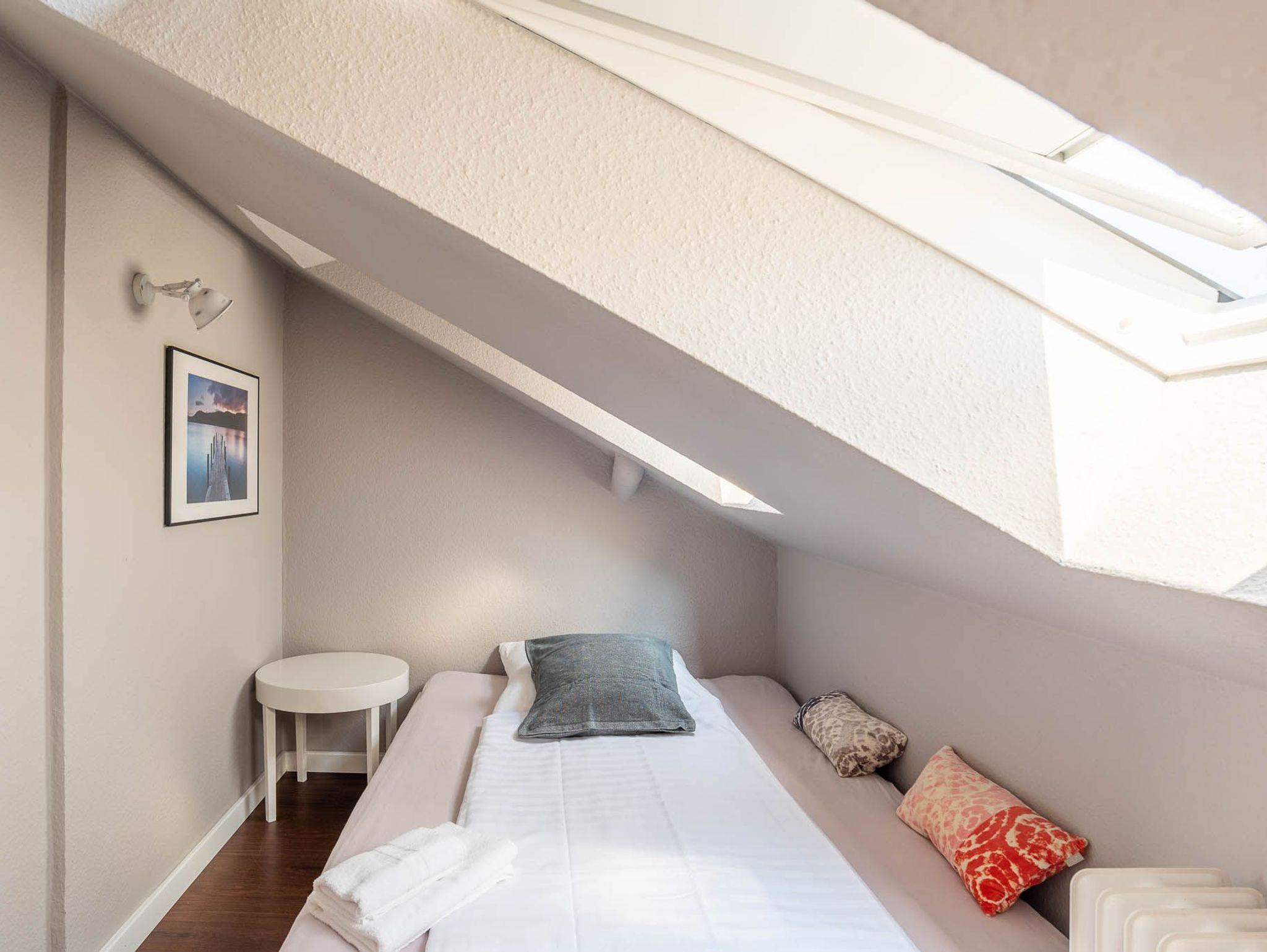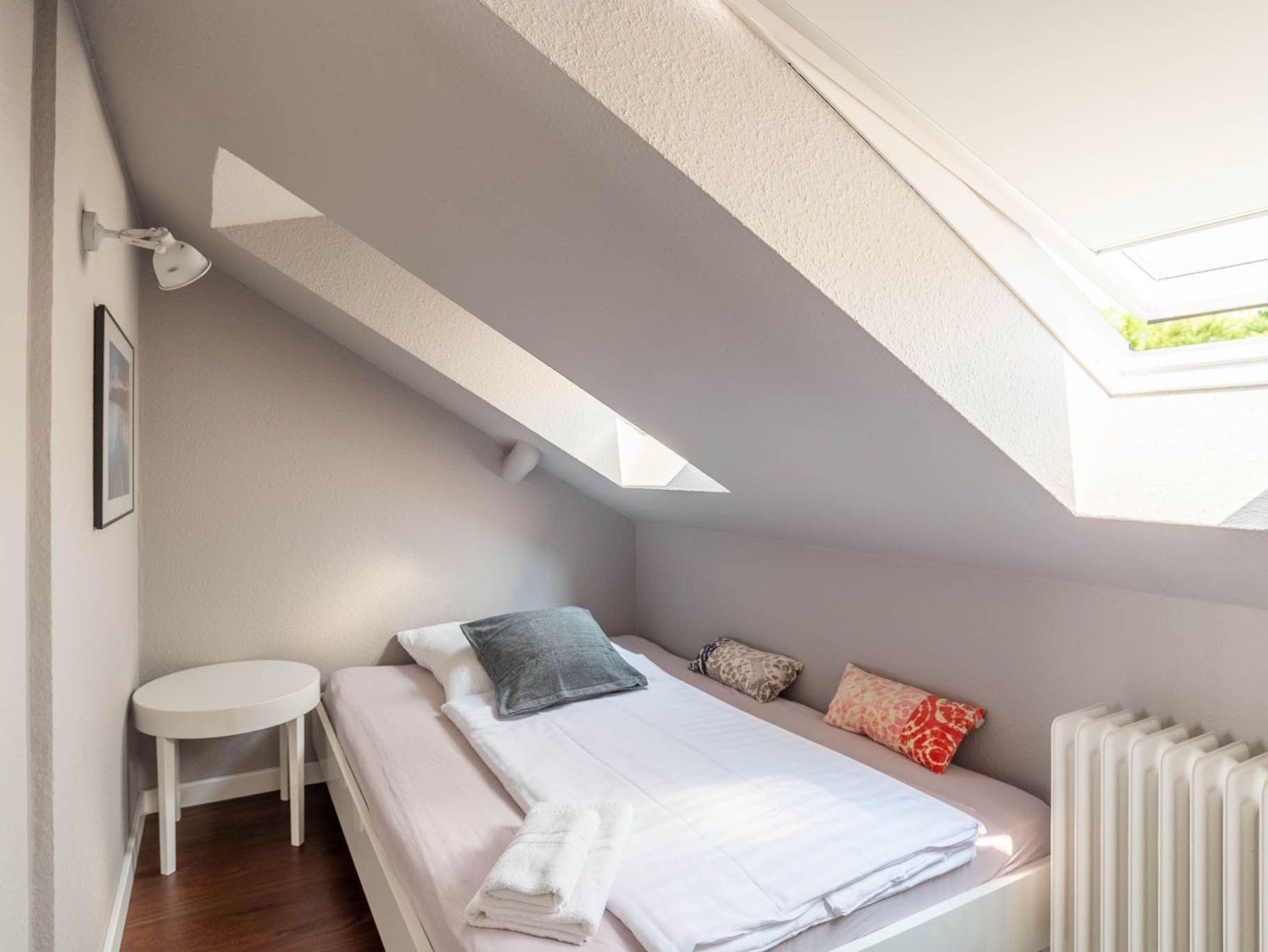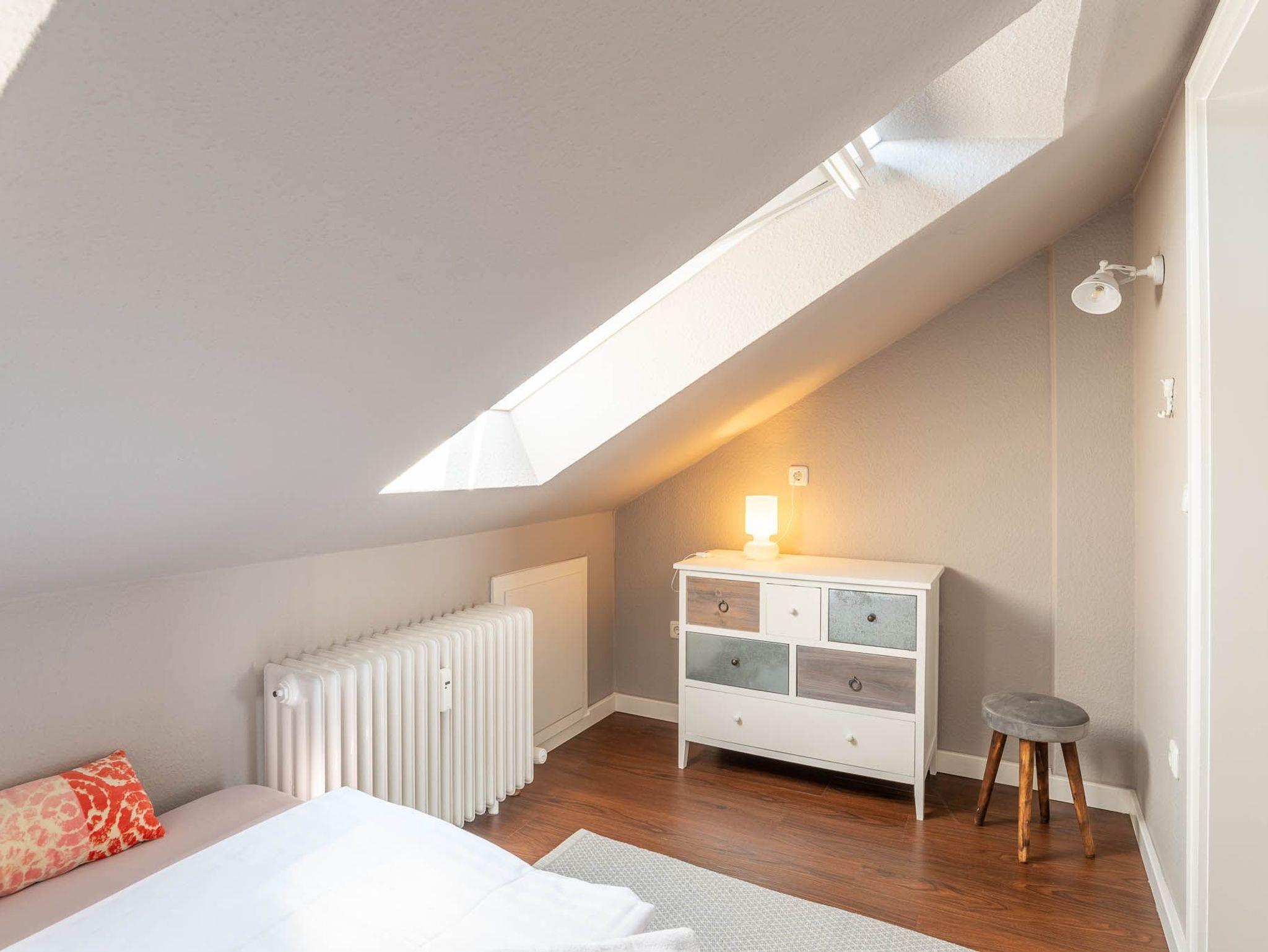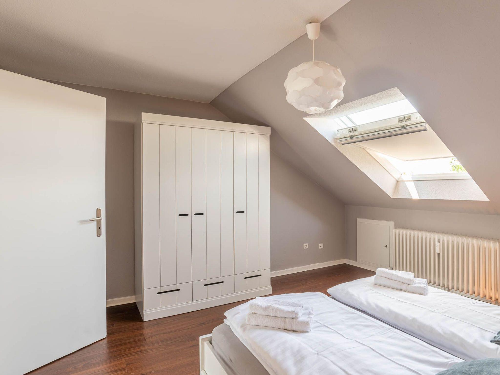 Für den erholsamen Schlaf stehen im oberen Geschoss zwei separate Schlafzimmer zur Verfügung. Sie gelangen über die Holztreppe im Wohnzimmer ins obere Stockwerk. Das größere Schlafzimmer wirkt durch die weißen Möbel hell und einladend. Nachtschränkchen, der Kleiderschrank sowie die Kommode runden die cleane Einrichtung ab. Das Veluxfenster in der Dachschräge lässt sich mit einer Jalousie abdunkeln. Neben dem Doppelbett mit den Maßen 160x200 cm, befindet sich im anderen Schlafzimmer ein weiteres Bett mit der Größe 140x200 cm.