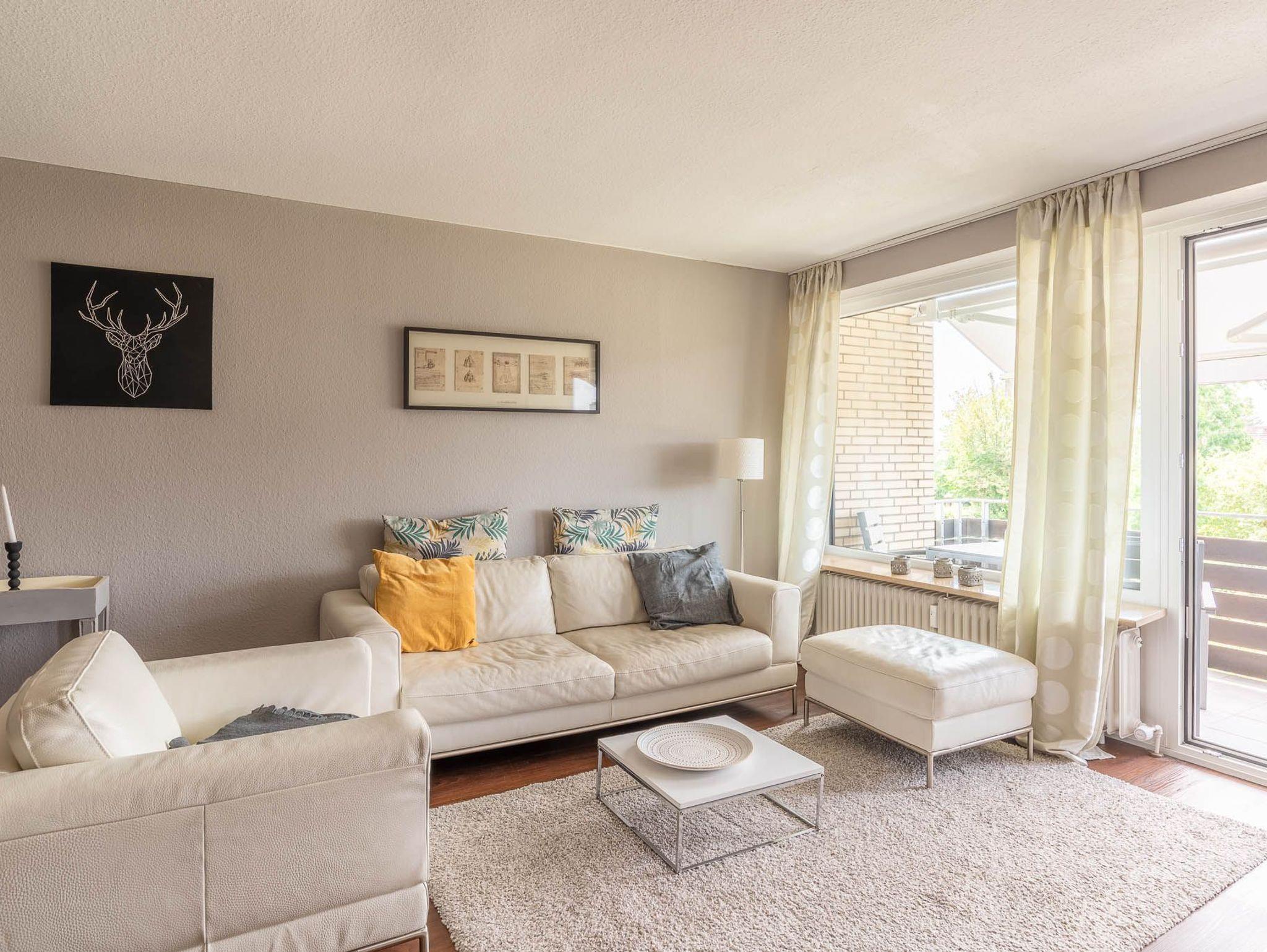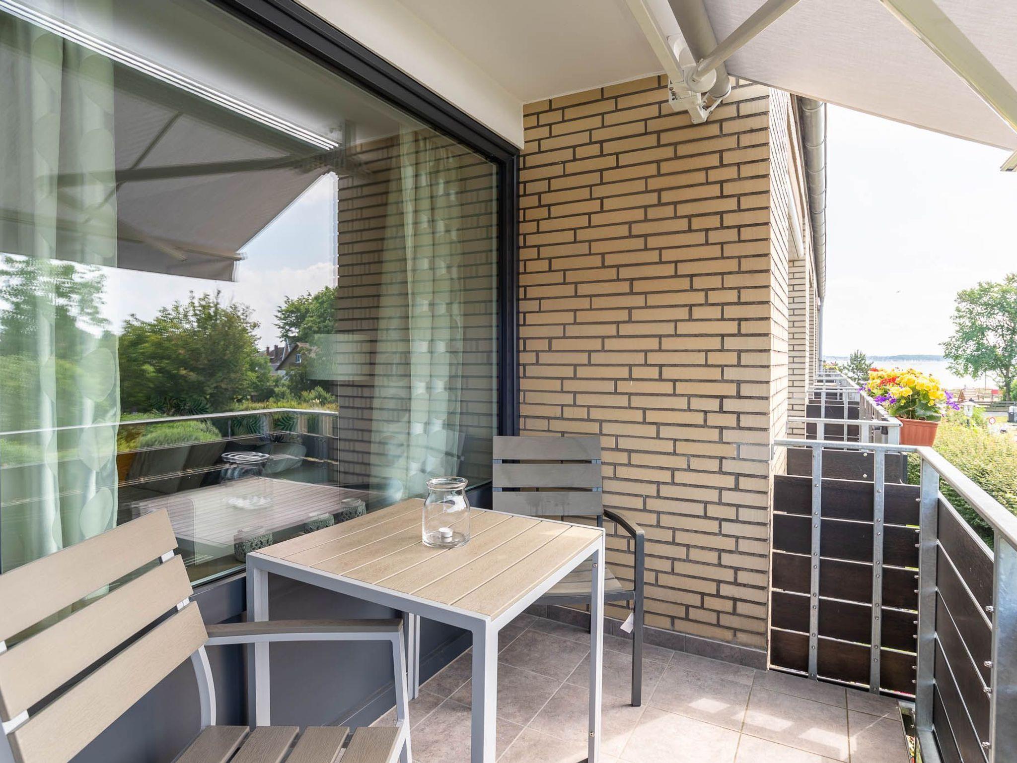 Treten Sie direkt aus dem Wohnzimmer auf den Südwest-Balkon und genießen Sie den traumhaften Ausblick. Denn von dort aus blicken Sie in Richtung Schilksee und auf die Kieler Förde. Auf dem Balkon stehen Balkonmöbel und eine ausfahrbare Markise zur Verfügung.