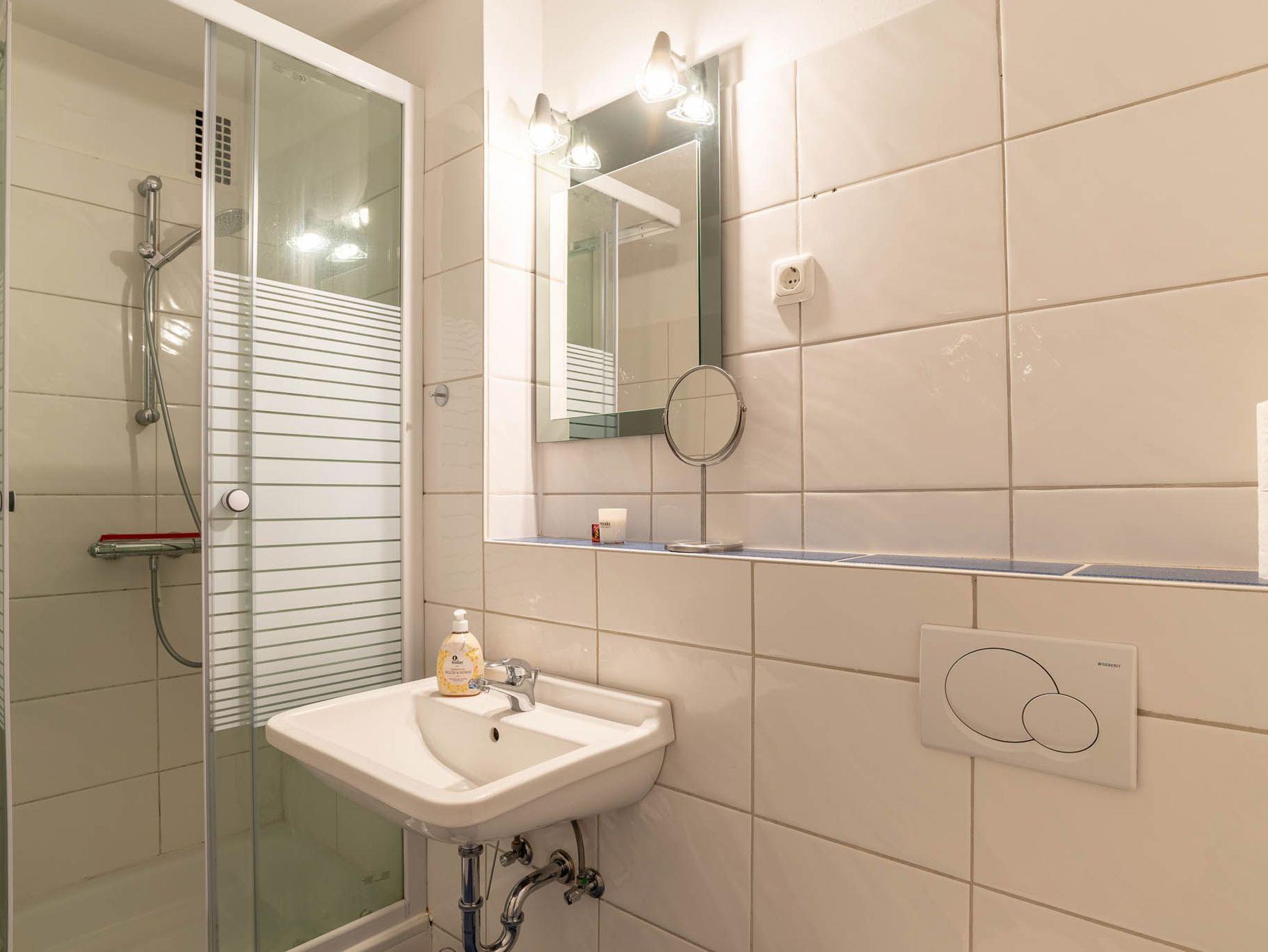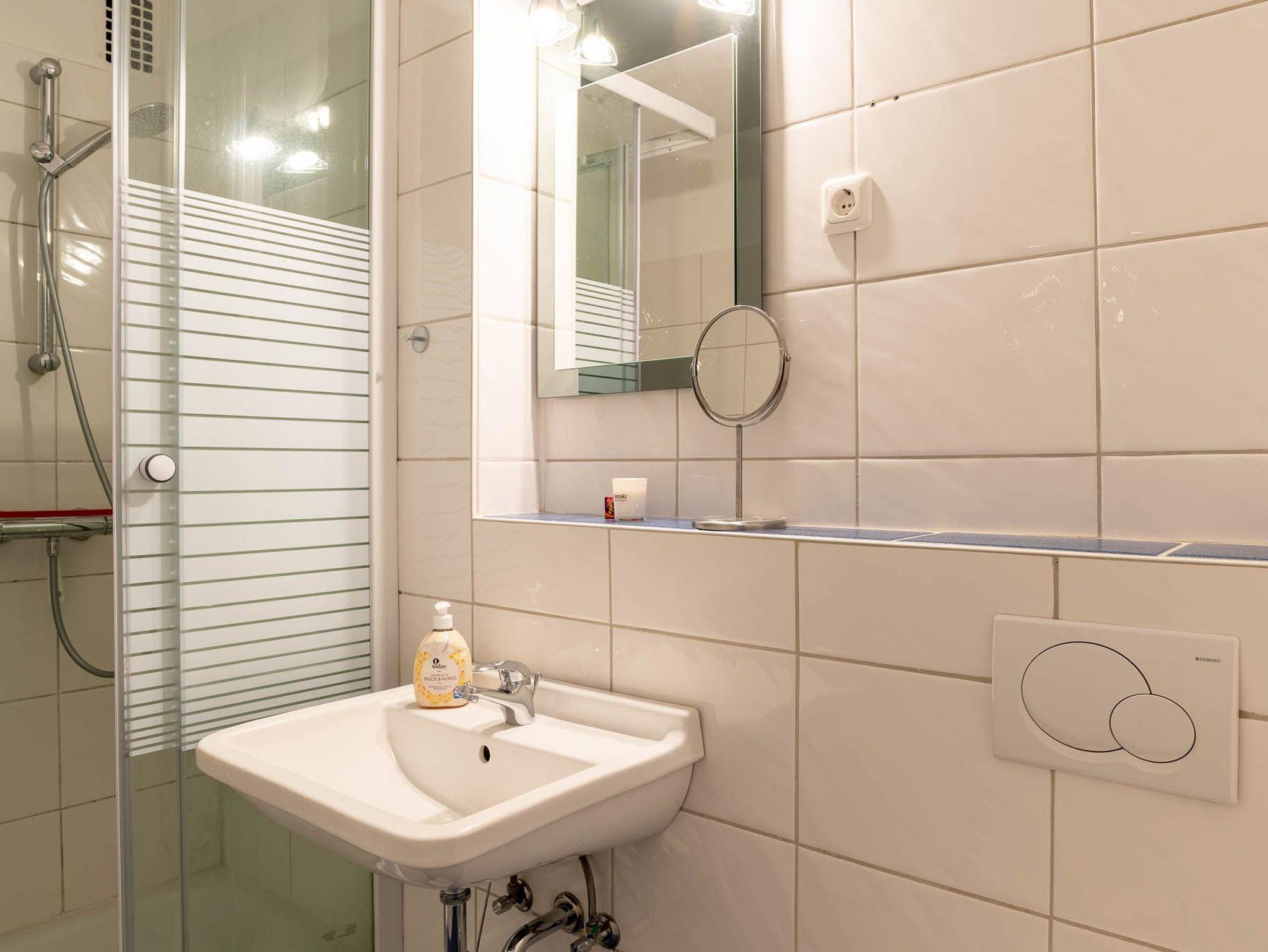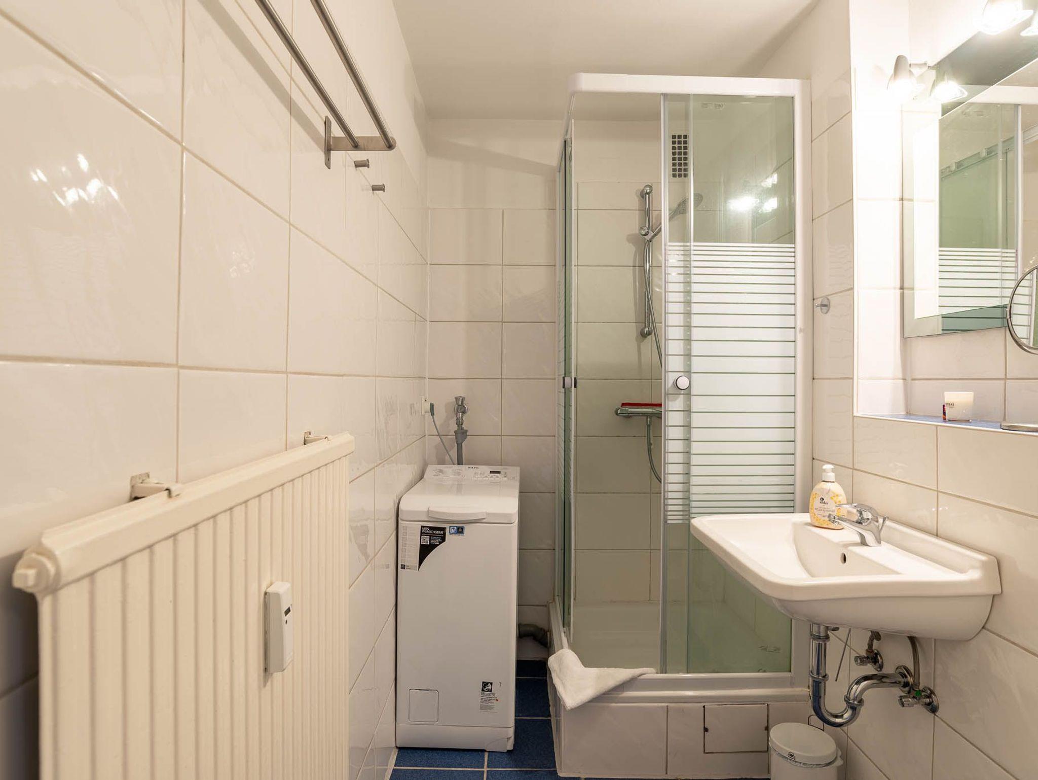 Das helle Badezimmer verfügt über eine Eckdusche, ein Waschbecken mit WC und einer kleinen Waschmaschine.