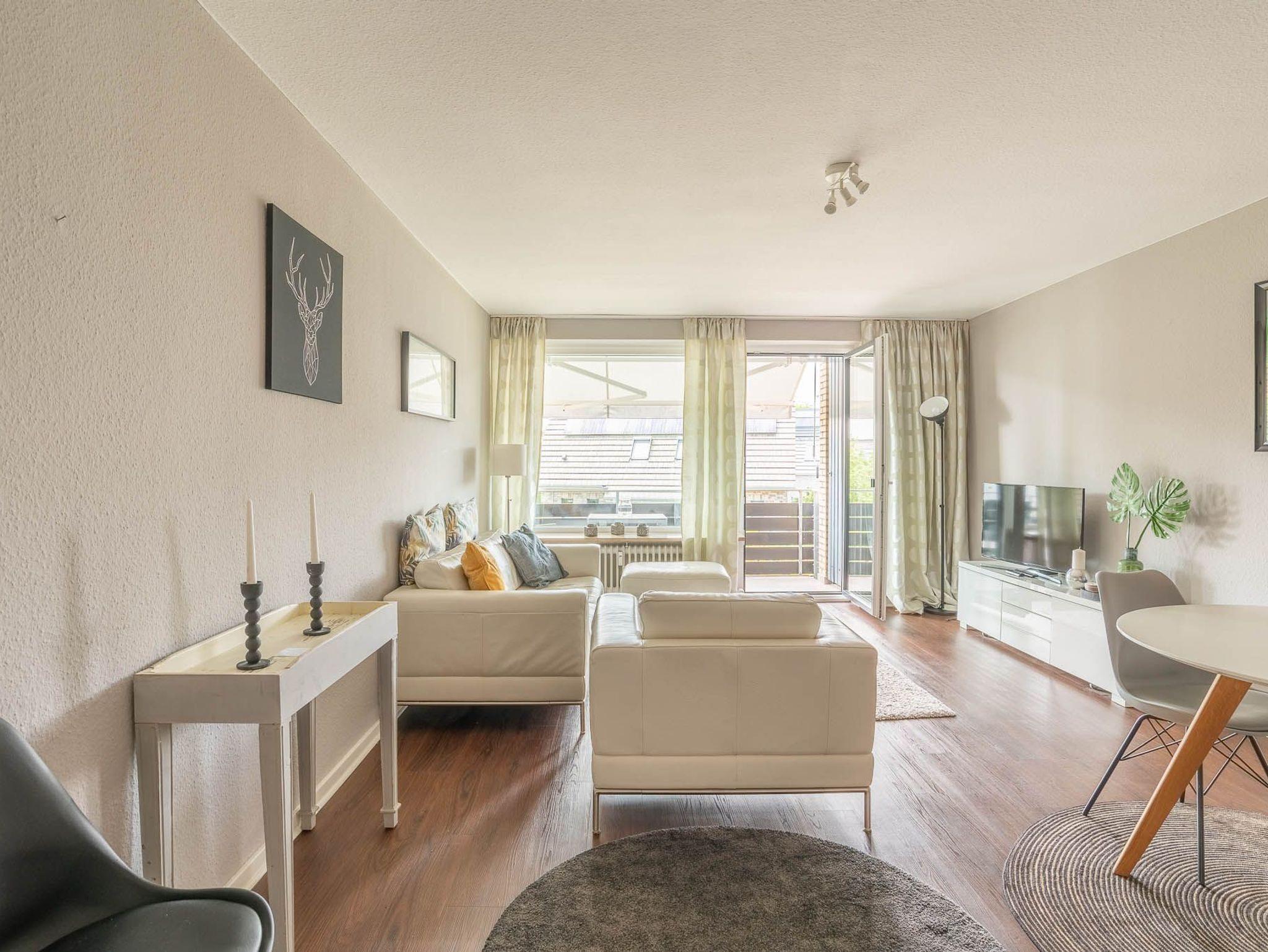 Das Wohnzimmer wirkt durch die bodentiefe Fenster und dem angrenzenden Balkon sehr hell und freundlich. Zwei Couchelemente und ein großer Fernseher laden zum Verweilen ein. In der gesamten Wohnung steht Ihnen kostenloses WLAN zur Verfügung. Der Essbereich besteht aus einem runden Esstisch und vier Stühlen. Das Zimmer lässt dich mit Vorhängen abdunkeln.
