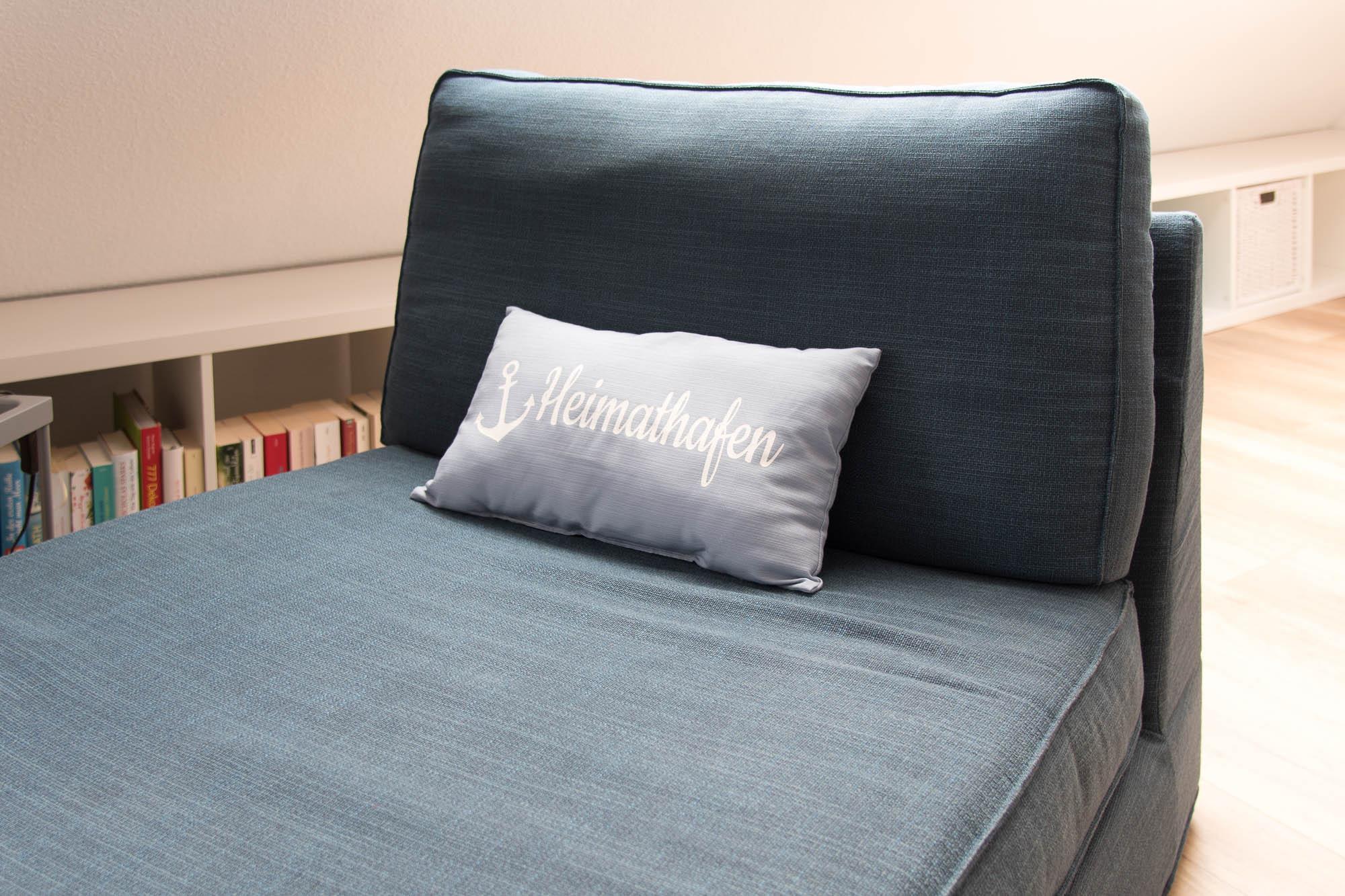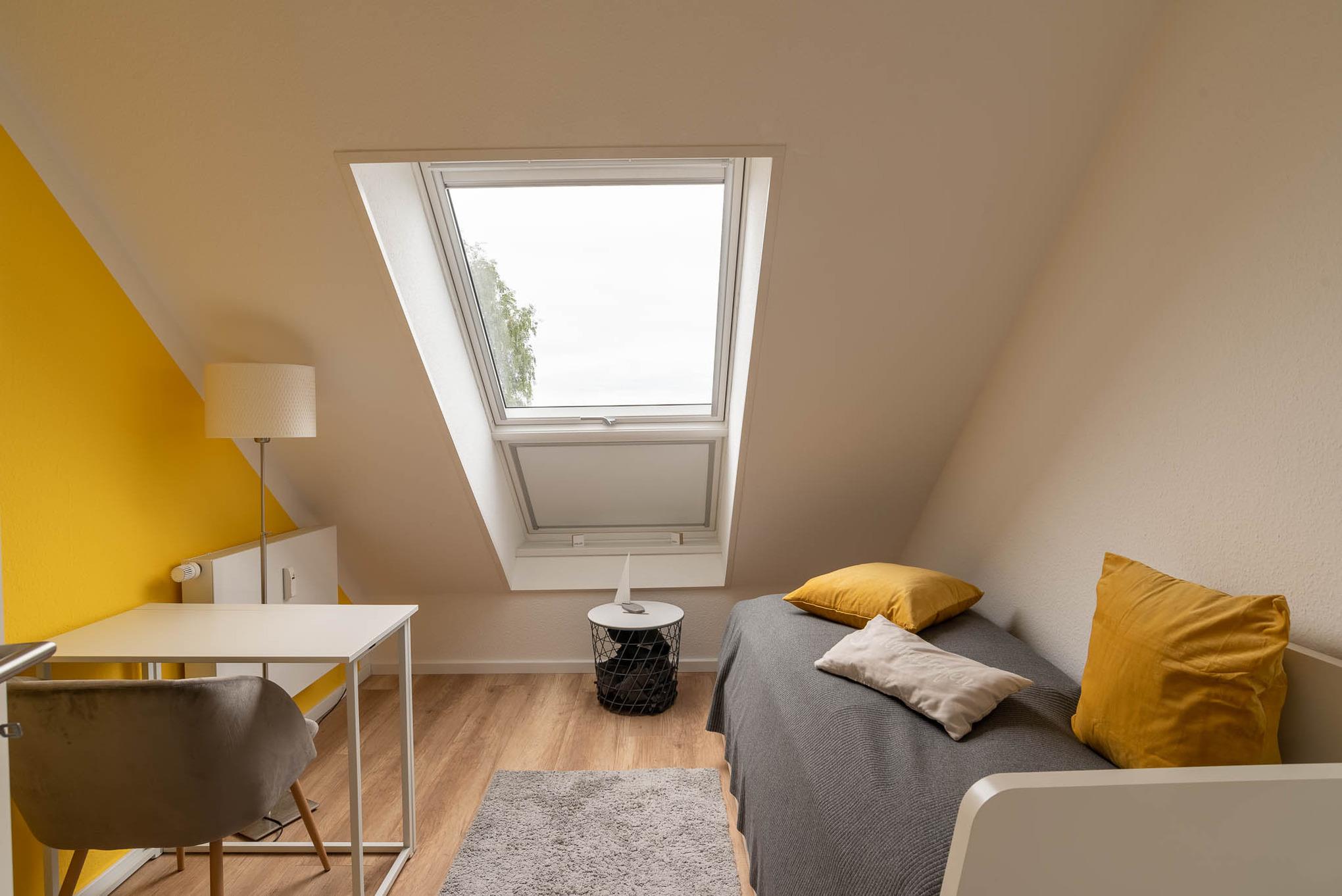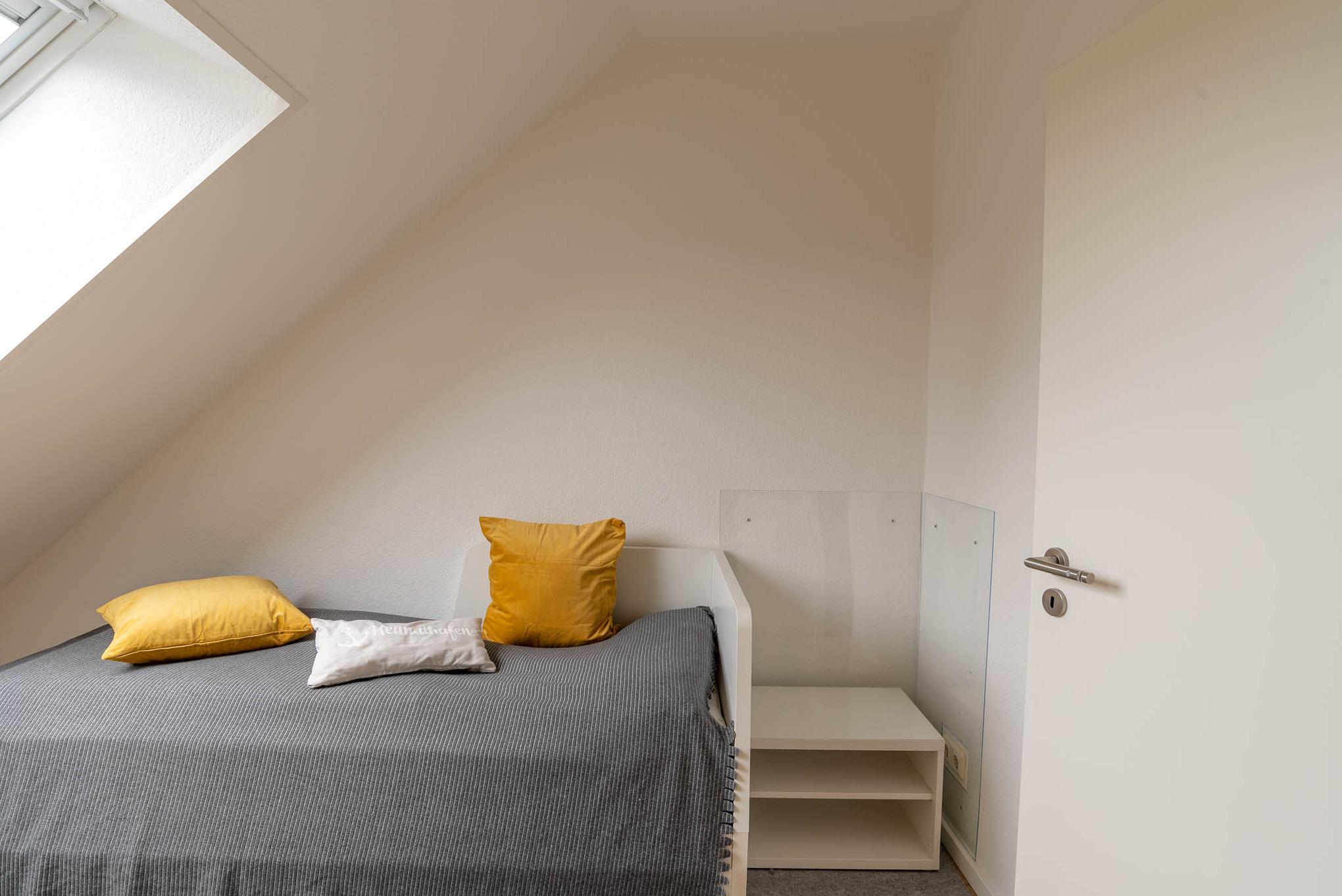 Schlafzimmer Koje II beherbergt ein schönes Tagesbett (80 x 200 cm), dass auch hervorragend als Rückzugsort am Tage genutzt werden kann. Ein kleiner Tisch mit Lampe, ein bequemer Stuhl und ein Regal unter der Dachschräge mit großen Lichtband runden auch hier die Einrichtung ab und laden zum gemütlichen Lesen mit Panoramablick ein. Das Tagesbett ist auch mit einer Auszieh-Funktion ausgestattet und kann in ein vollwertiges Doppelbett (160 x 200) schnell und einfach umgebaut werden. In der Ausziehfunktion ist auch dieser Raum für 2 Schlafplätze geeignet - dann aber schon etwas beengt.