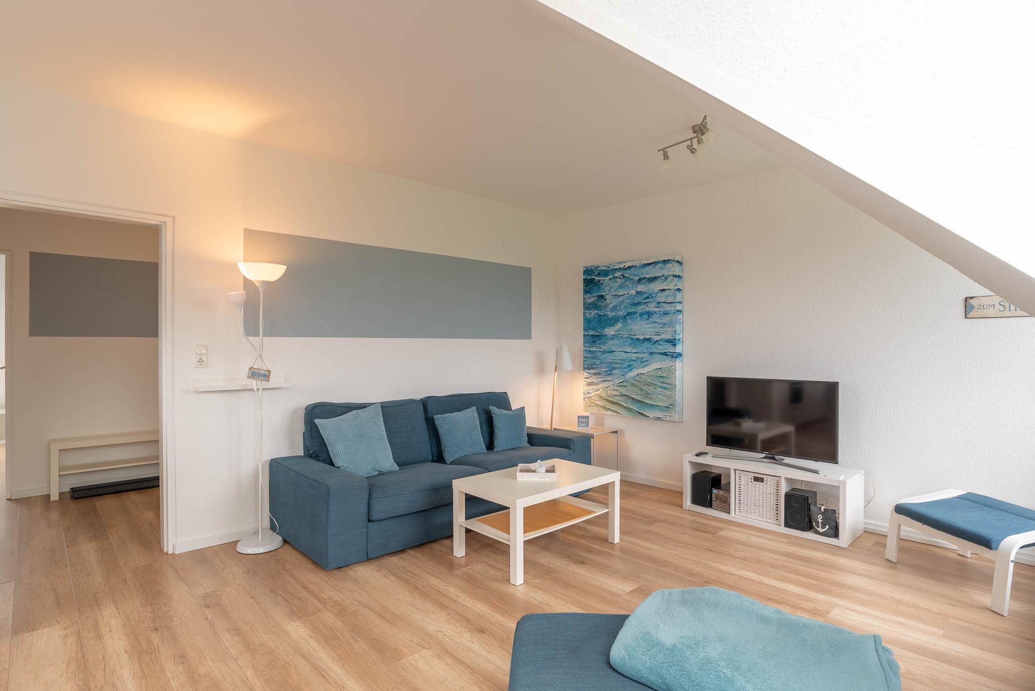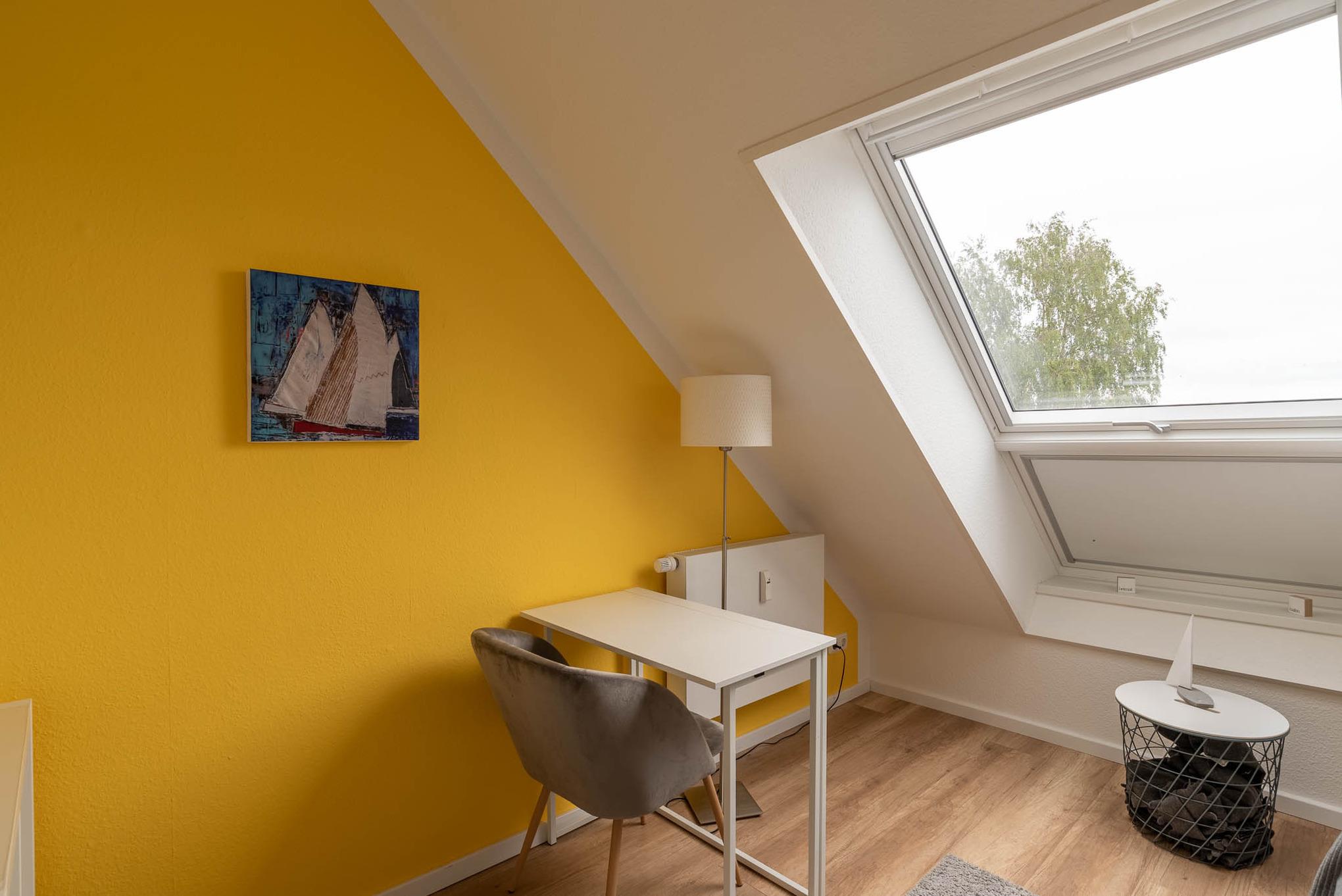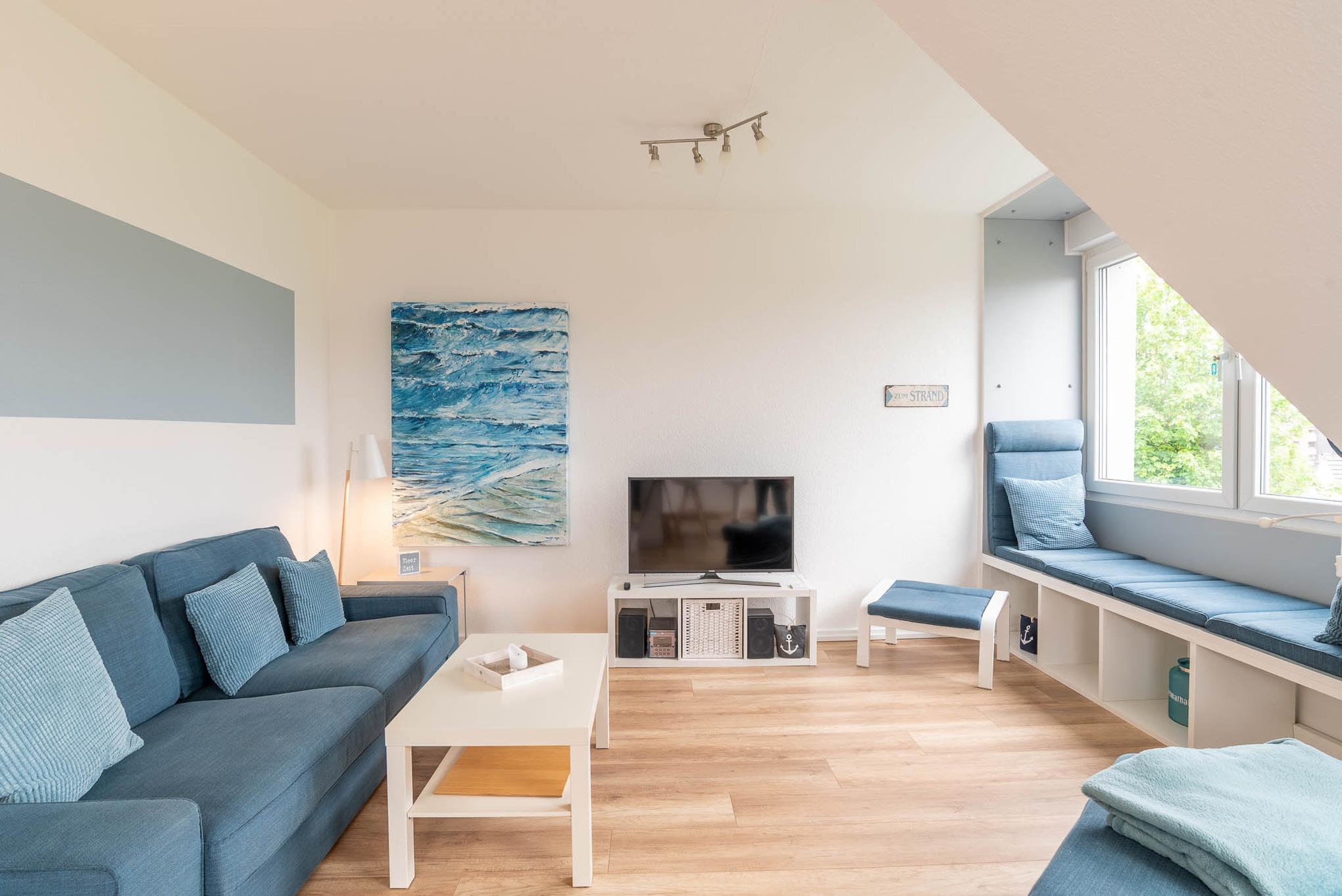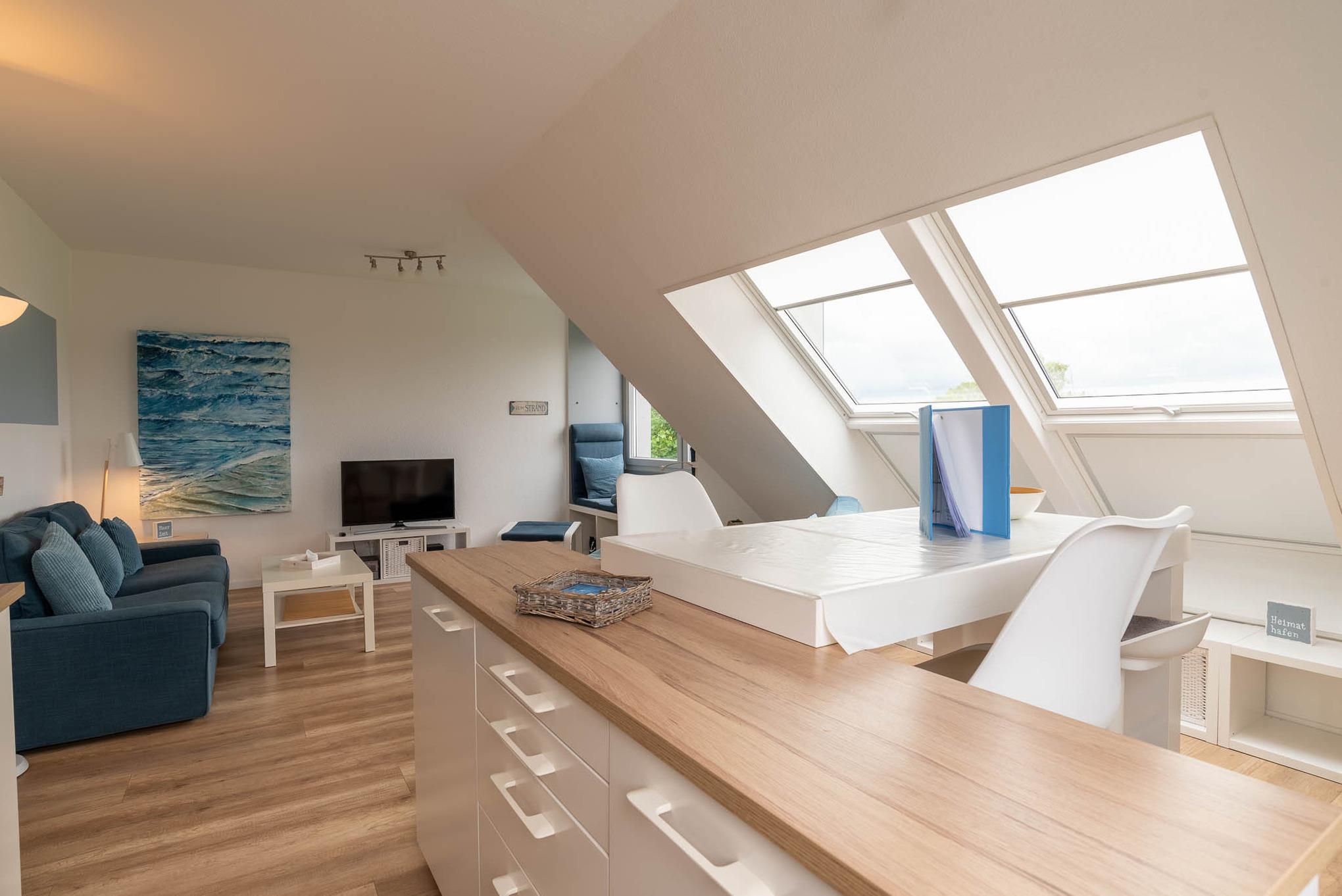 Im lichtdurchfluteten Wohnzimmer sind die großen Gauben Fenster und die Dachfenster nach Süden ausgerichtet. Hier hat man ab frühen Mittag ein wunderbar sonniges Plätzchen auf der exklusiv gestalteten Fenstersitzbank mit tollem Förde Blick bis zum Yachthafen Schilksee und kann sich bei offenem Fenster windgeschützt sonnen. Diese Fensterbank lädt einfach zum Tagträumen ein. Bei schlechtem Wetter lädt die großzügige Couch und der Flachbild-Fernseher zu entspannten Stunden ein oder das kostenlose Internet zum Surfen.