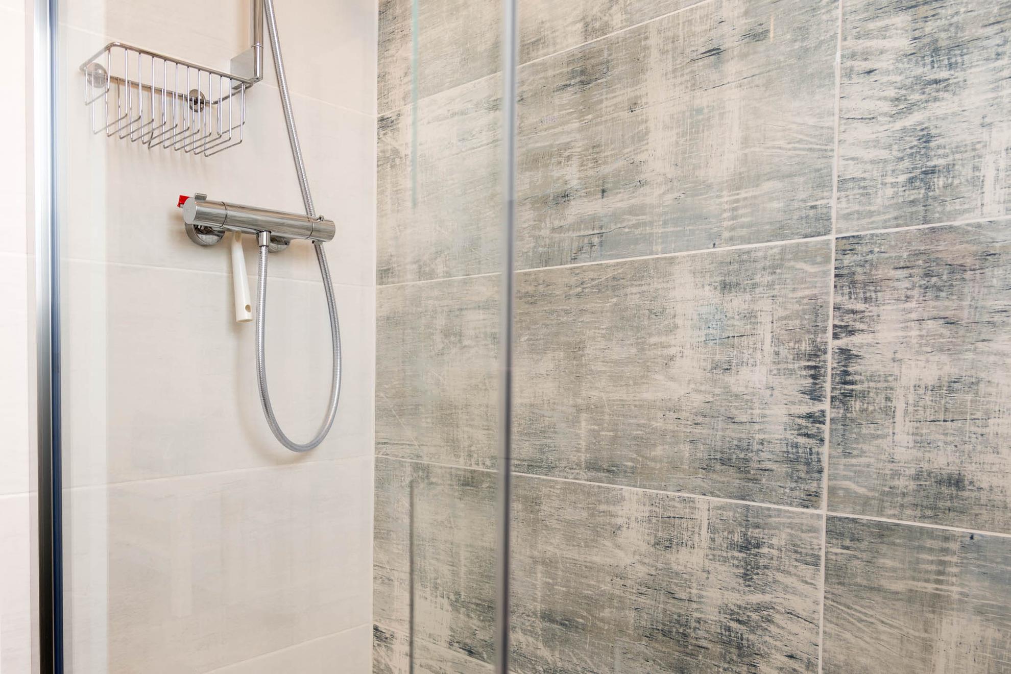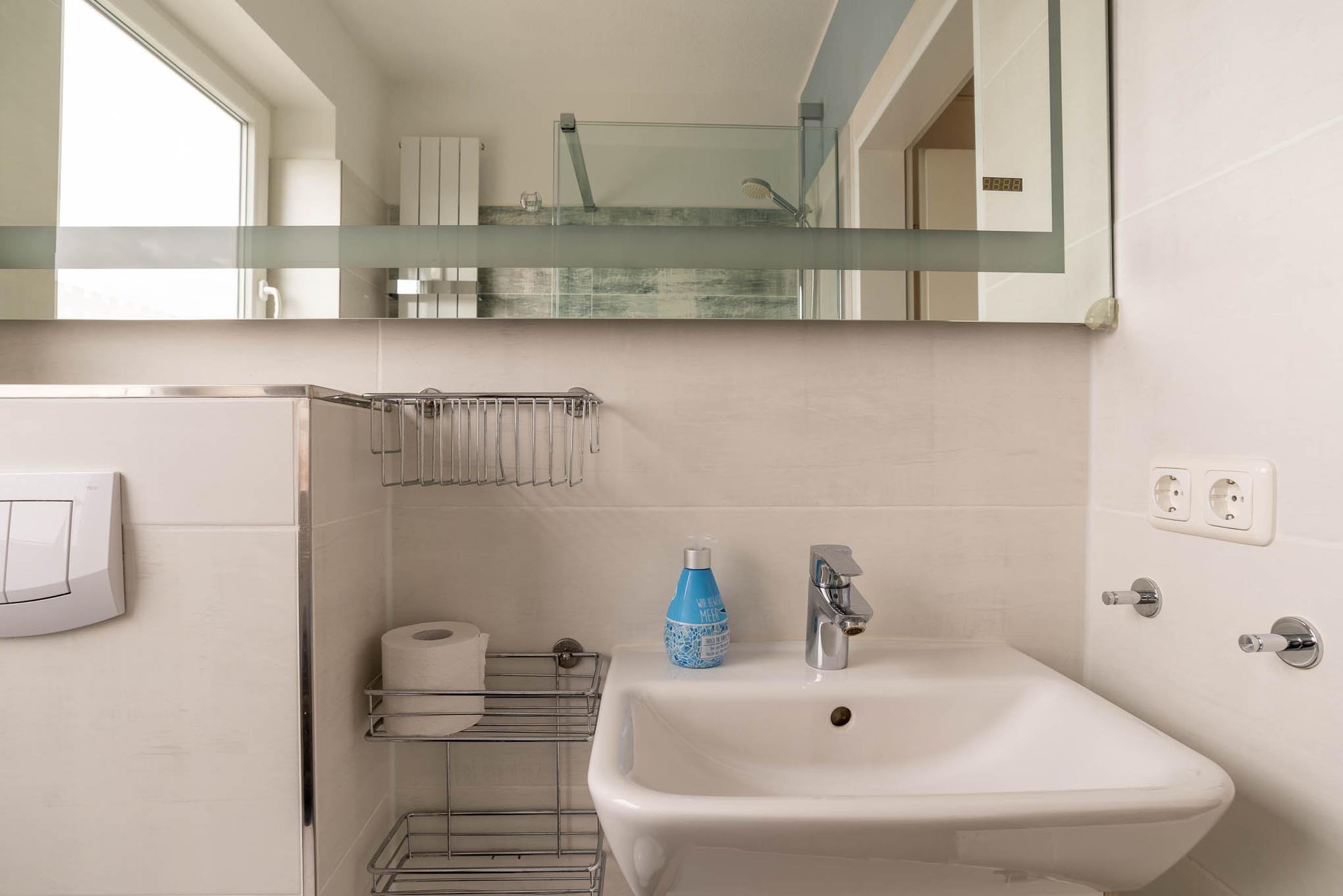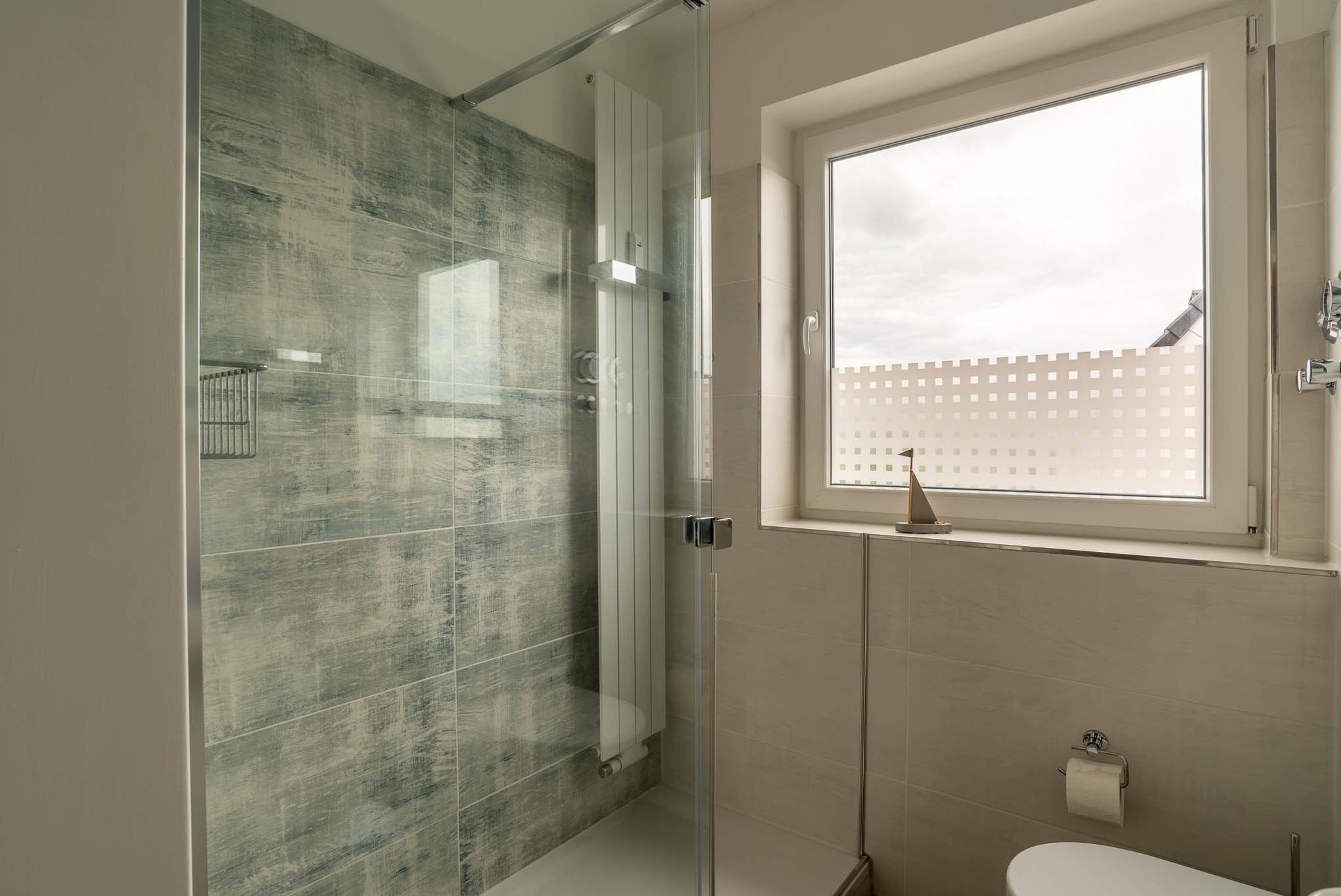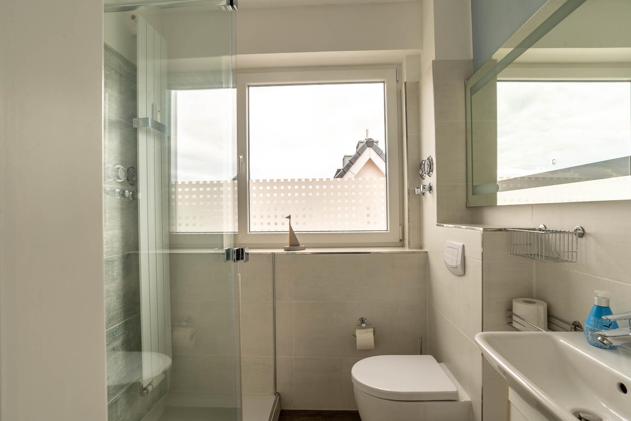 Das kleine Badezimmer wurde völlig neu und hochwertig gestaltet. Die große Walk-In-Dusche auf 160 cm Länge mit hochwertiger Glasschiebetür ist mit besonderen Struktur Dekorfliesen gestaltet, die den Charakter der Ostsee farblich durch Meeresblau und Sandtönen wiedergeben. Außerdem gibt es einen großen 140 cm breiten Wandspiegel mit Licht und eine Handtuchheizung. Ein Föhn ist natürlich ebenfalls vorhanden. Das Bad verfügt auch über ein großes Fenster und ist sehr hell.