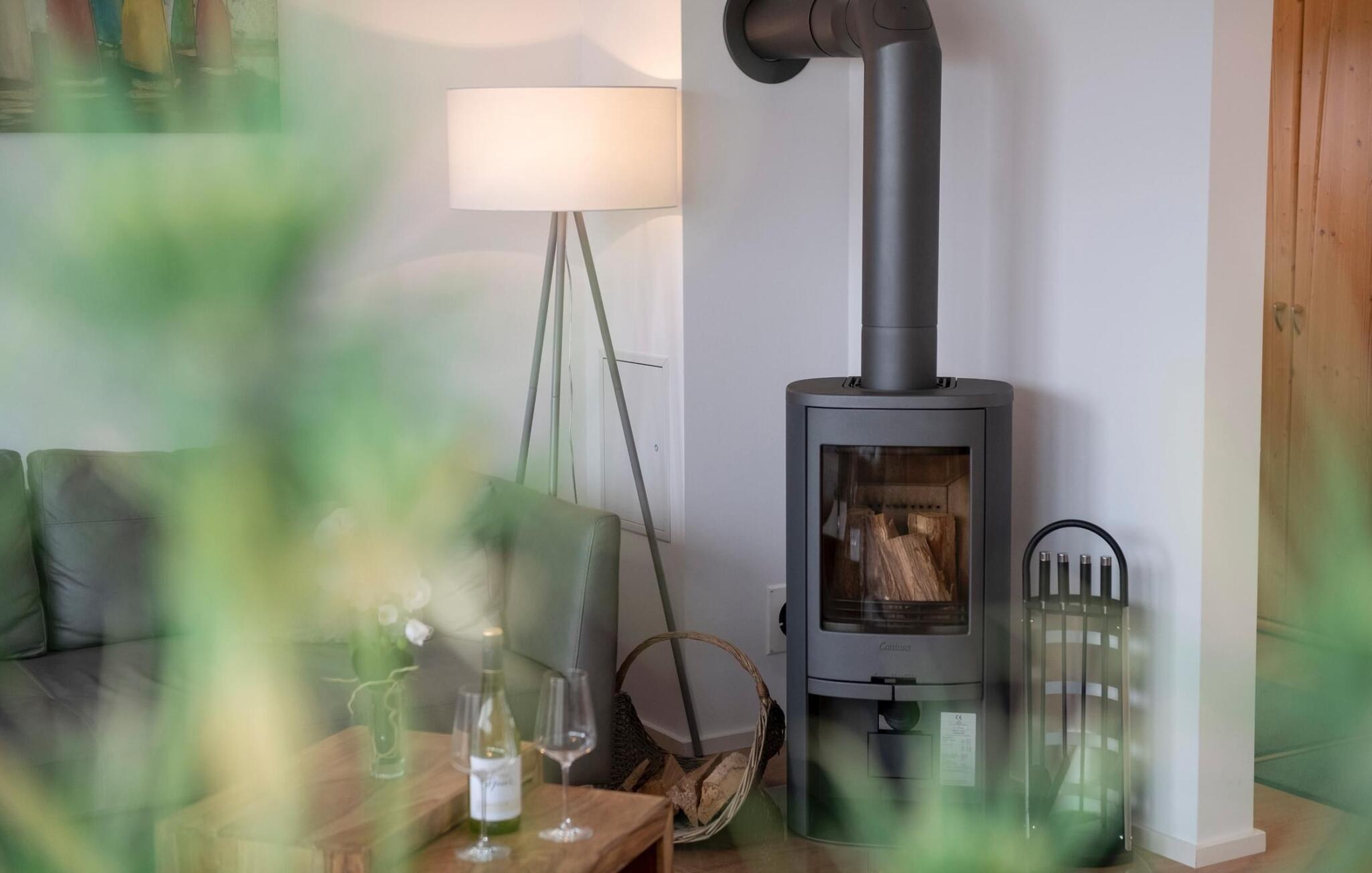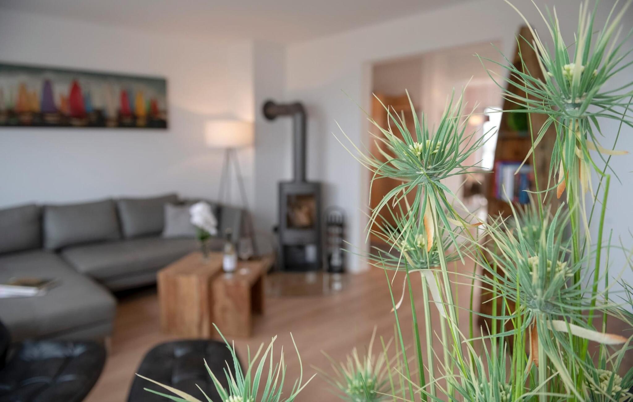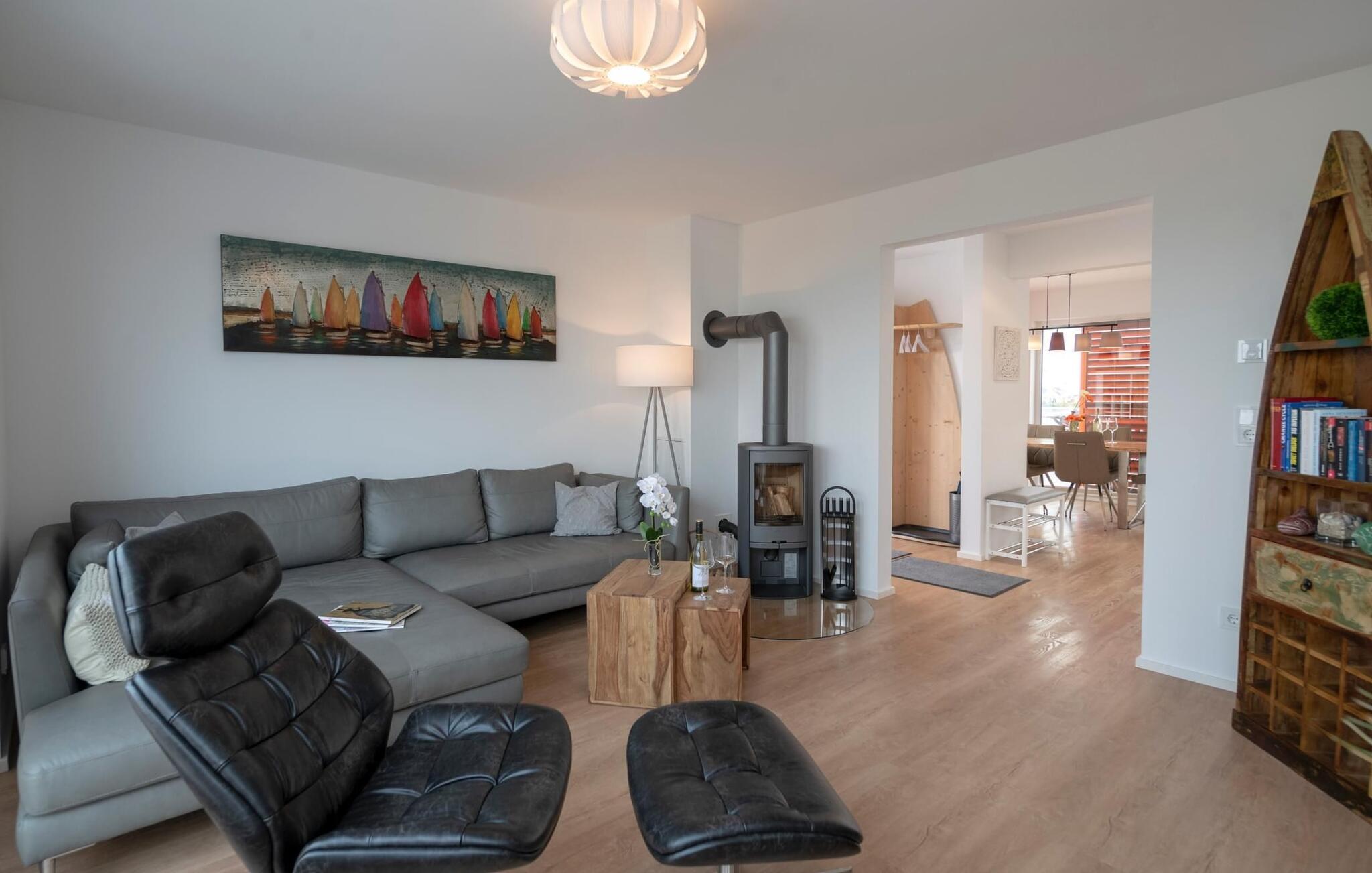 Kuschelig wird es im Wohnzimmer, denn hier lädt eine gemütliche Sitzlandschaft auch an nordischen Schietwettertagen zu einem Kaminabend ein.