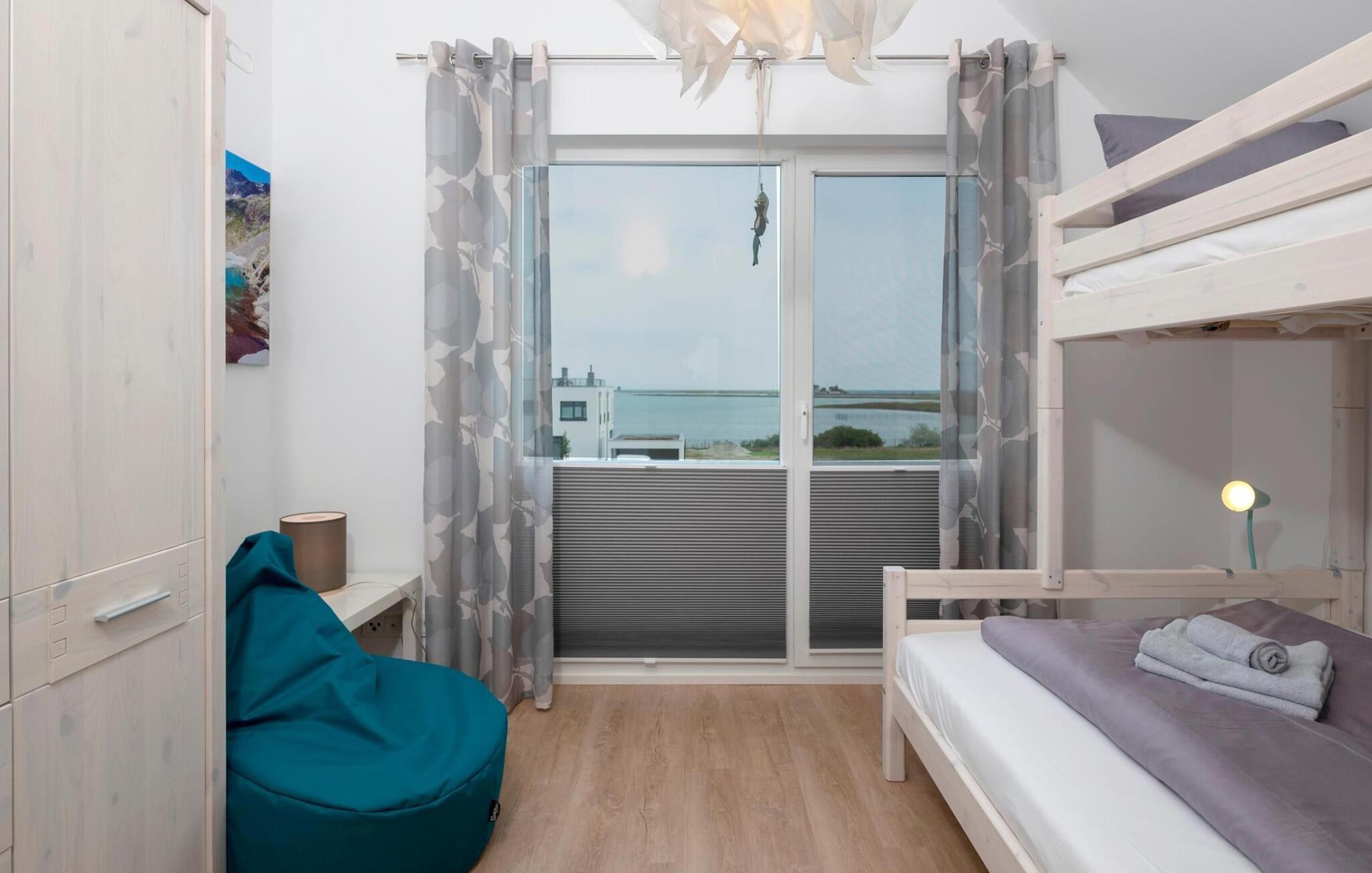 Auf der zweiten Ebene befindet sich der Ruhebereich des Ferienobjekts. Das Hauptschlafzimmer verfügt über einen traumhaften Hafenblick. Einschlafen unter Sternen, ein Dachfenster erlaubt nicht nur den Blick in den Sternenhimmel, sondern auch in traumhafte Wolkenformationen, die so charakteristisch sind für den Norden. Drei weitere Schlafplätze stehen im zweiten Schlafzimmer mit Blick auf den Ostseefjord Schlei bereit. Hier lädt ein kuscheliges, extragroßes Etagenbett (Liegefläche unten: 140 cm, Liegefläche oben: 90 cm) zum Schlafen ein. Zusätzlich steht hier ein weiterer Fernseher zur Verfügung. Beide Schlafzimmer sind mit Verdunklungsplissees ausgestattet.
