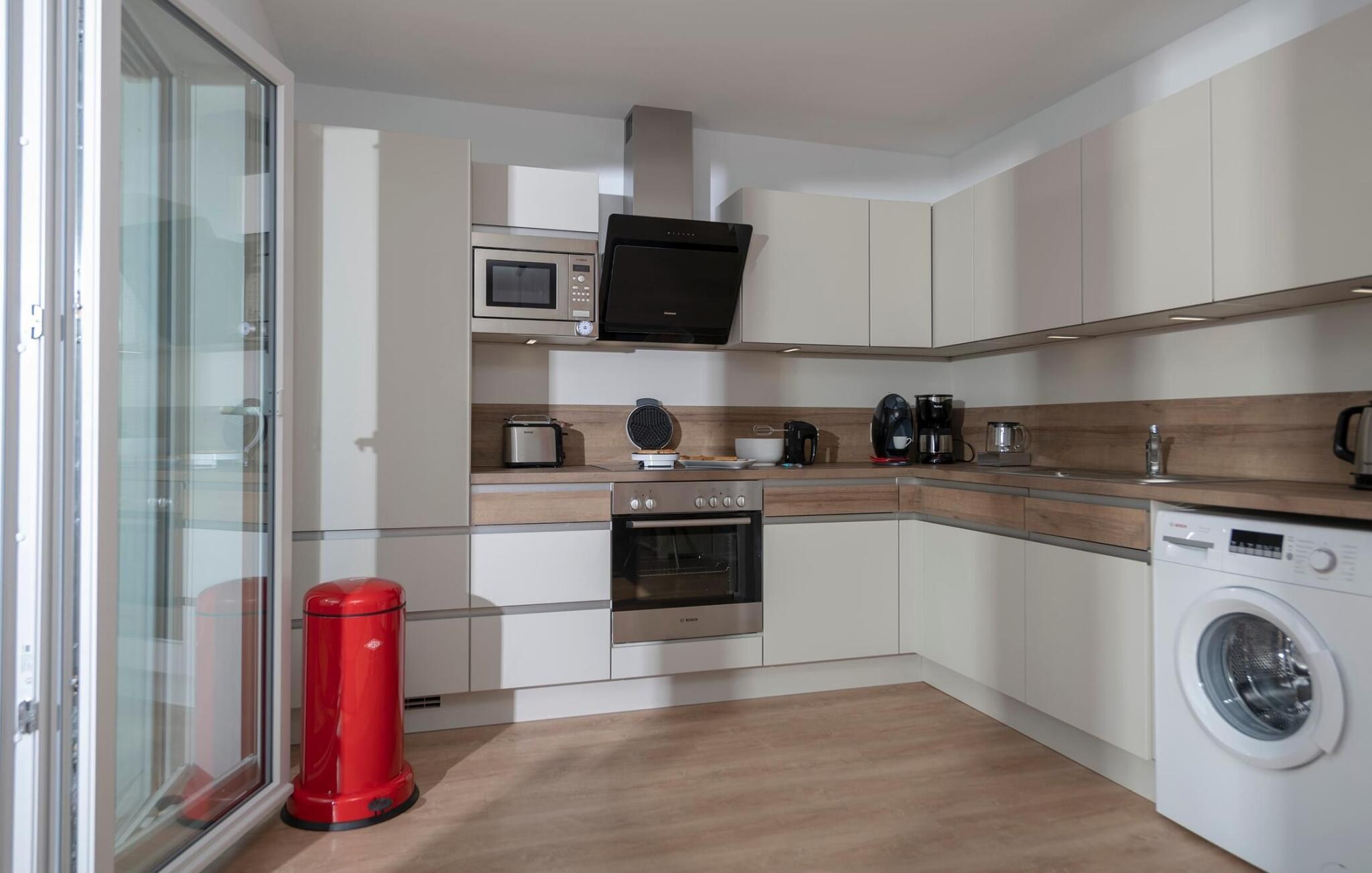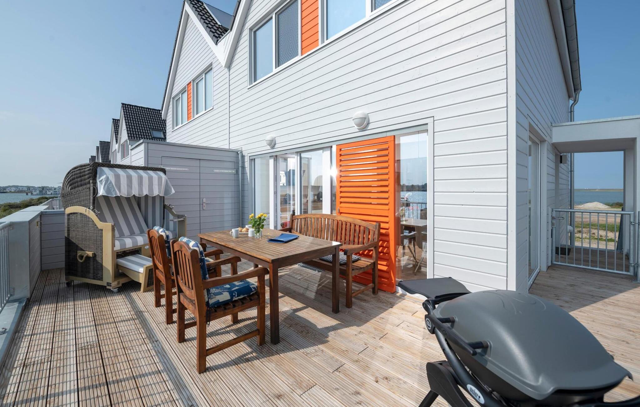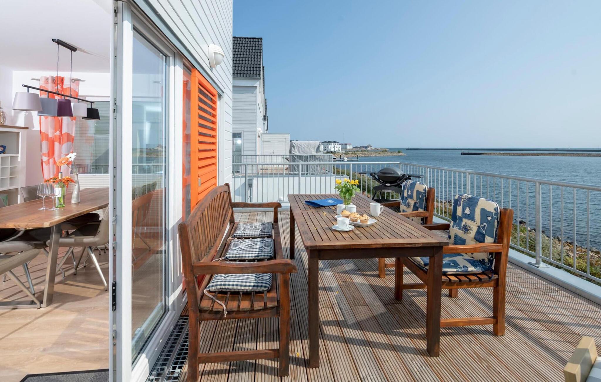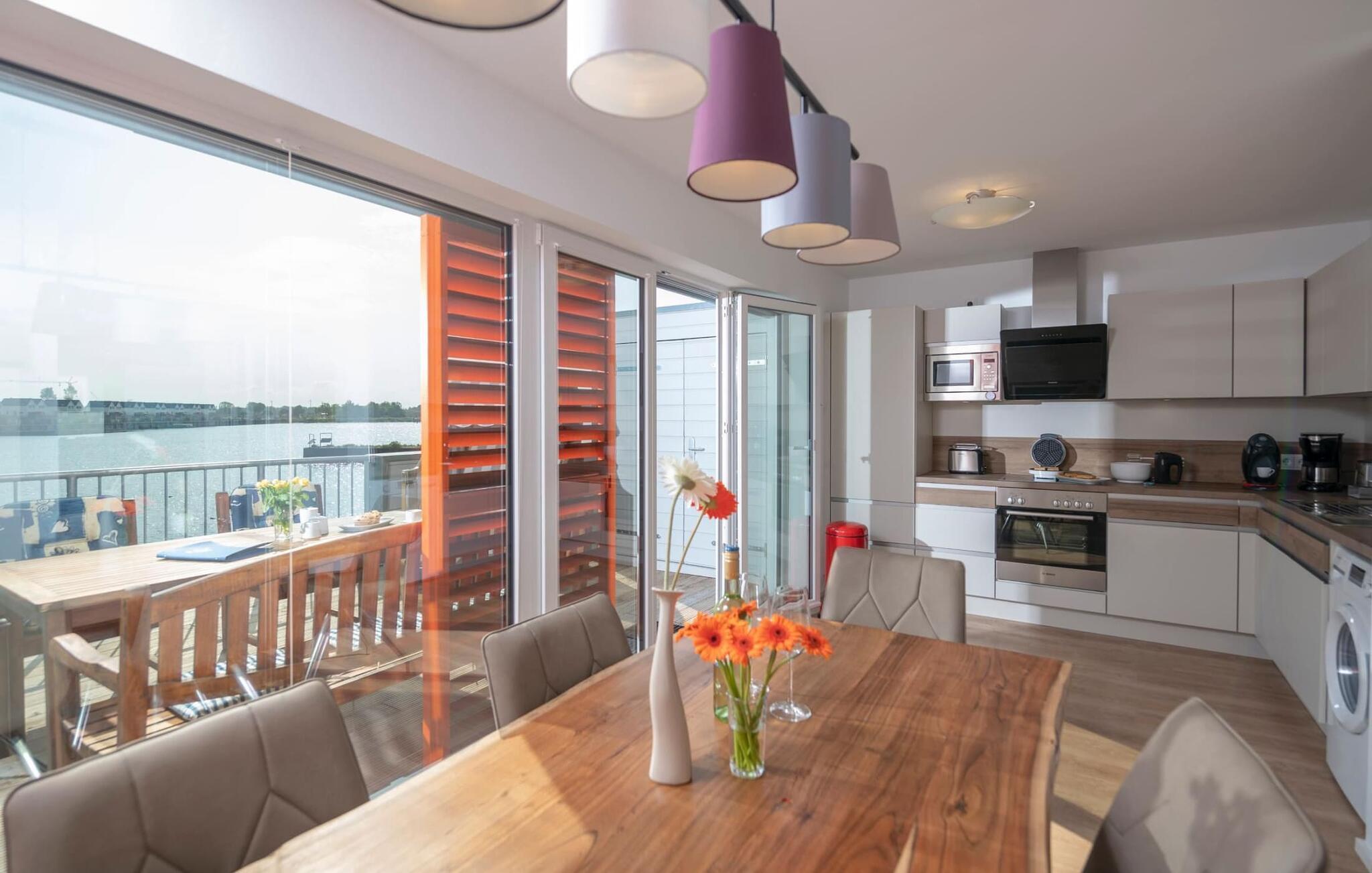 Lichtdurchflutet gestaltet sich der Wohn- und Essbereich des Ferienobjekts mit bodentiefen Panorama-Fensterfronten zu den anliegenden Terrassen auf beiden Seiten. Traumhafte Aussichten eröffnen sich auf der an den Essbereich angrenzenden Terrasse mit Blick über den Segel- und Sportboothafen des OstseeResort Olpenitz. Ob romantisches Candle-Light-Dinner oder gesellige Grillrunde, Hafenkino und traumhafte Sonnenansichten sind garantiert. Im Urlaub ist Zeit für kreatives Kochen, die rundum ausgestattete Wohnküche lässt hierbei keine Wünsche offen. Ausgestattet bis ins kleinste Detail, vom geräumigen Kühlschrank mit BioFresh-Fach, bis hin zu den Backutensilien ist alles vorhanden.