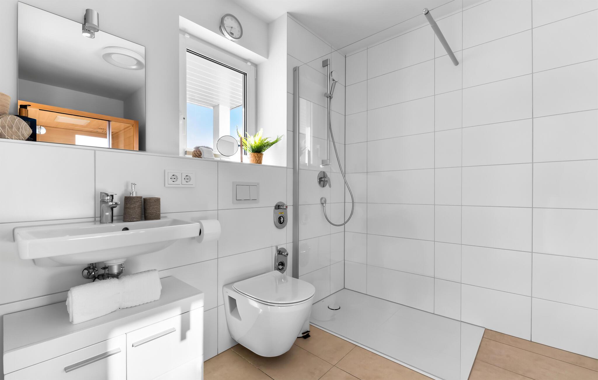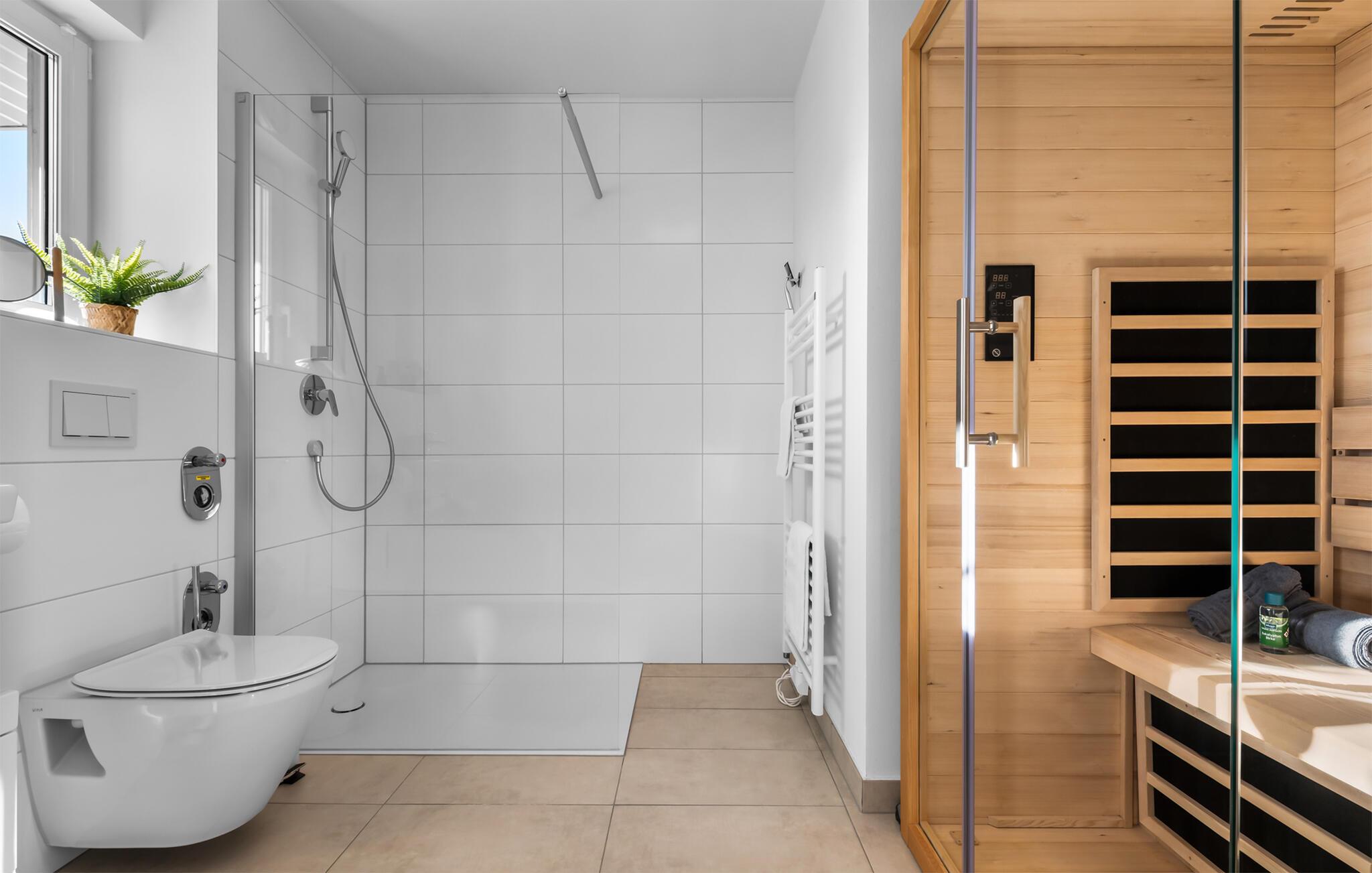 Das Badezimmer ist ein wahrer Wellness-Tempel mit einer einladenden Infrarotsauna (Wärmekabine) und einer bodengleichen Dusche, perfekt zum Entspannen nach einem langen Strandtag.