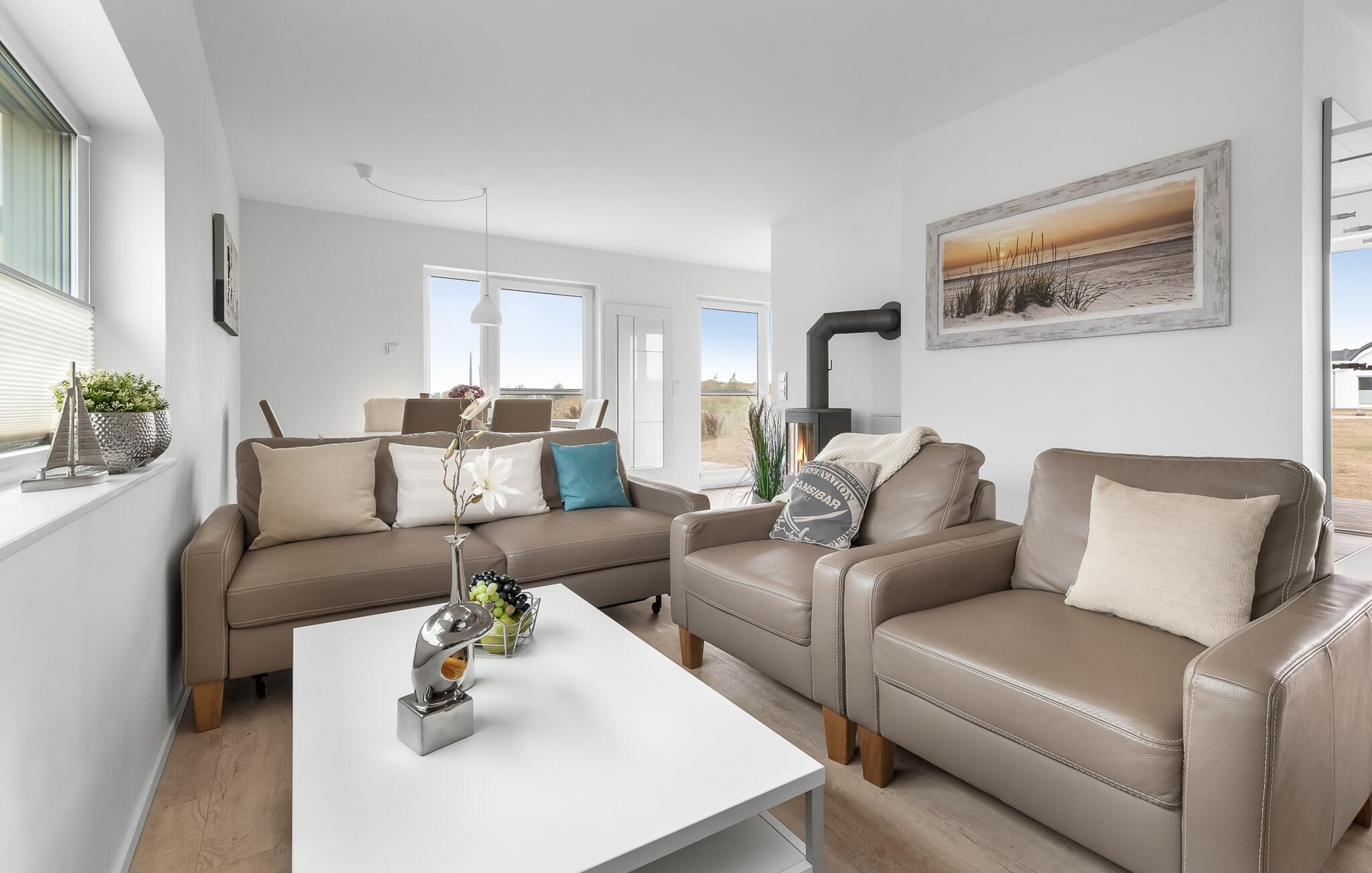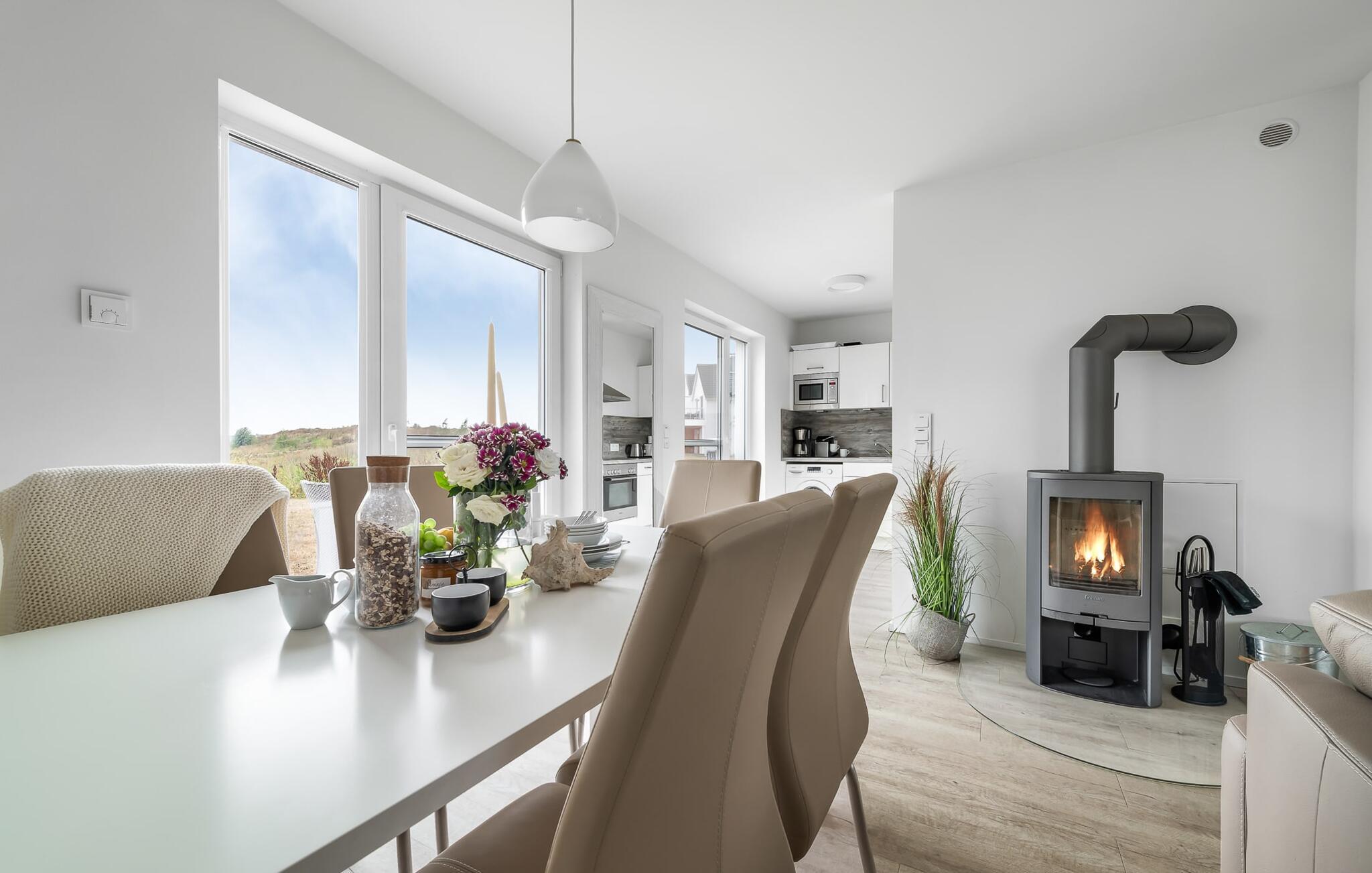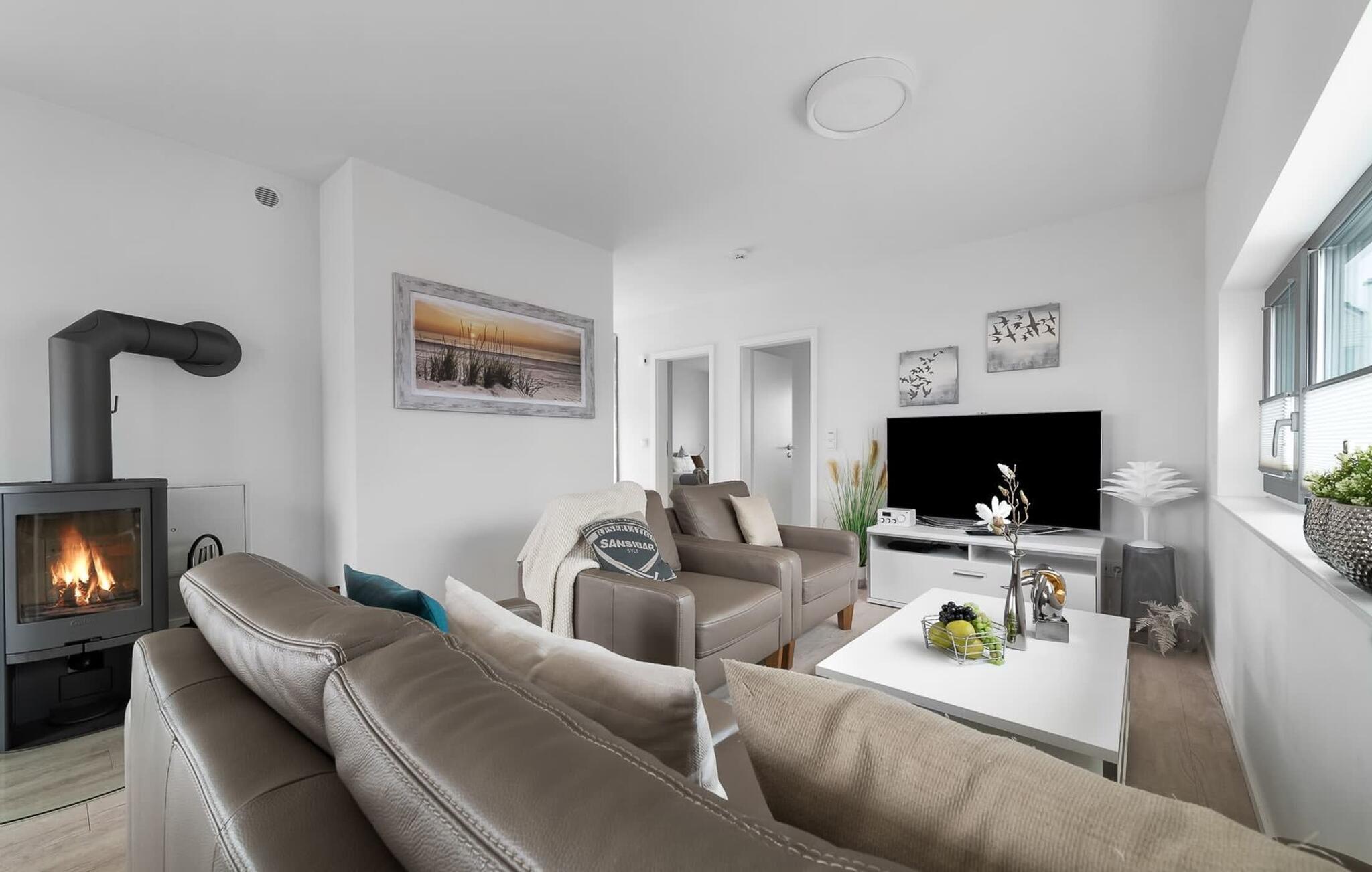 Romantisch wird es vorm Kaminfeuer auf dem kuscheligen Sofa. Für Indoor Unterhaltung sorgen an nordischen Schietwetter-Tagen zudem WLAN und Smart TV mit Telekom Home Entertainment Programm.