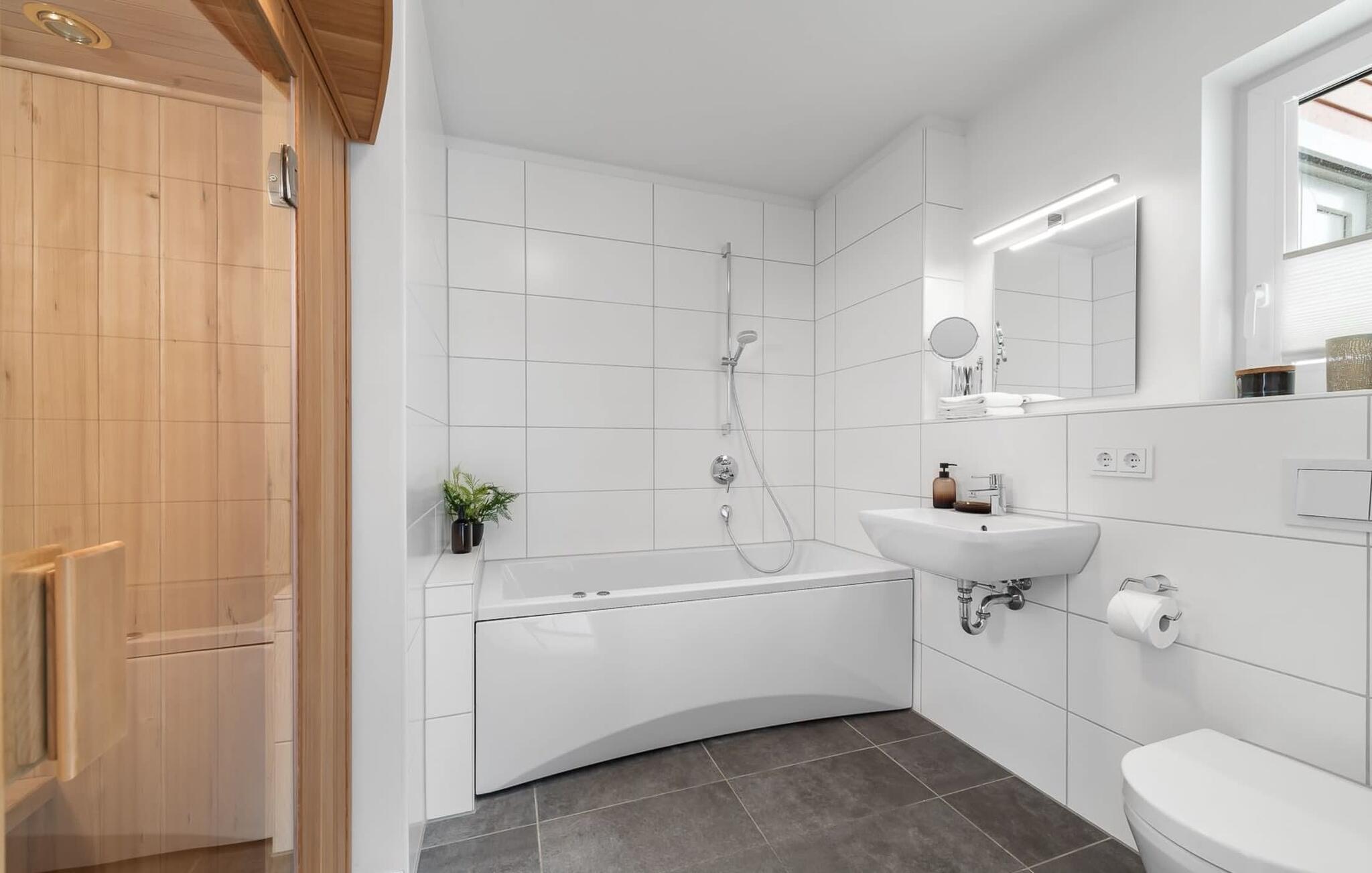 Das Badezimmer mit Wanne und einer Infrarot-Wärmekabine der Extraklasse sorgt für erholsame Wellnessmomente.