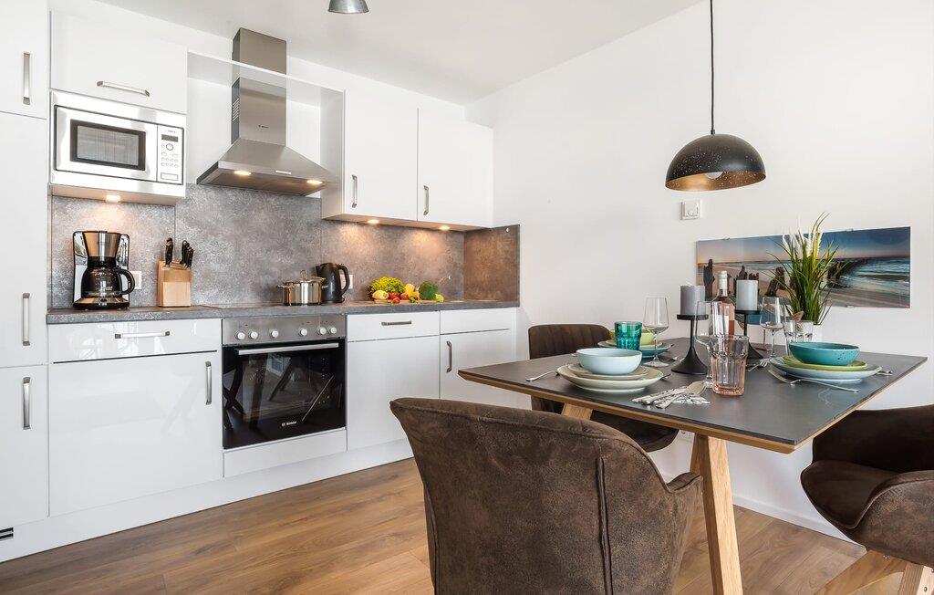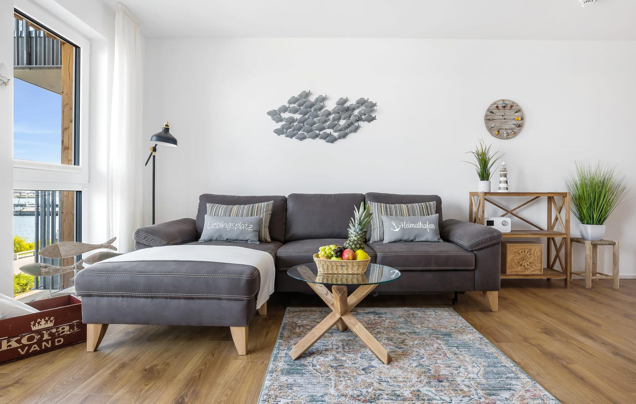 Modern, hochwertig und gemütlich eingerichtet fühlt sich der Gast vom ersten Moment an wohl und kann sich fallen lassen. Egal, ob man auf dem bequemen Schlafsofa chillt oder fernsieht, am Esstisch sitzt oder in der bestens bestückten Küche Mahlzeiten bereitet, der Blick auf Schiffe und Wasser ist immer dabei.
