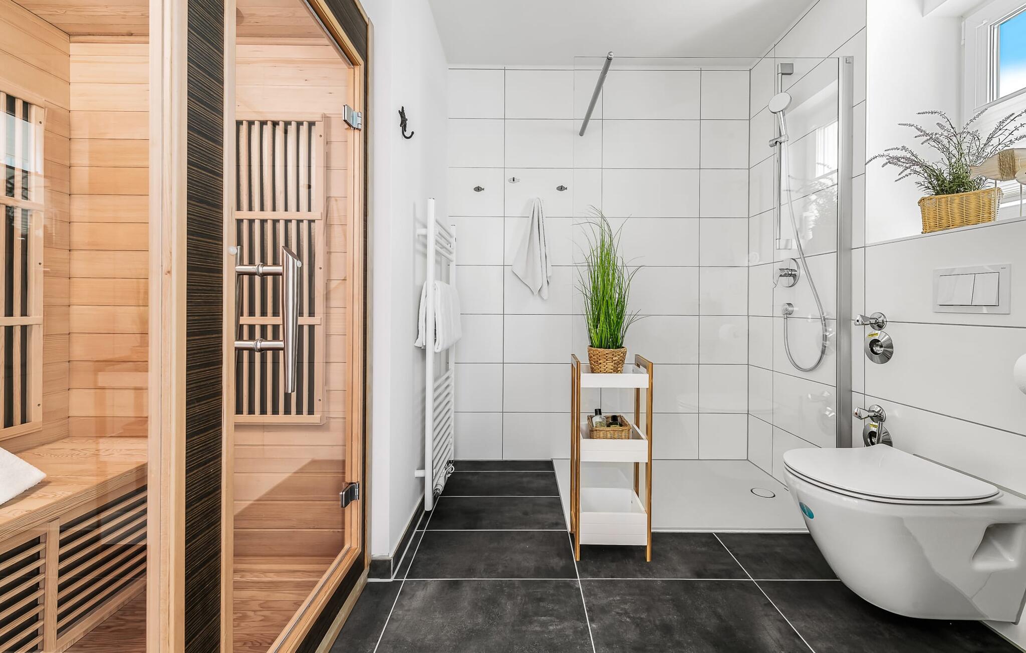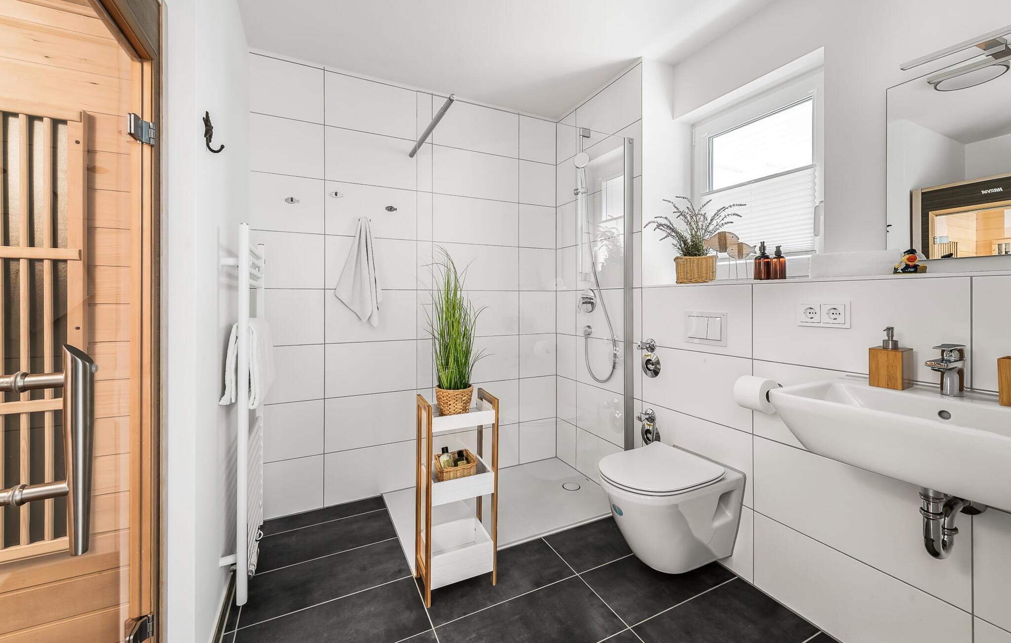 Nach einem langen Spaziergang am Strand ist das Badezimmer in der STRANDMUSCHEL eine absolute Wohlfühloase! Das Badezimmer verfügt über eine bodengleiche Dusche und eine Infrarot Sauna. Entspannung pur!