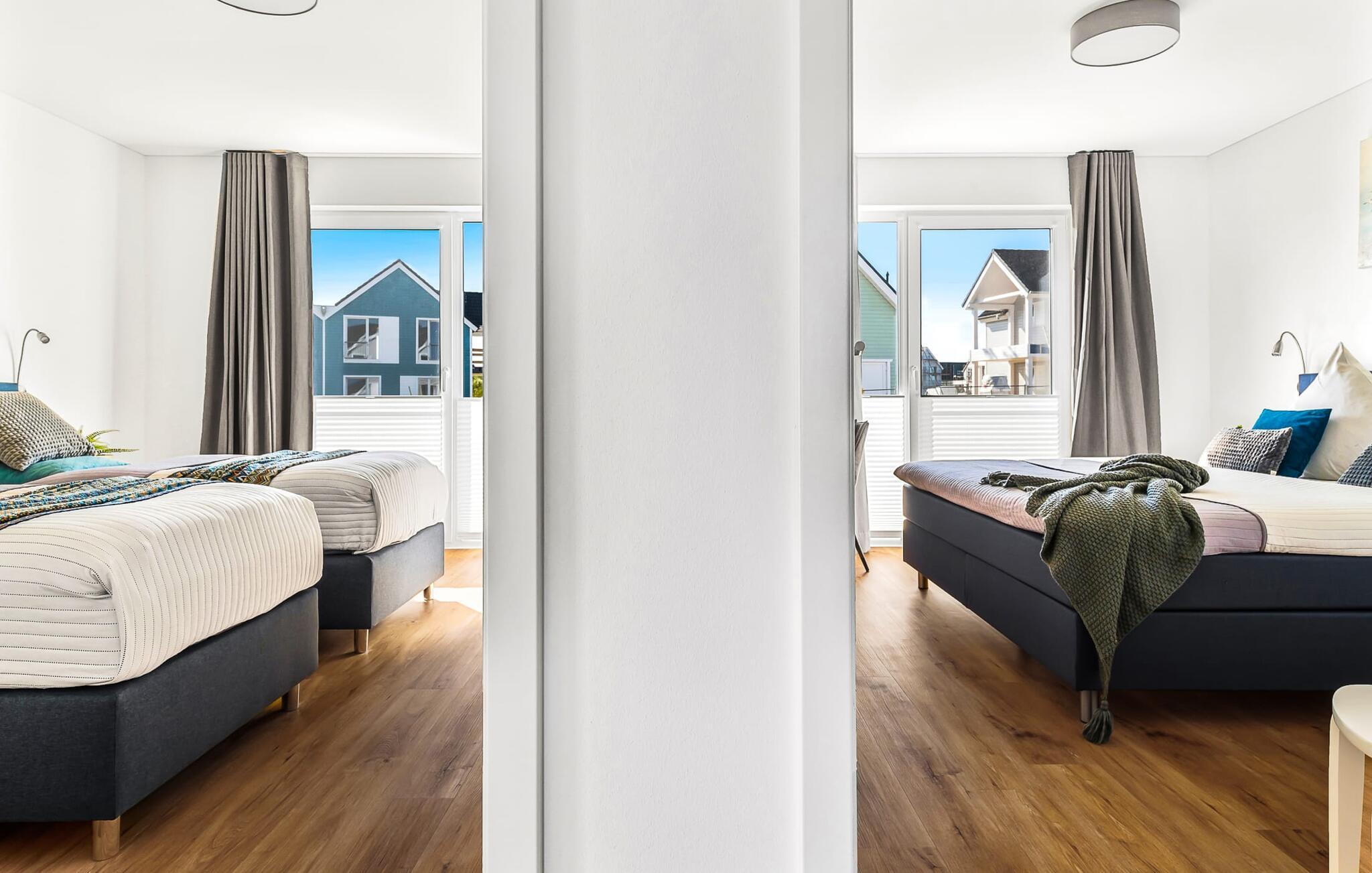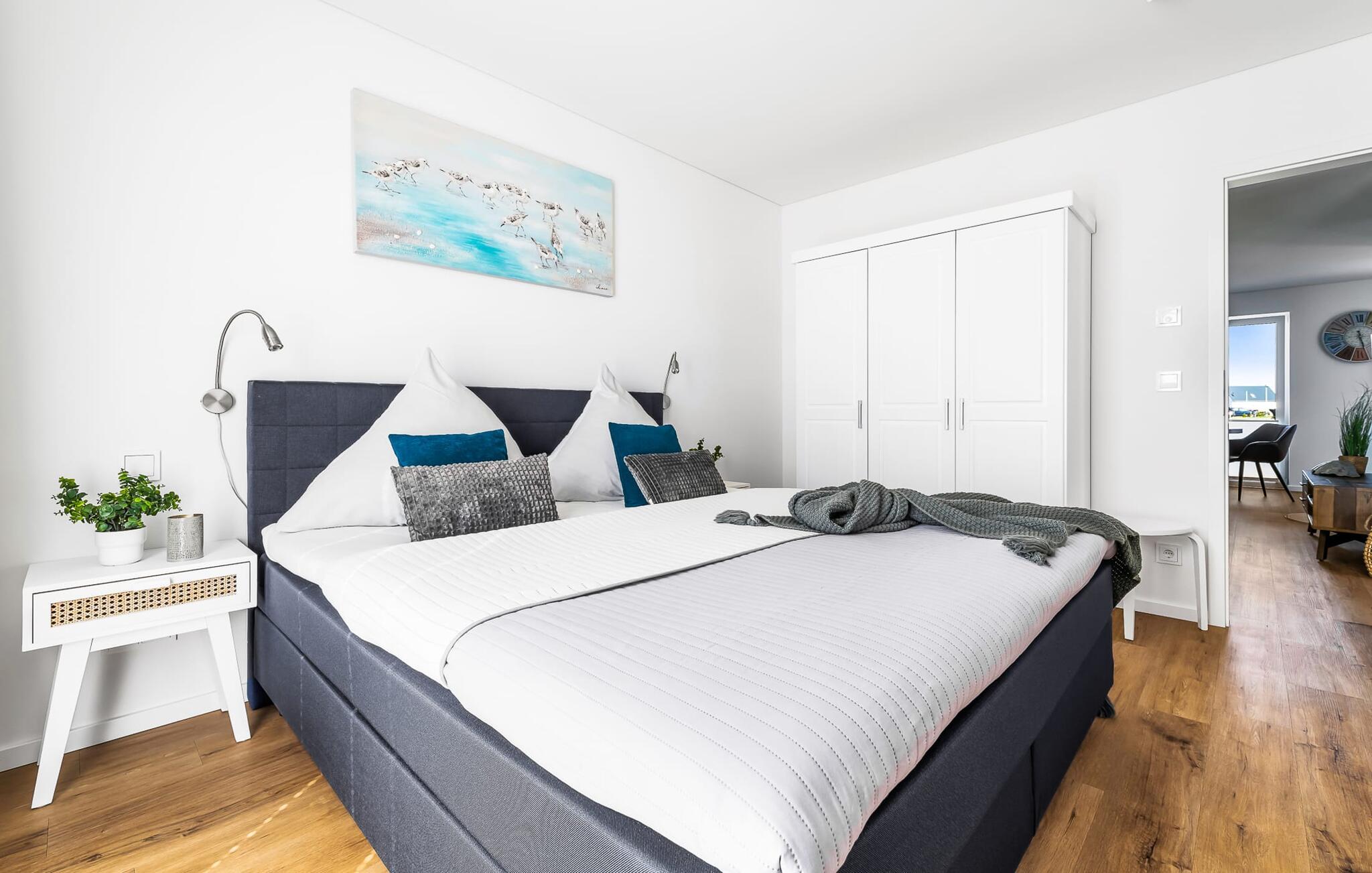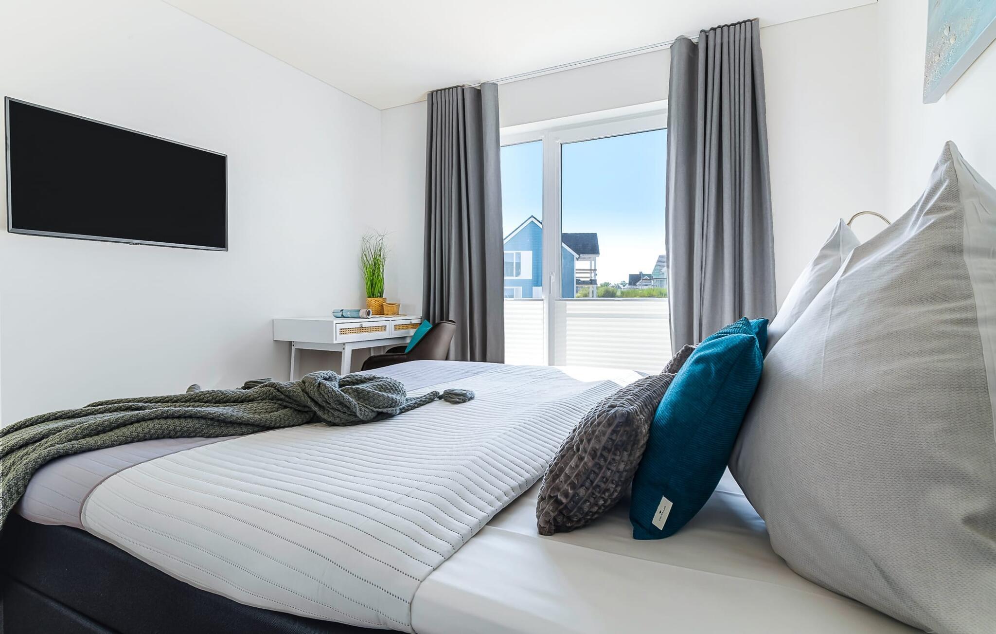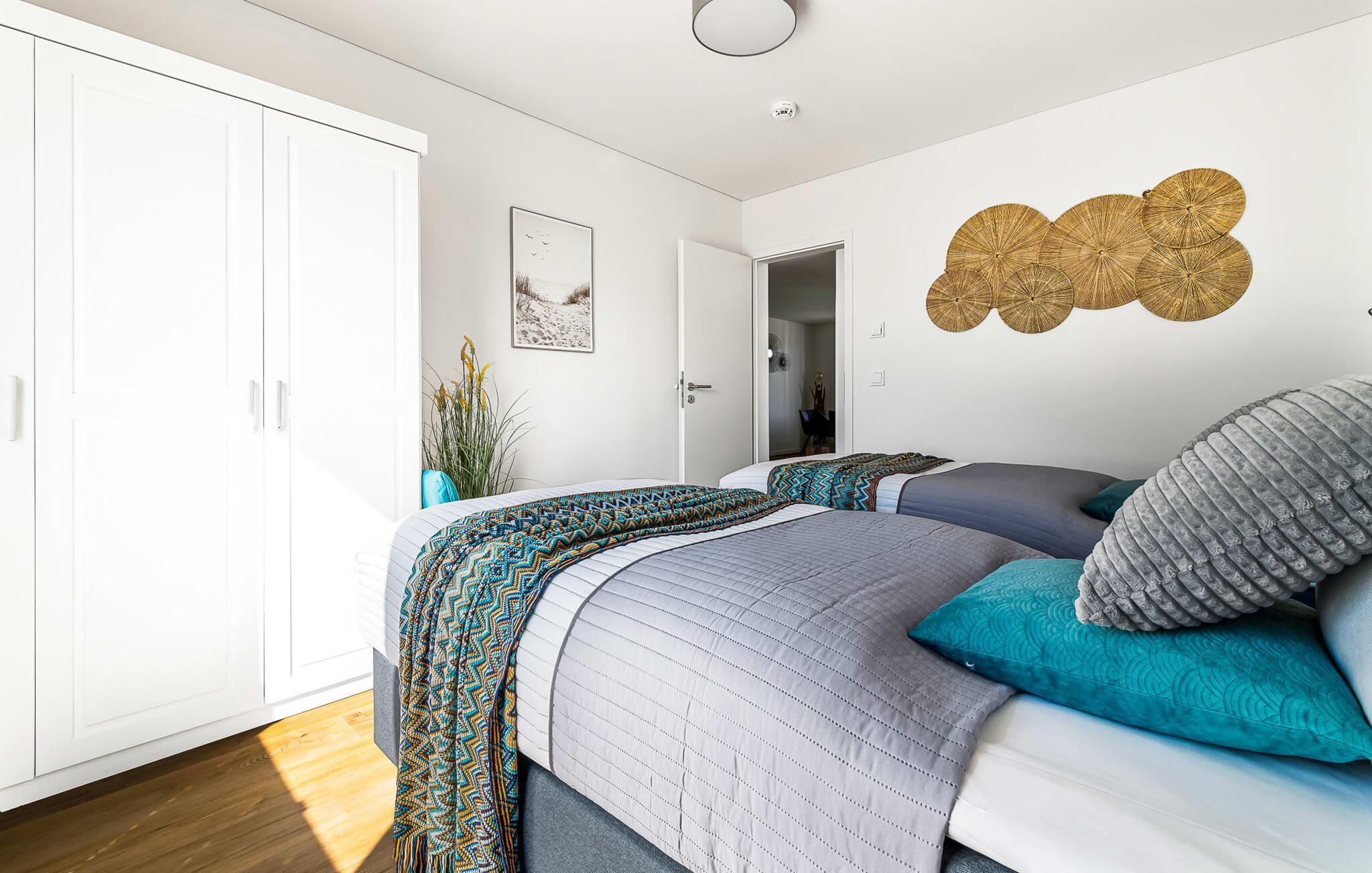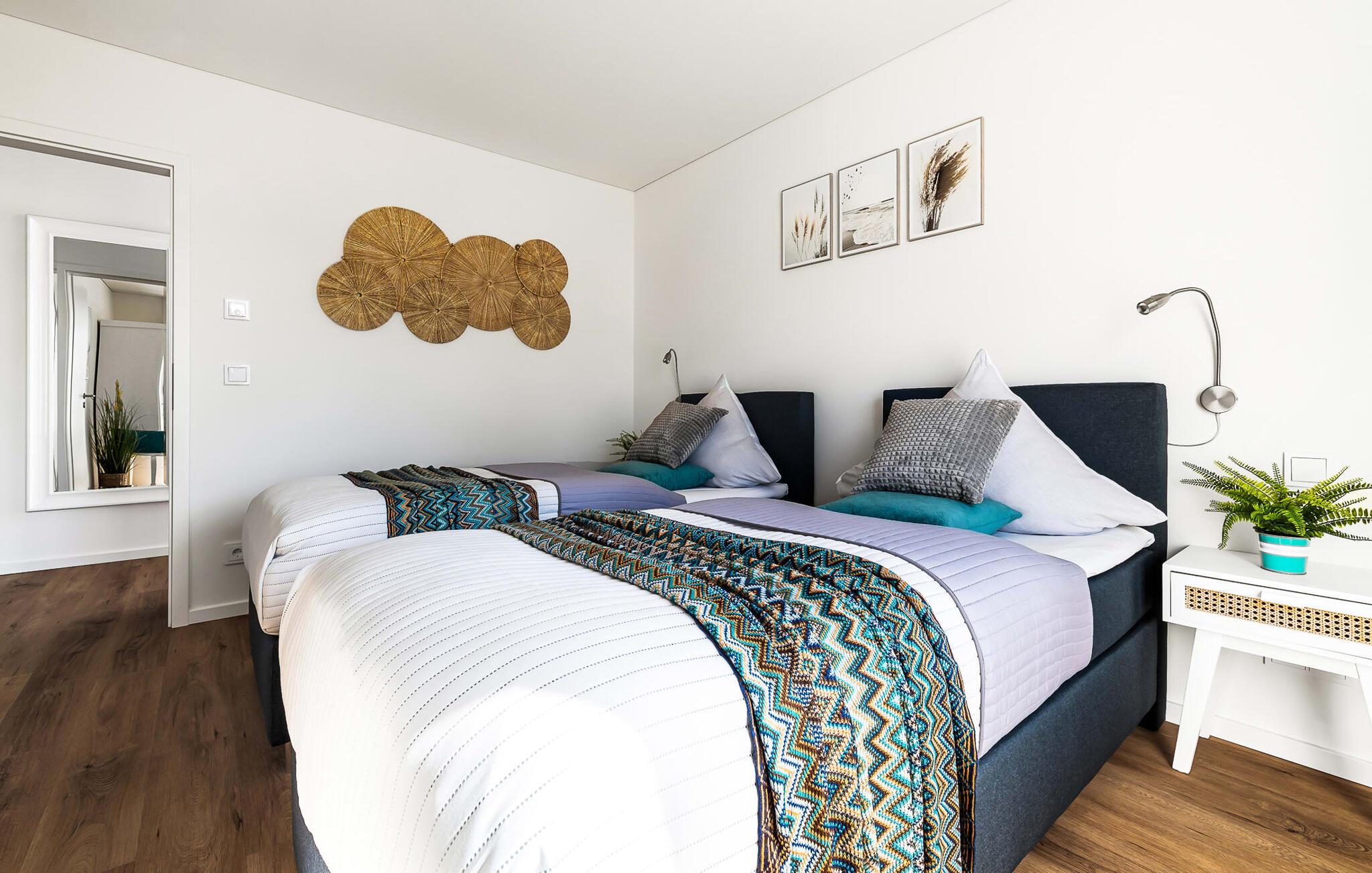 Das Hauptschlafzimmer ist mit einem großen Boxspringbett und einem Fernseher ausgestattet. Erholsame Stunden sind hier garantiert! Das zweite Schlafzimmer bietet euch mit zwei Einzel-Boxspringbetten weitere Schlafplätze.
