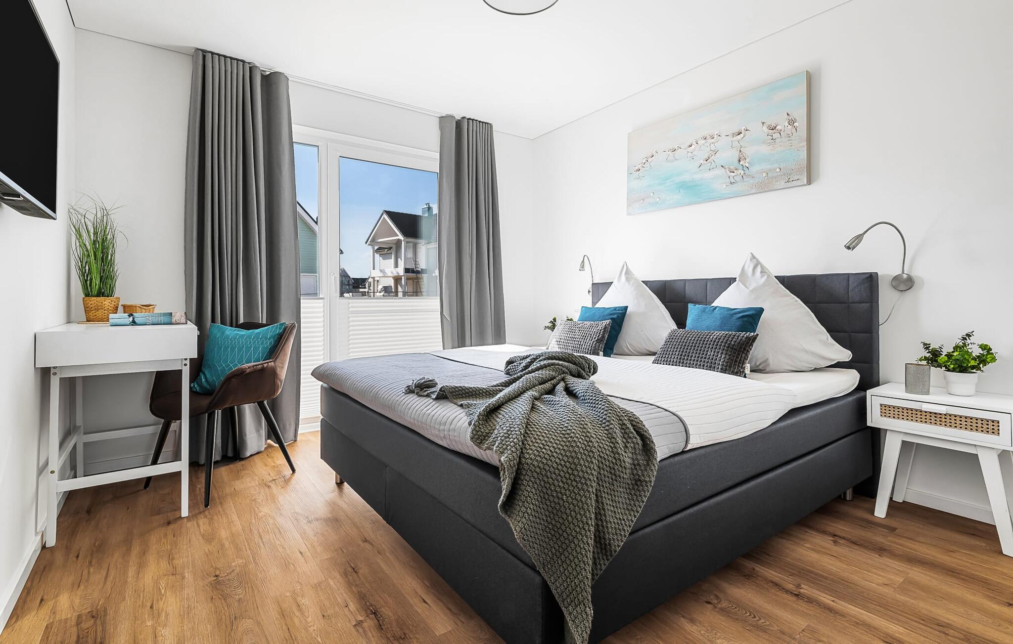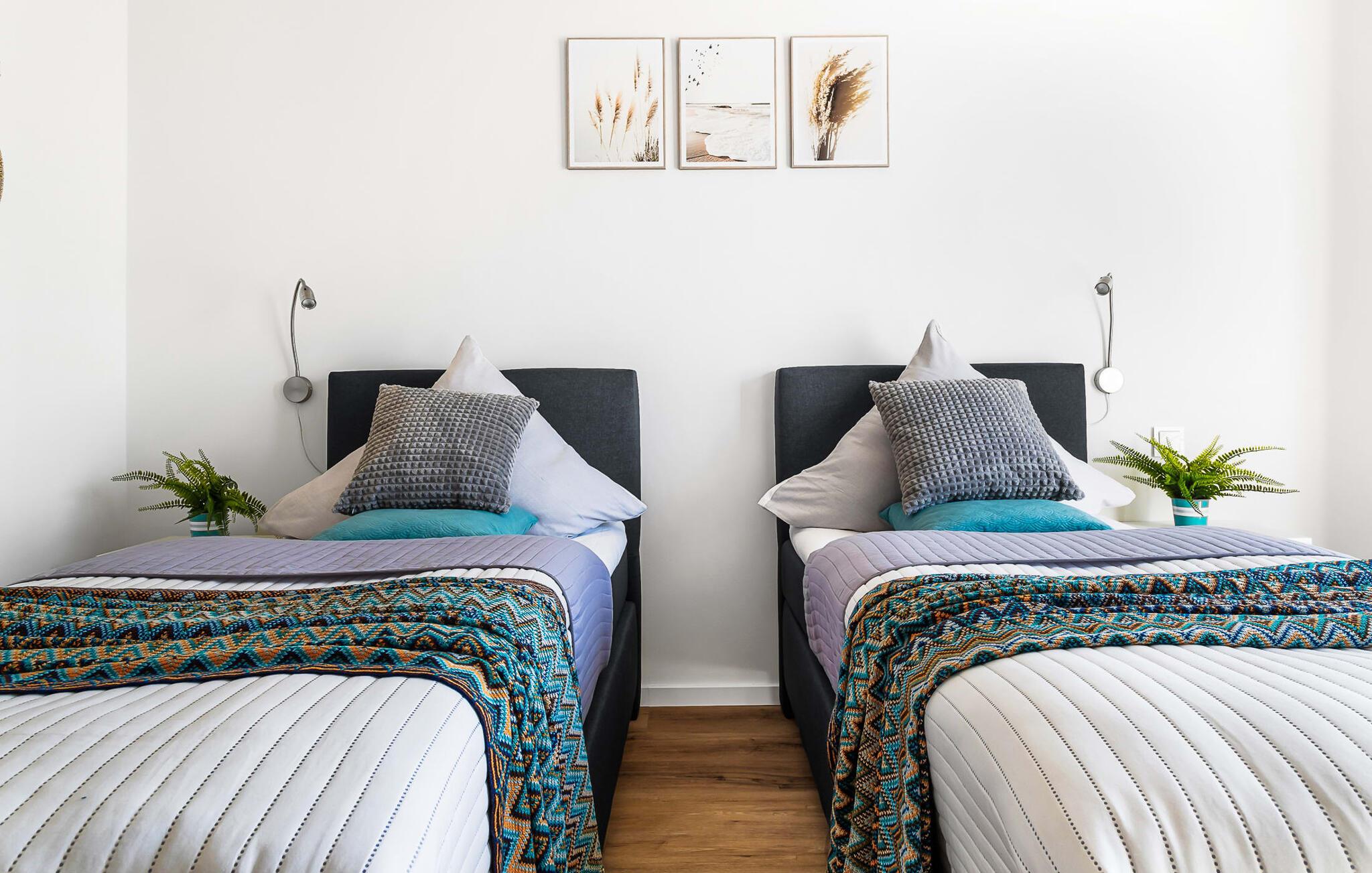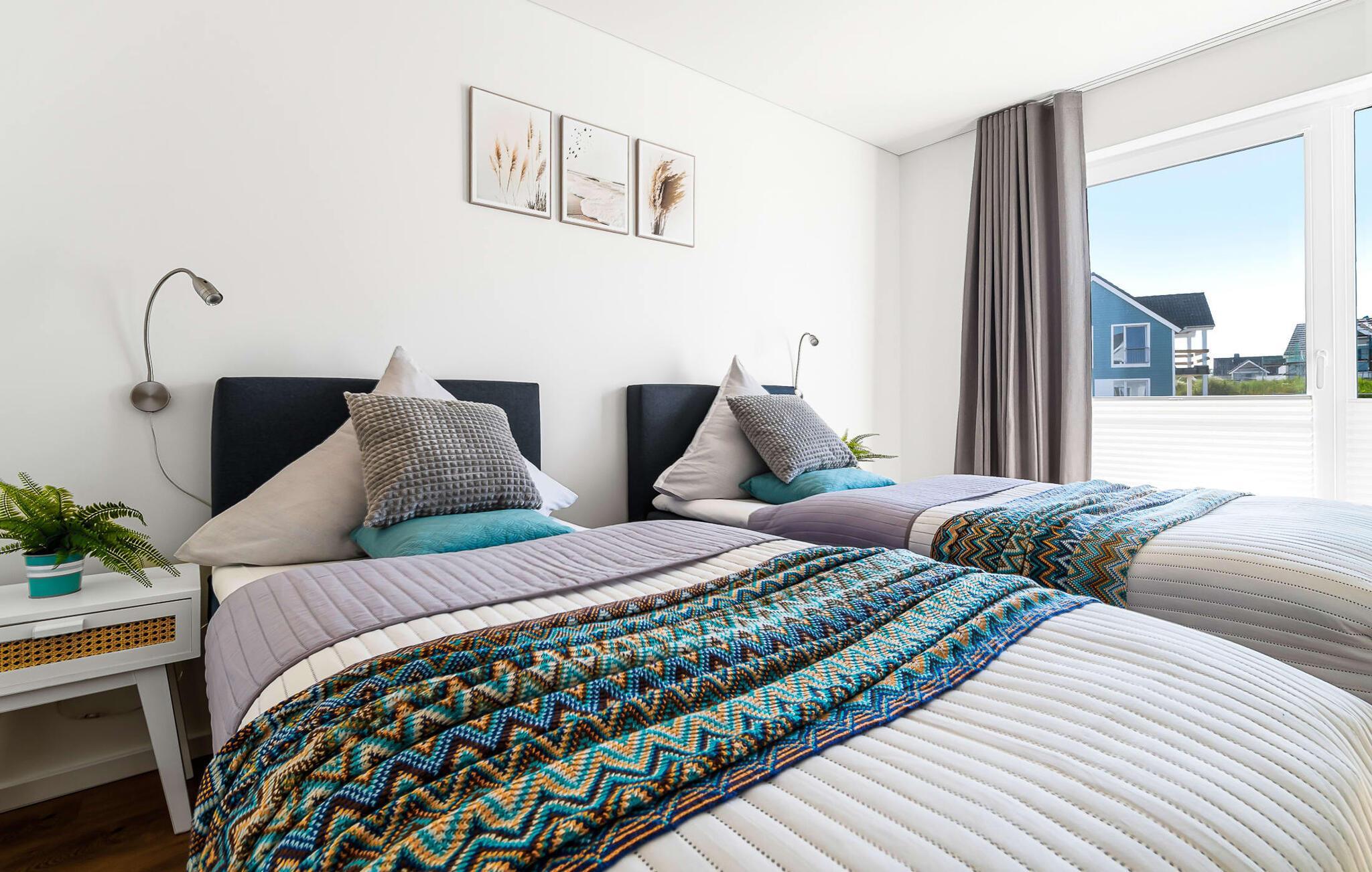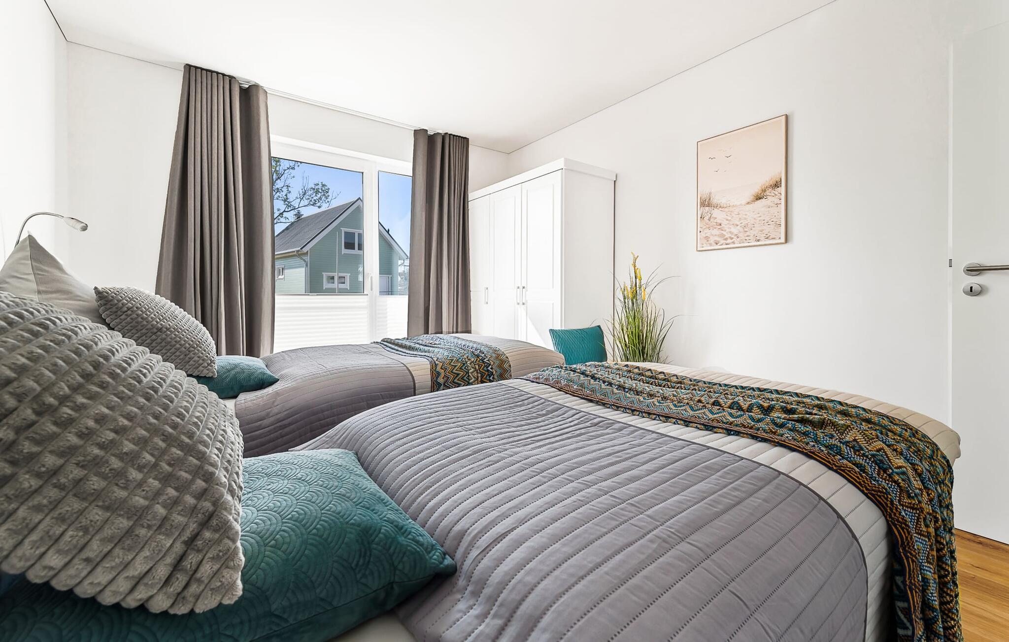Das Hauptschlafzimmer ist mit einem großen Boxspringbett und einem Fernseher ausgestattet. Erholsame Stunden sind hier garantiert! Das zweite Schlafzimmer bietet euch mit zwei Einzel-Boxspringbetten weitere Schlafplätze.