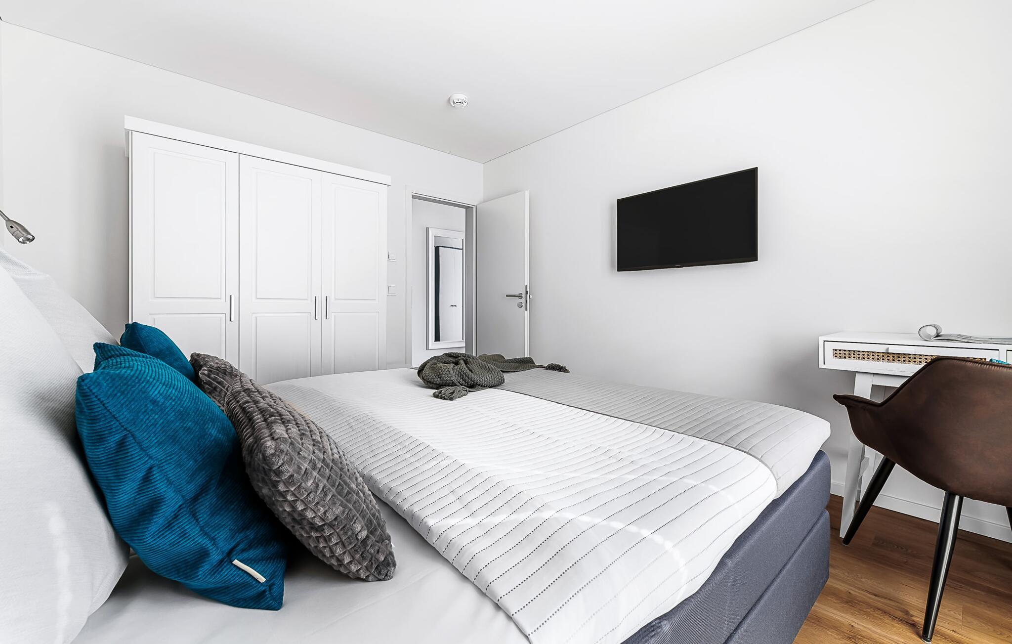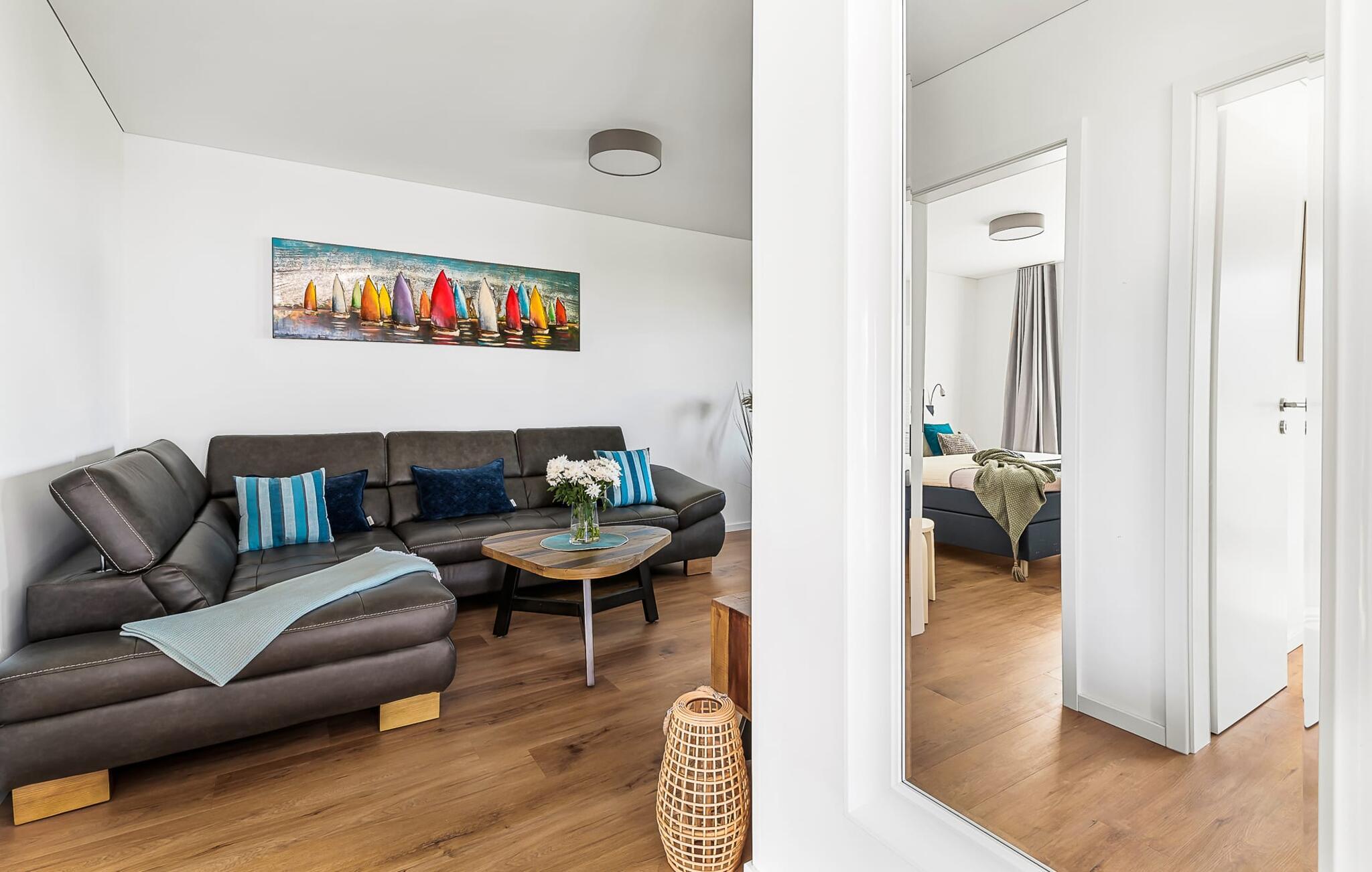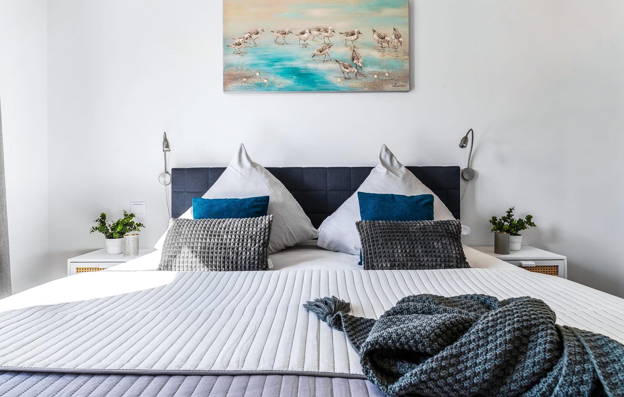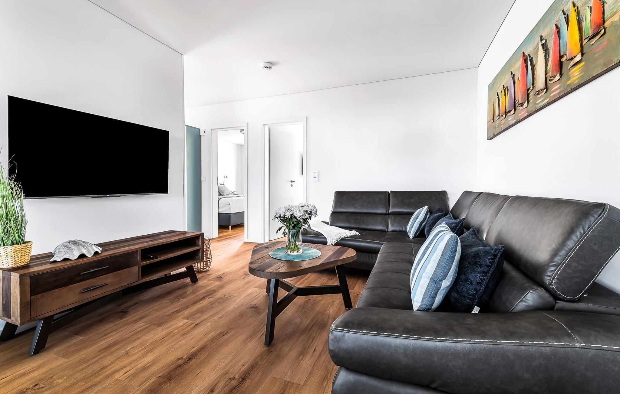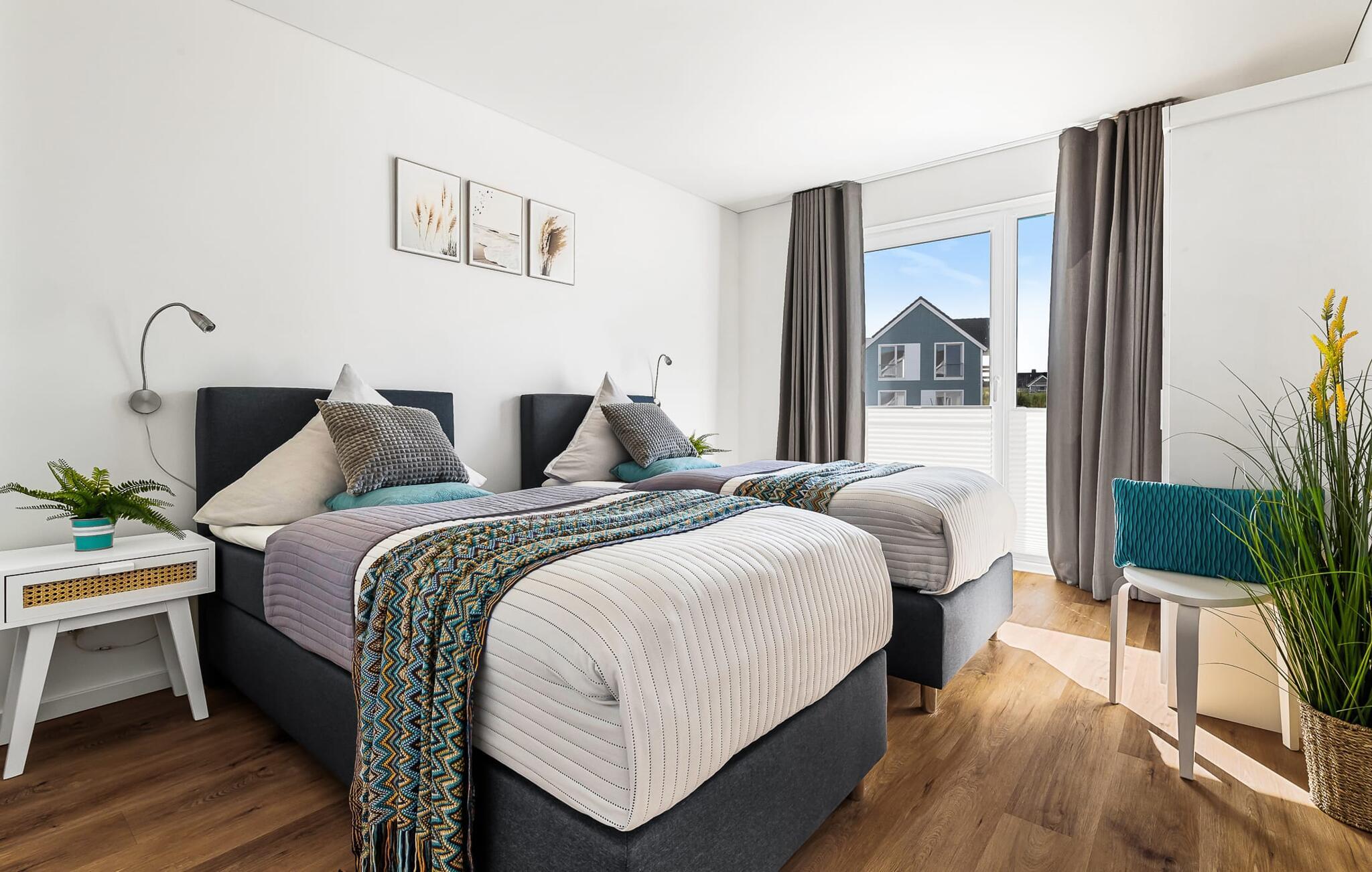 Das Hauptschlafzimmer ist mit einem großen Boxspringbett und einem Fernseher ausgestattet. Erholsame Stunden sind hier garantiert! Das zweite Schlafzimmer bietet euch mit zwei Einzel-Boxspringbetten weitere Schlafplätze.