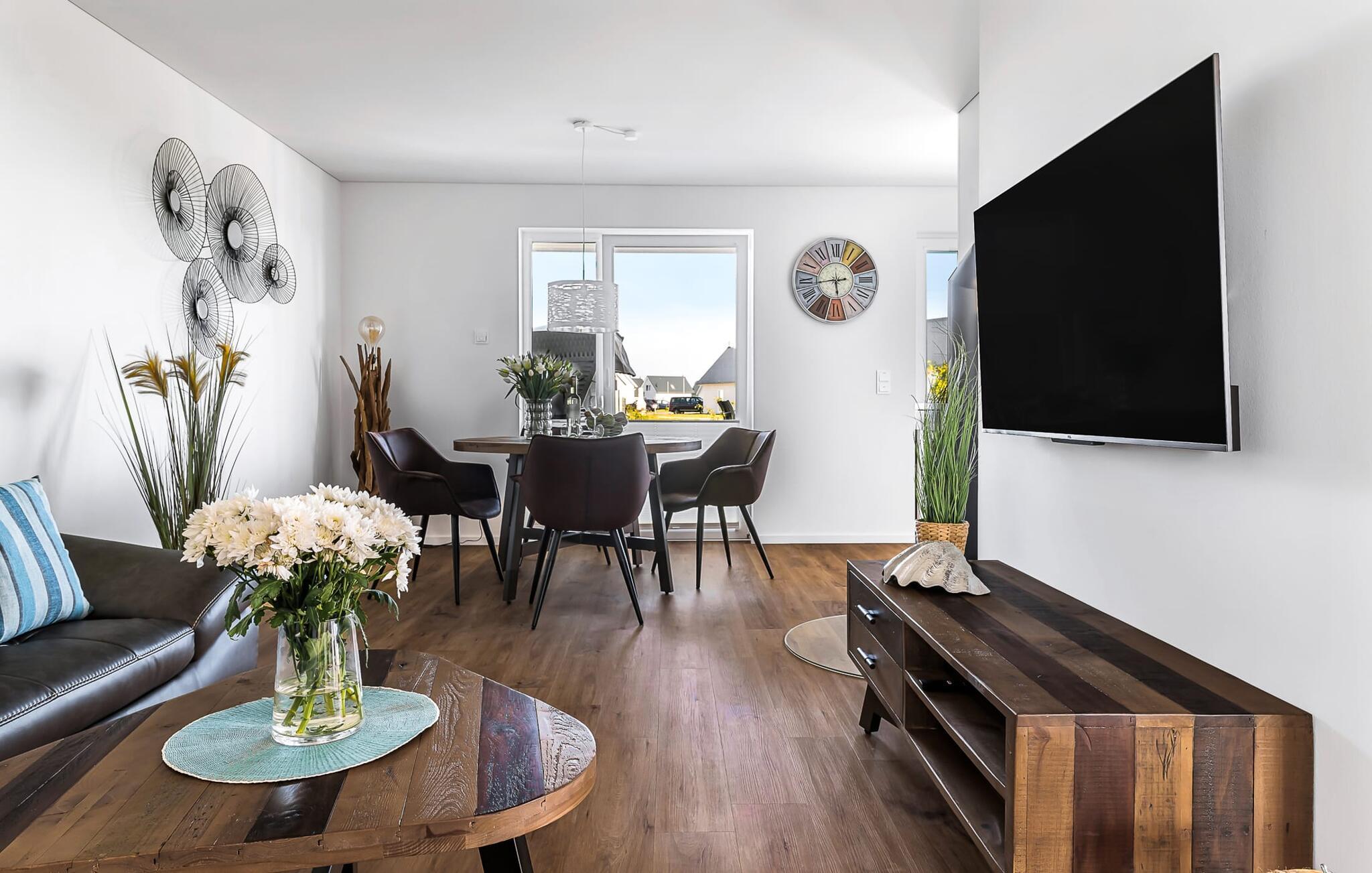 Romantisch wird es vorm Kaminfeuer auf dem kuscheligen Sofa. Für Indoor Unterhaltung sorgen zudem WLAN und Smart TV mit Telekom Home Entertainment Programm.