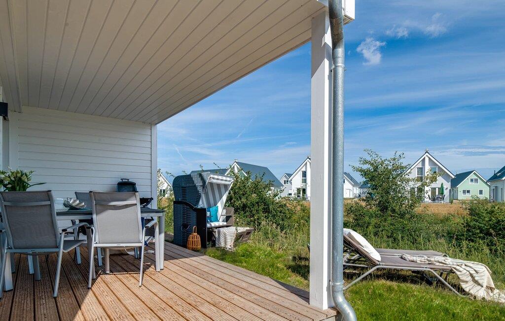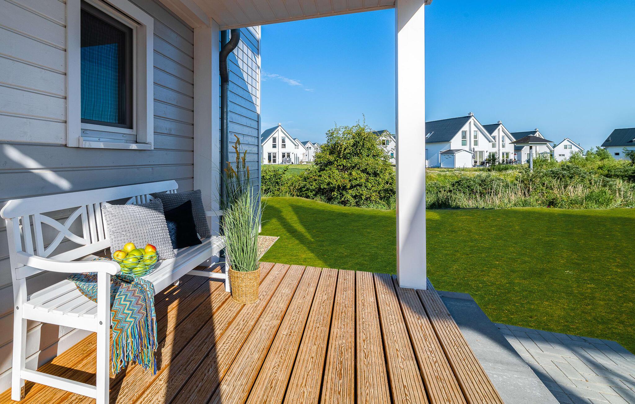 Eine überdachte Terrasse mit Strandkorb und Sonnenliegen lädt dazu ein den Tag im Freien zu verbringen und die Ostseesonne zu genießen. Die umliegende Grünfläche um das Haus wird für unsere kleinen Gäste zur Spielwiese.