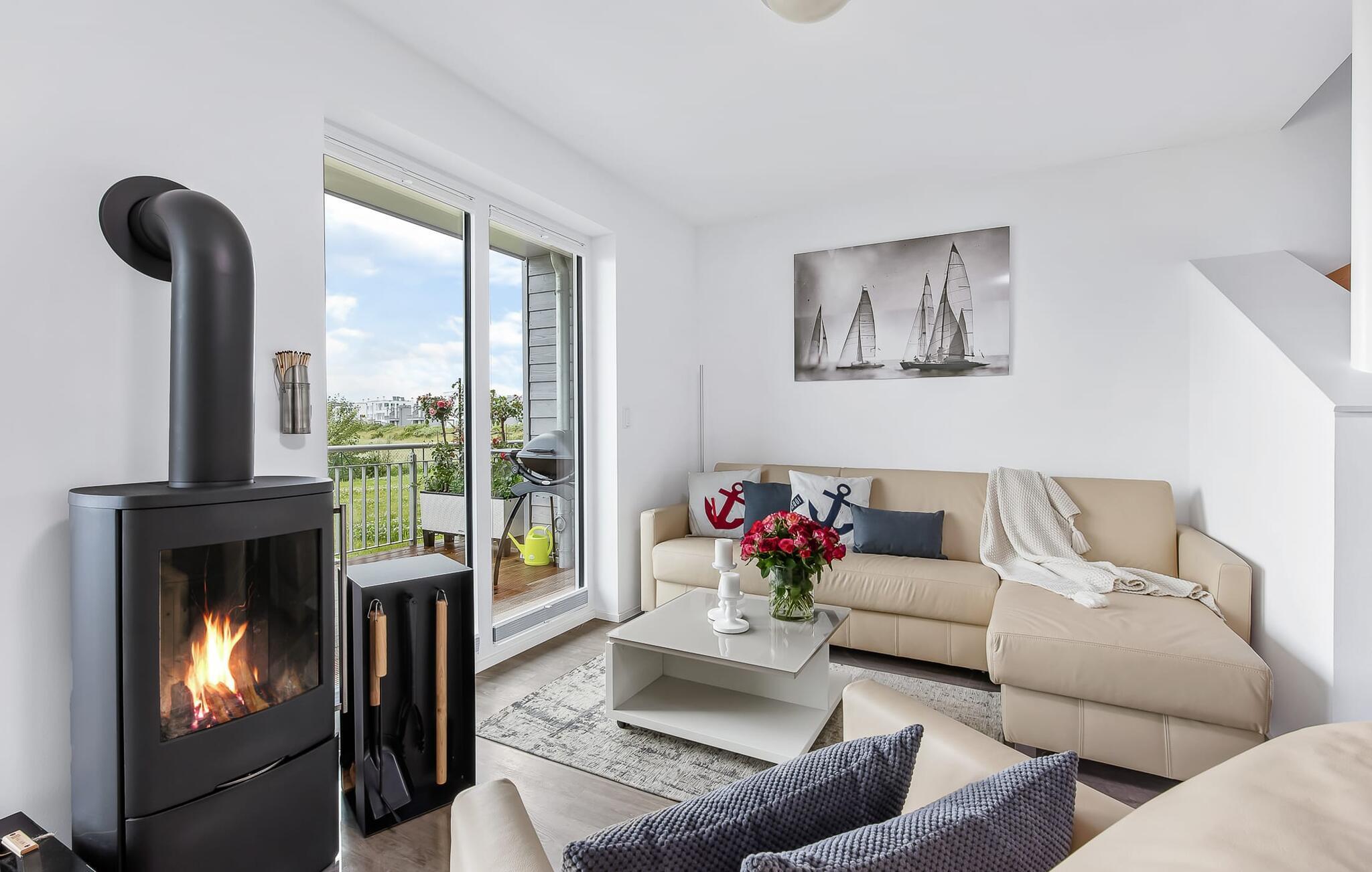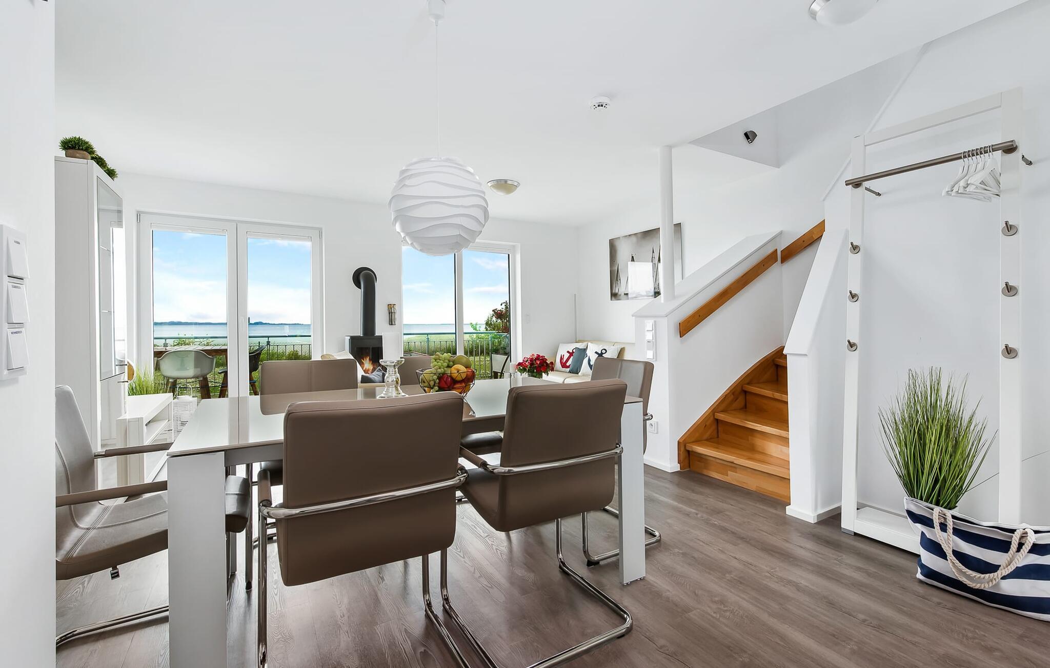 Im Erdgeschoss befindet sich die hochwertige und perfekt ausgestattete Küche, die das Herz eines jeden Hobbykochs höher schlagen lässt. Der Übergang zum Wohn- und Essbereich mit einem Fernseher ist fließend und gibt dem Ganzen noch mehr Großzügigkeit. Neben dem Essplatz erstreckt sich der Wohnbereich mit seinen gemütlichen Möbeln bis hin zur bodentiefen Fensterfront und dem Zutritt zur Terrasse. Ein wahrhaft fantastischer Ausblick über die Schlei bis hin nach Maasholm mit seinem Hafen liegt vor euch. Auf der Terrasse findet ihr einen weiteren Essplatz vor, der nach geselligen Grillabenden ruft. Ebenfalls auf dieser Etage befindet sich ein Gäste WC.