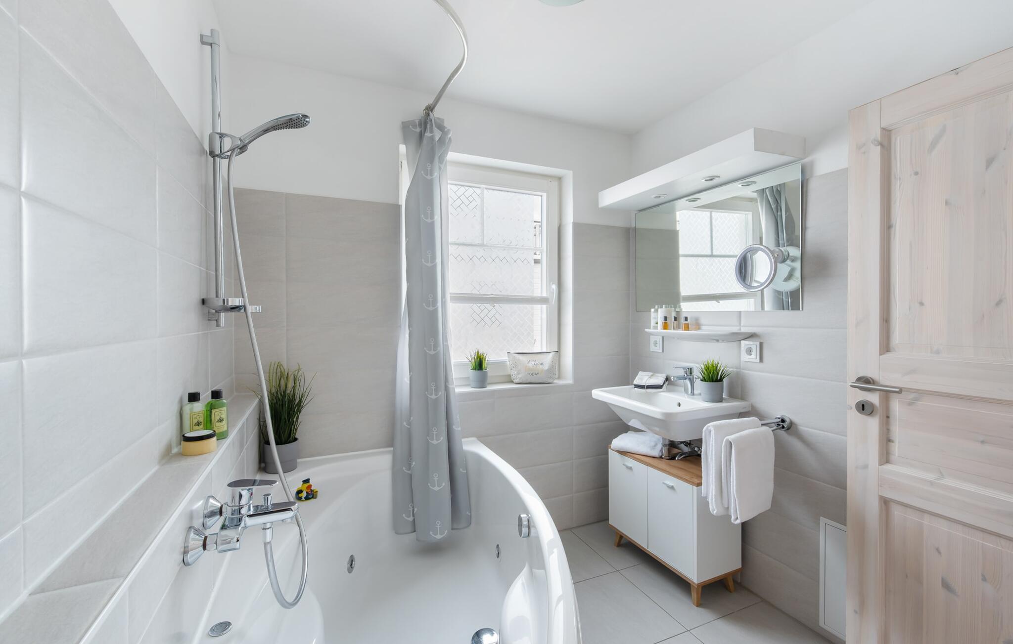 Das Vollbad bietet neben allem Nützlichen eine Whirlpool-Badewanne mit Dusche, welche den Start in einen gelungenen neuen Urlaubstag garantiert.