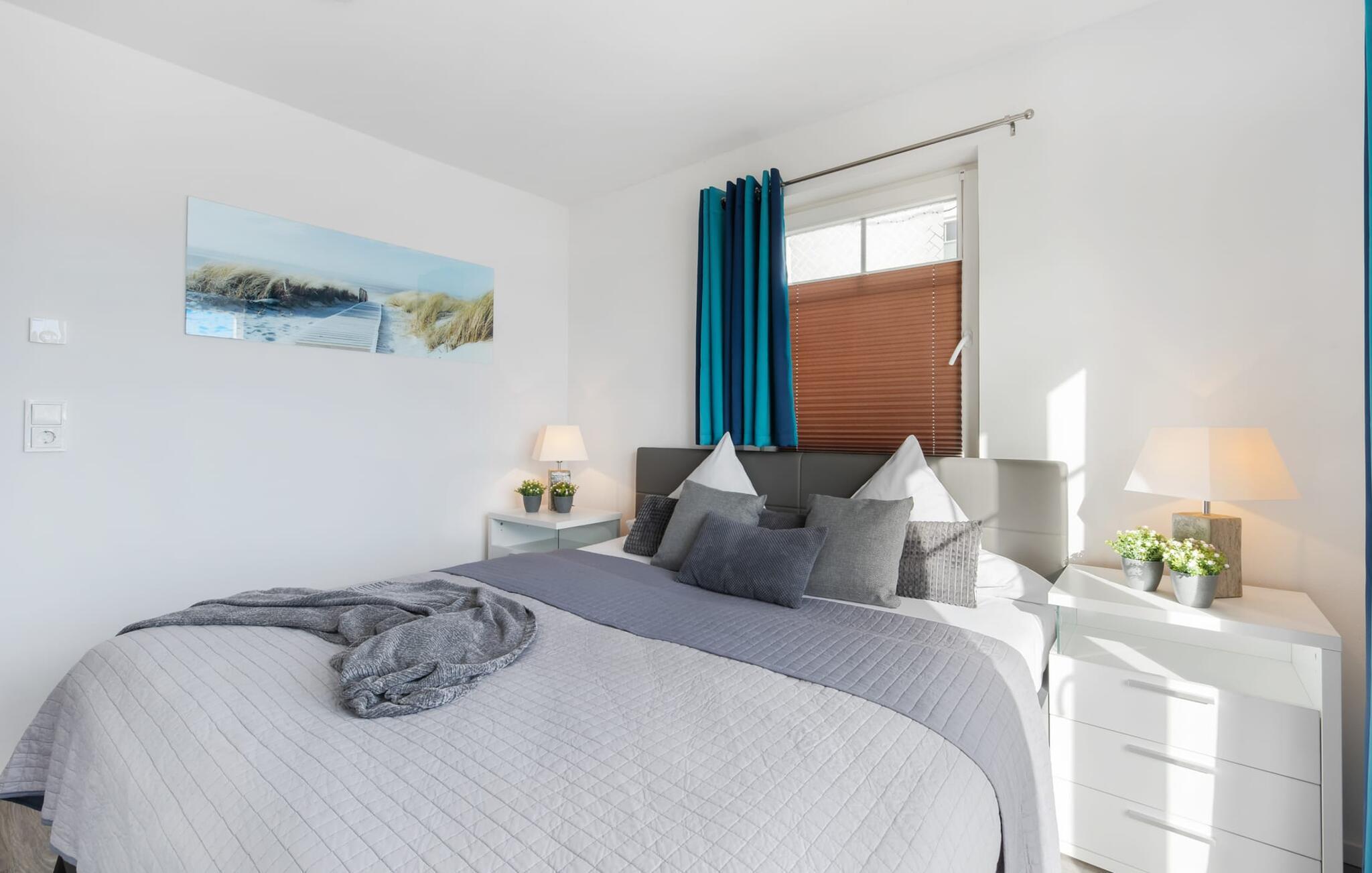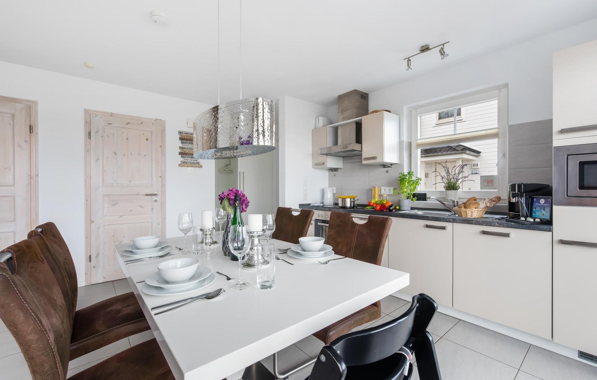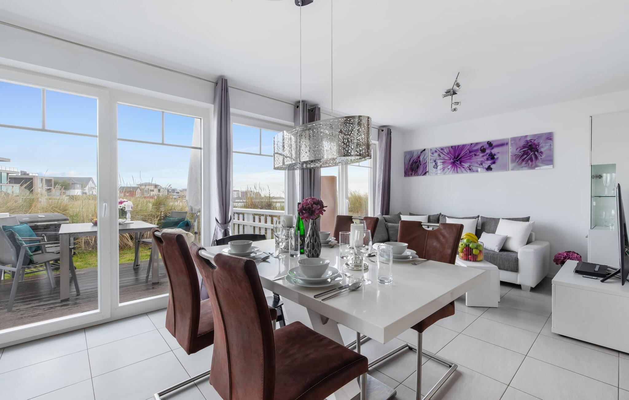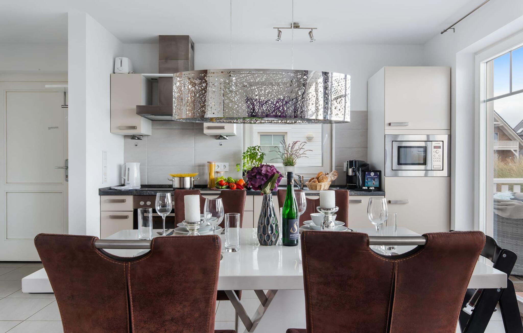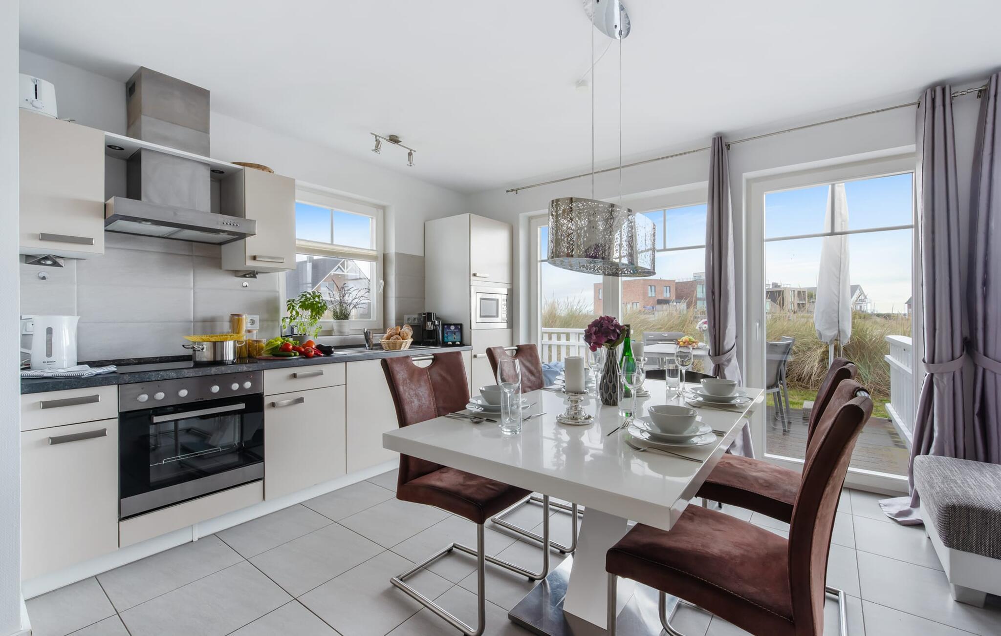 Die moderne Einrichtung mit einigen ausgesuchten, dezenten maritimen Details verströmt Behaglichkeit und die topausgestattete Küchenzeile erfreut jedes Herz. Hier eine Mahlzeit vorzubereiten, um sie dann entweder am stylischen Esstisch oder auf der Terrasse einzunehmen, macht Spaß, denn alles wird vom Blick auf Strand und Wasser begleitet.