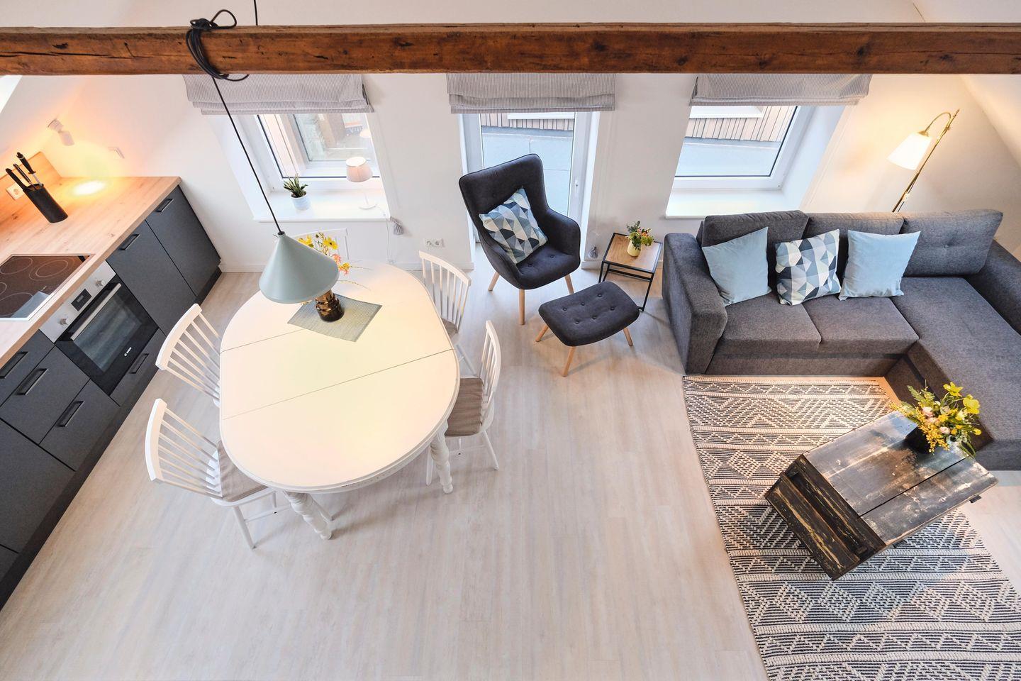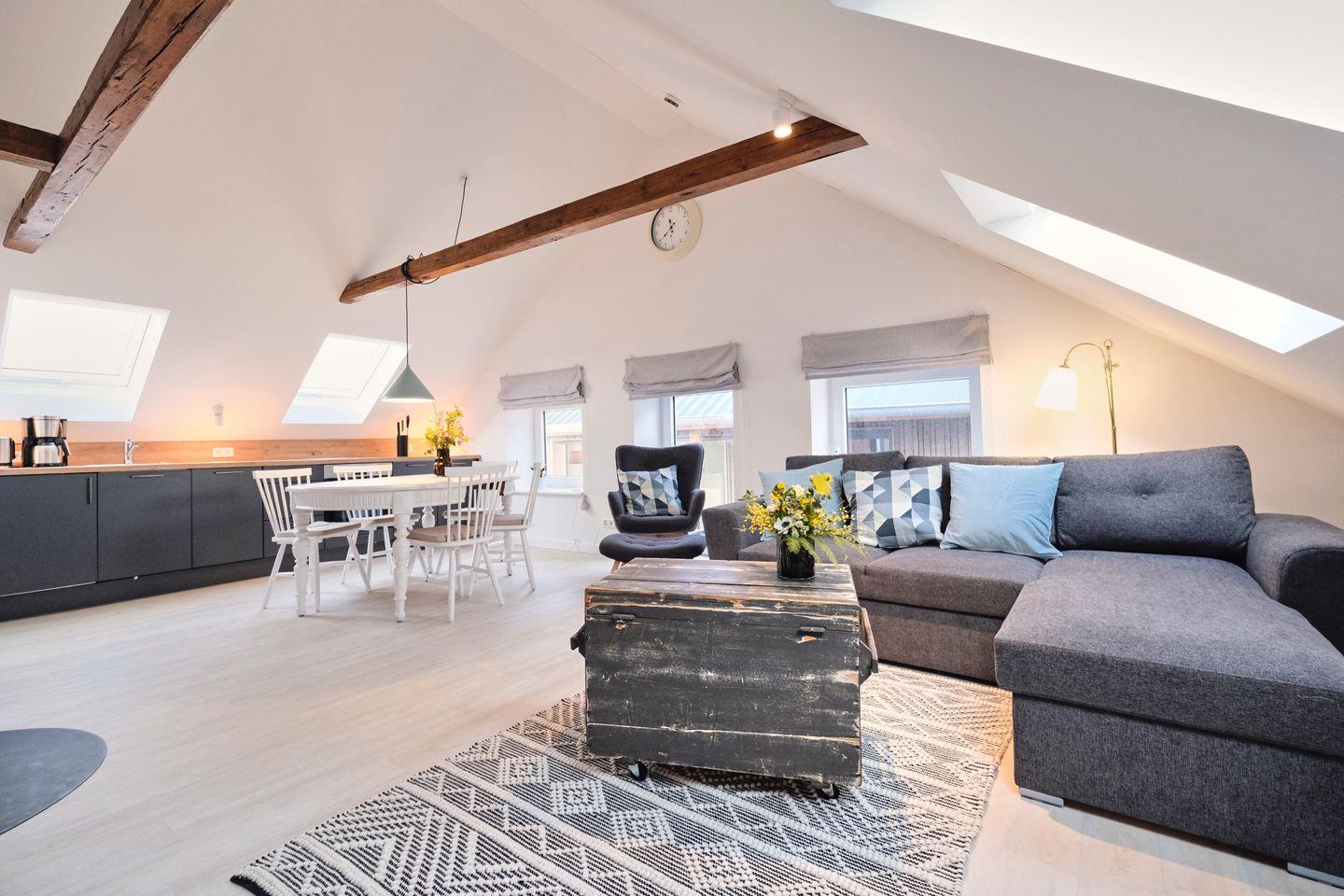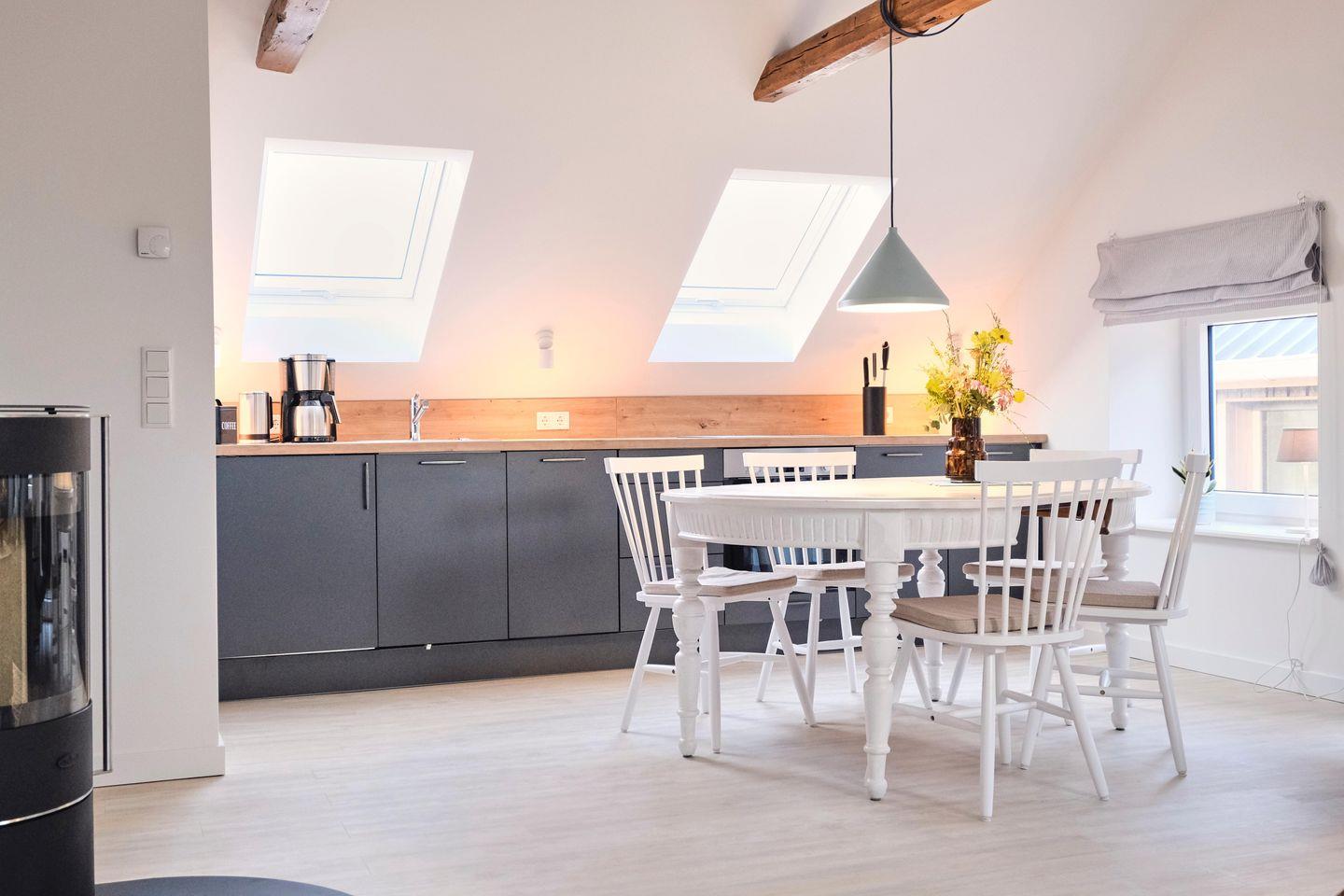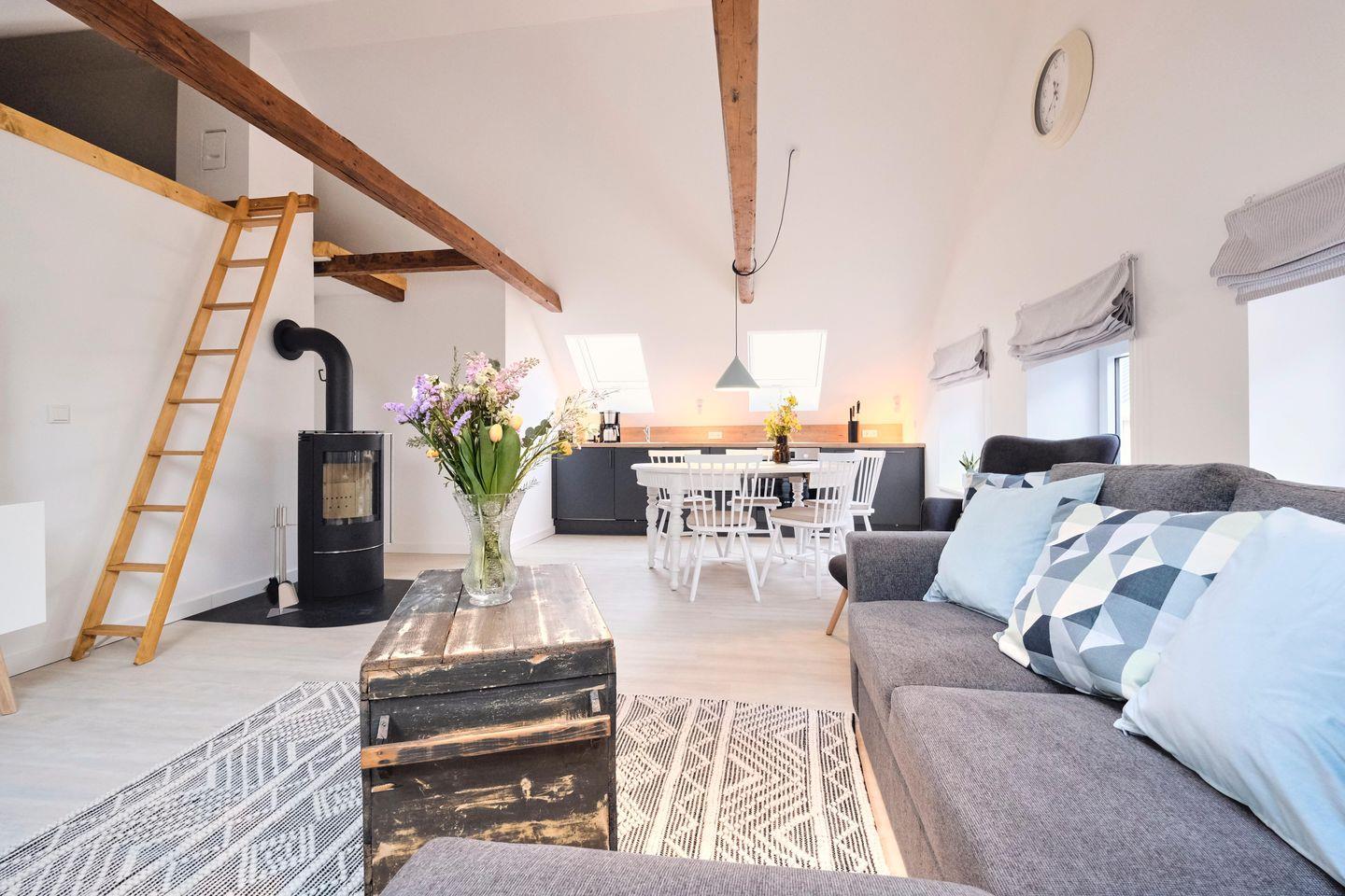 Die sehr geschmackvoll und liebevoll gestaltete Ferienwohnung eines ehemaligen Bauernhauses lädt zum Verweilen und Entspannen ein. Ob mit der ganzen Familie oder ein Trip mit Freunden - der große Wohn- und Essbereich ist das Herzstück der Wohnung. Hier kann gemeinsam gekocht, gegessen, gespielt und gelacht werden. Für eine zusätzlich gemütliche Atmosphäre sorgt ein Kaminofen in der Sofaecke.
