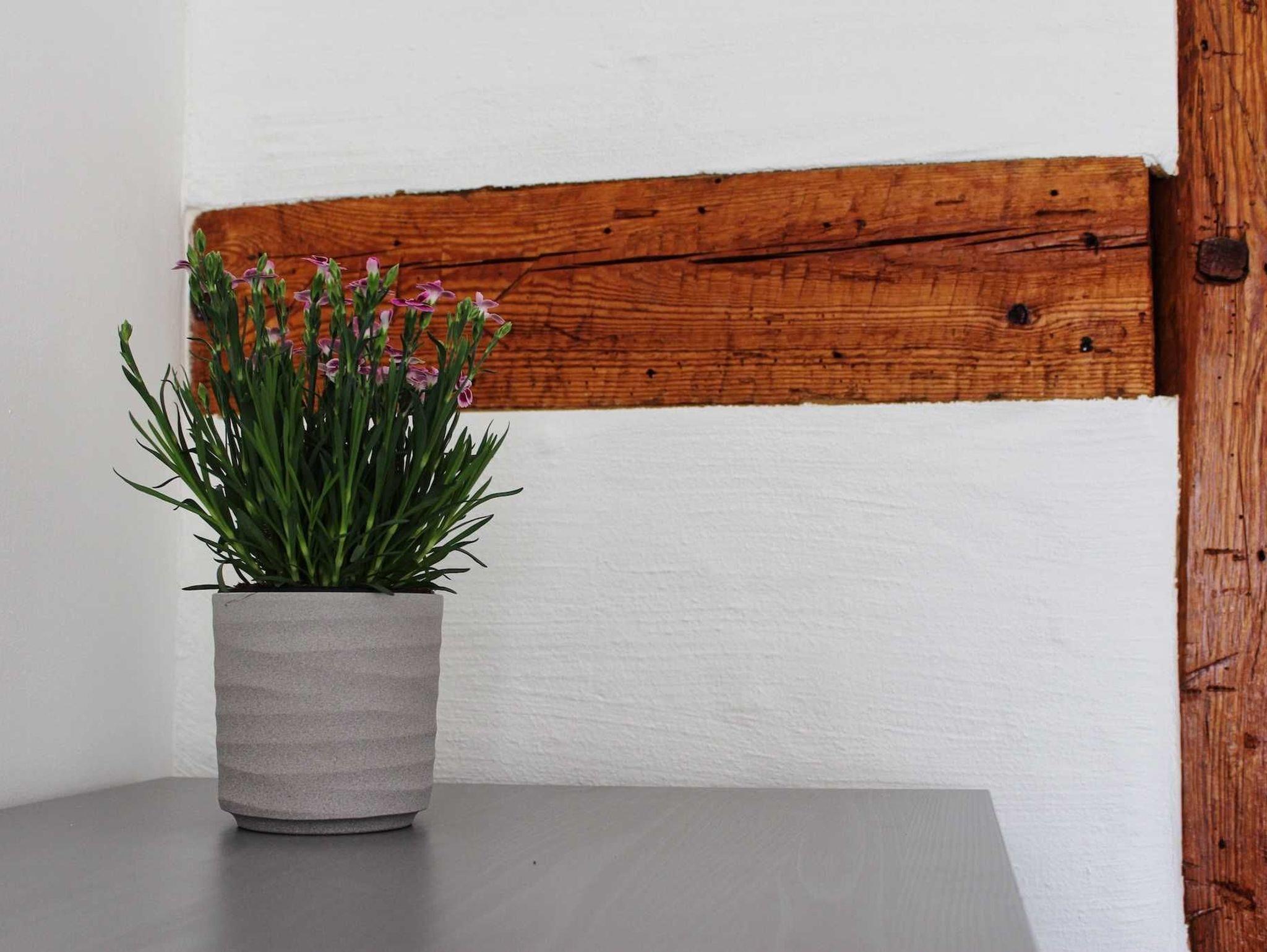 dunklen Holzbalken, gepaart mit der erhaltenen weißen Lehmwand und einer