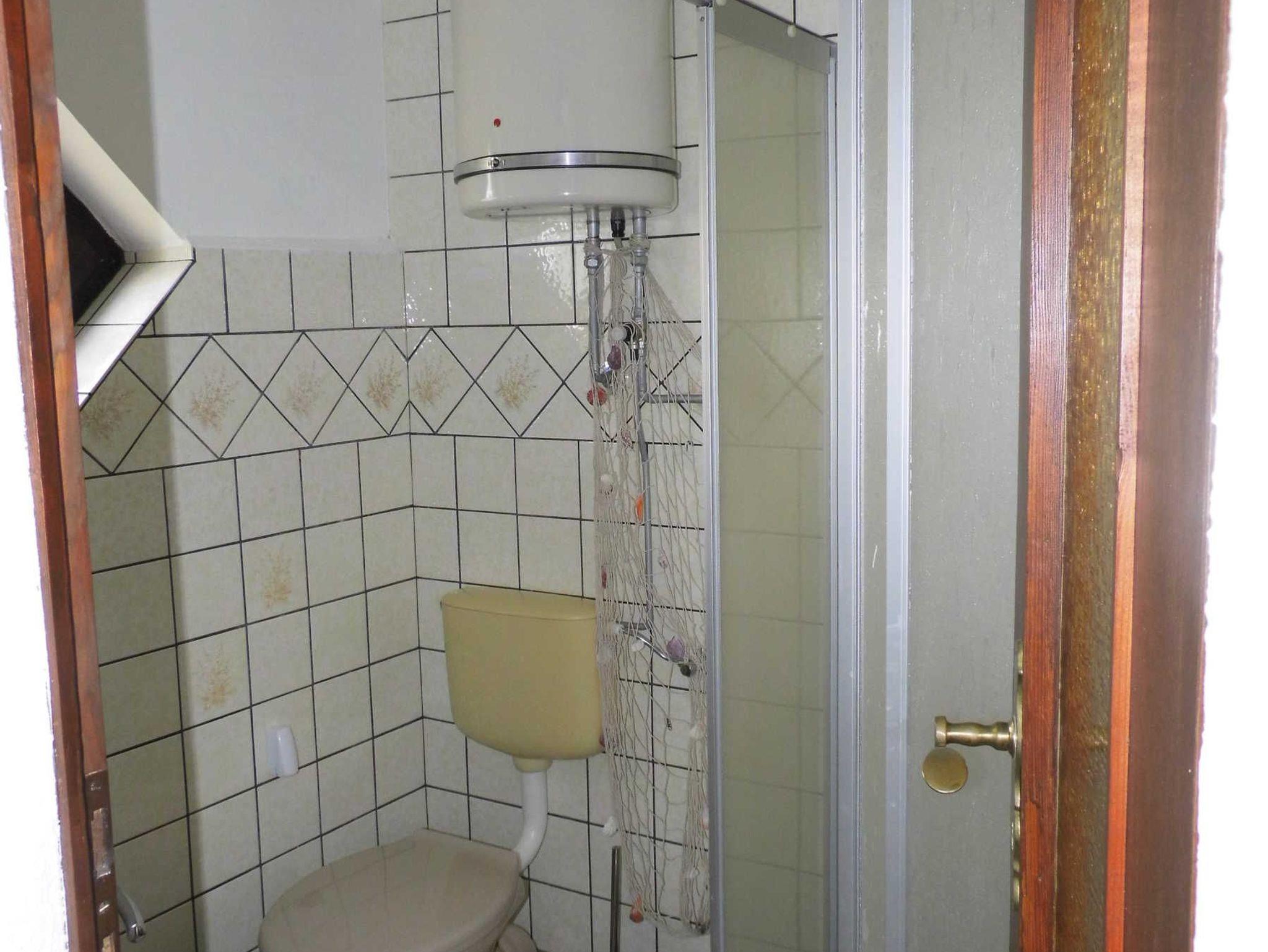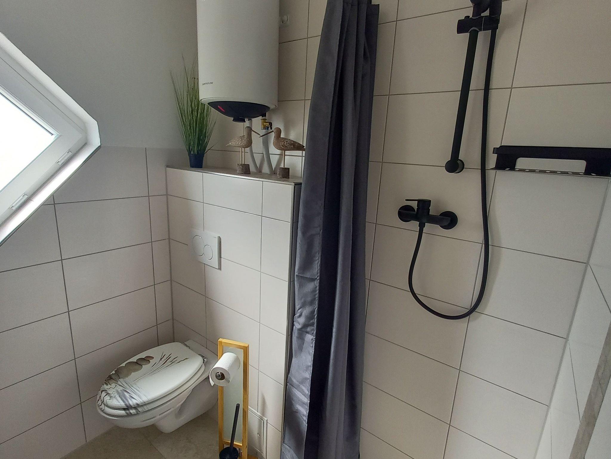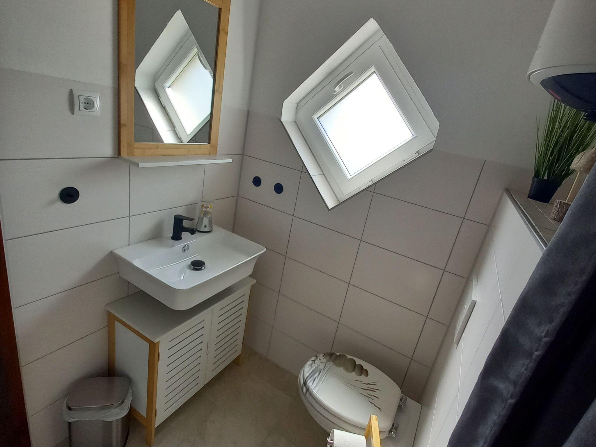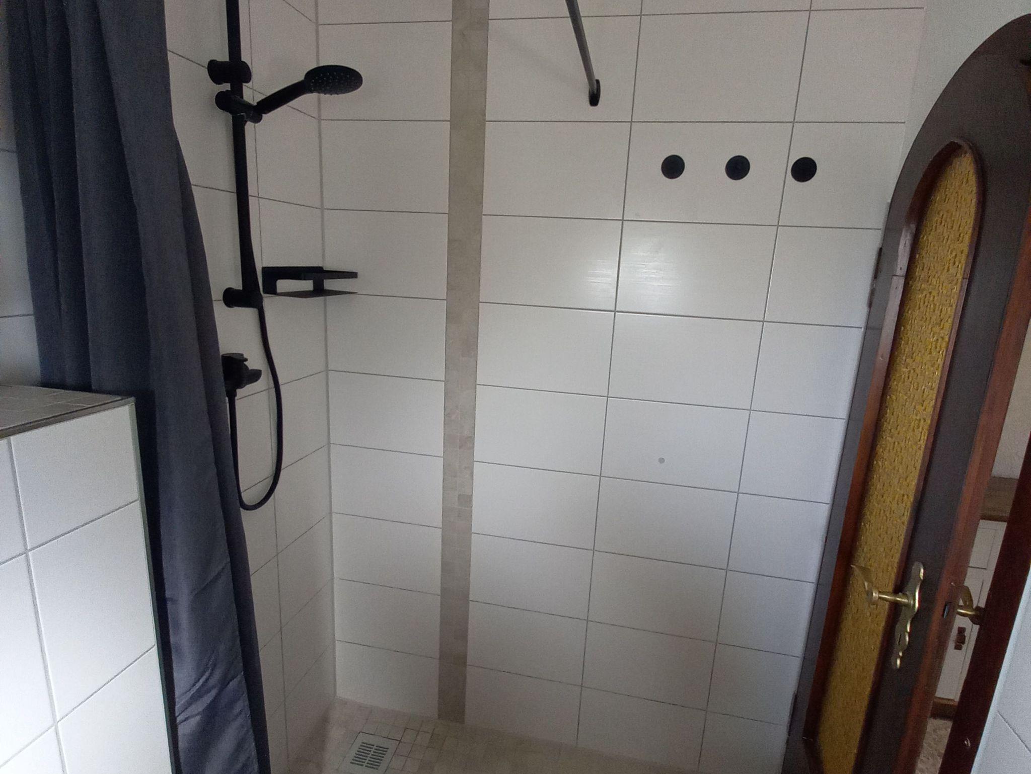 Vom Flur kommt man auch in das Bad. Dort befindet sich eine Dusch, WC und ein Handwaschbecken, Stauraum für Kosmetika, inkl. ein Fön und Wäscheständer.