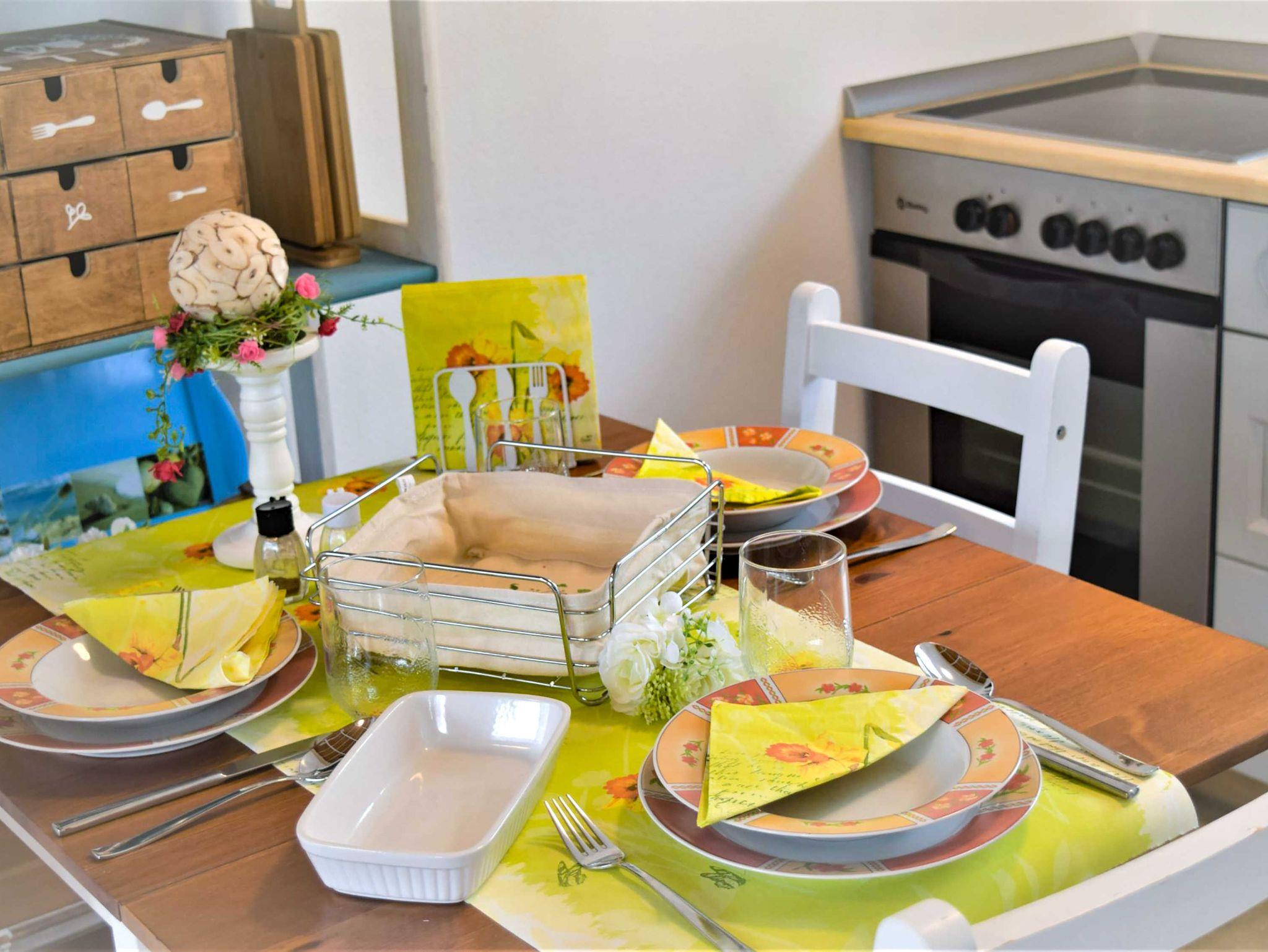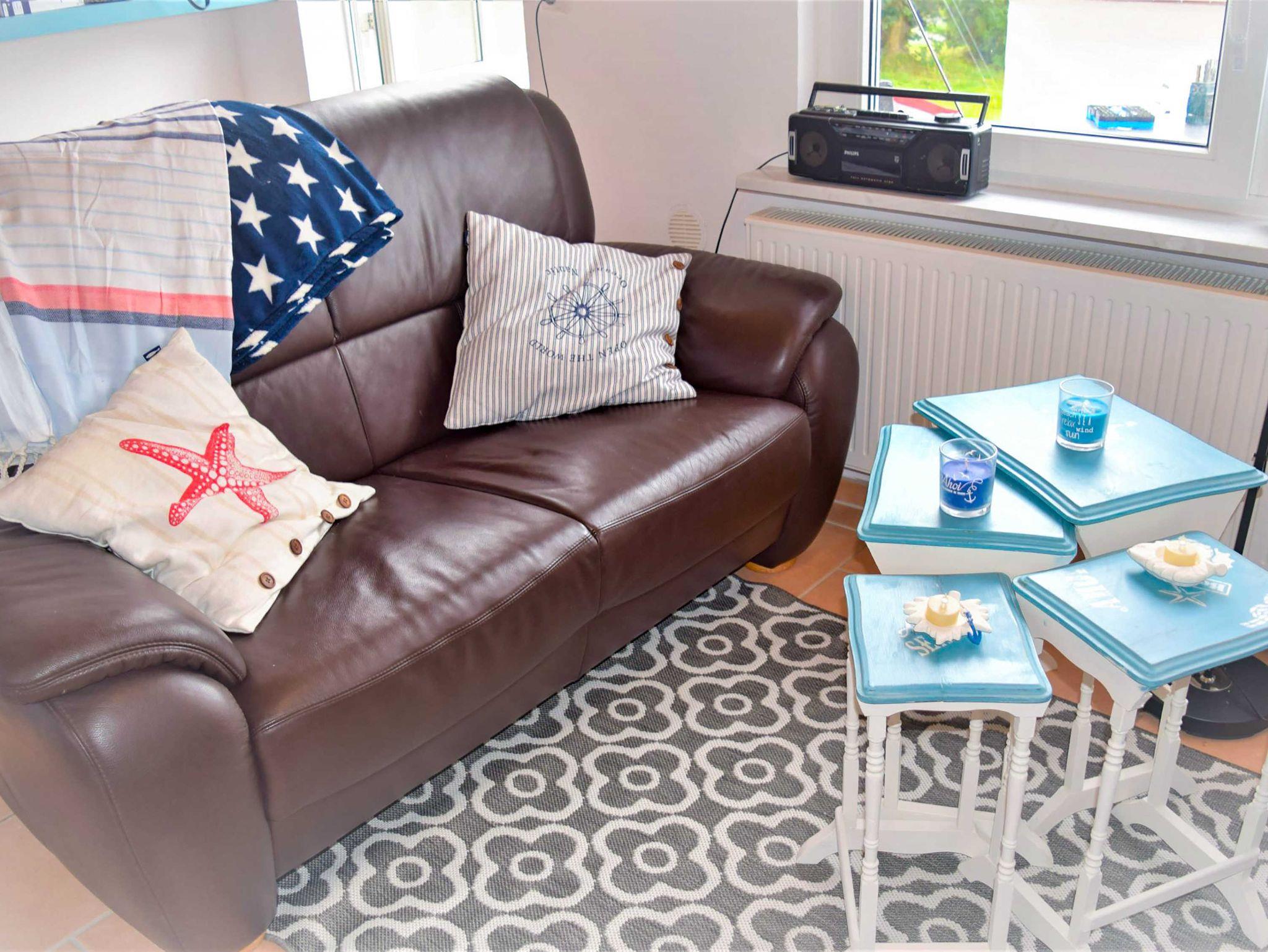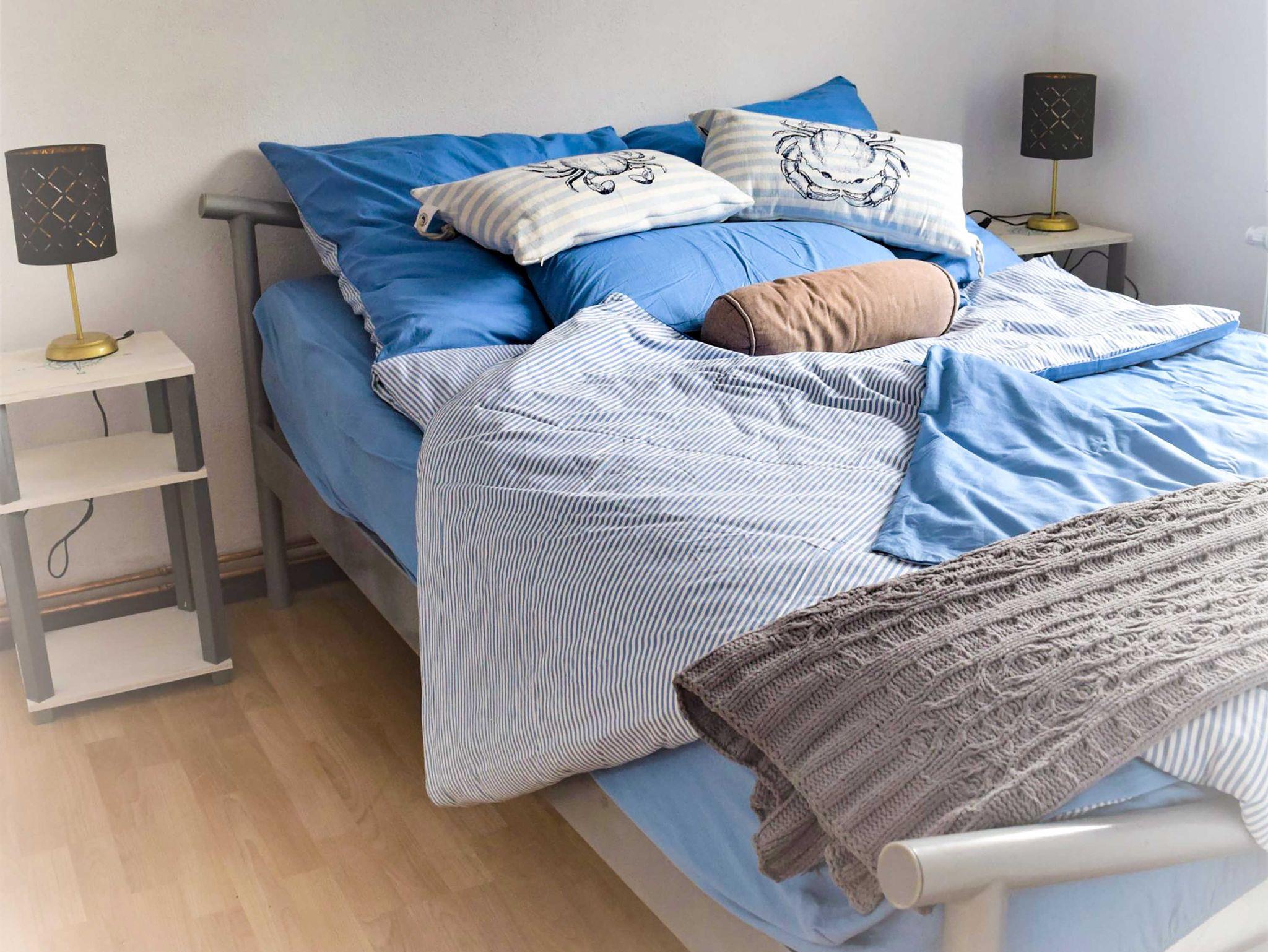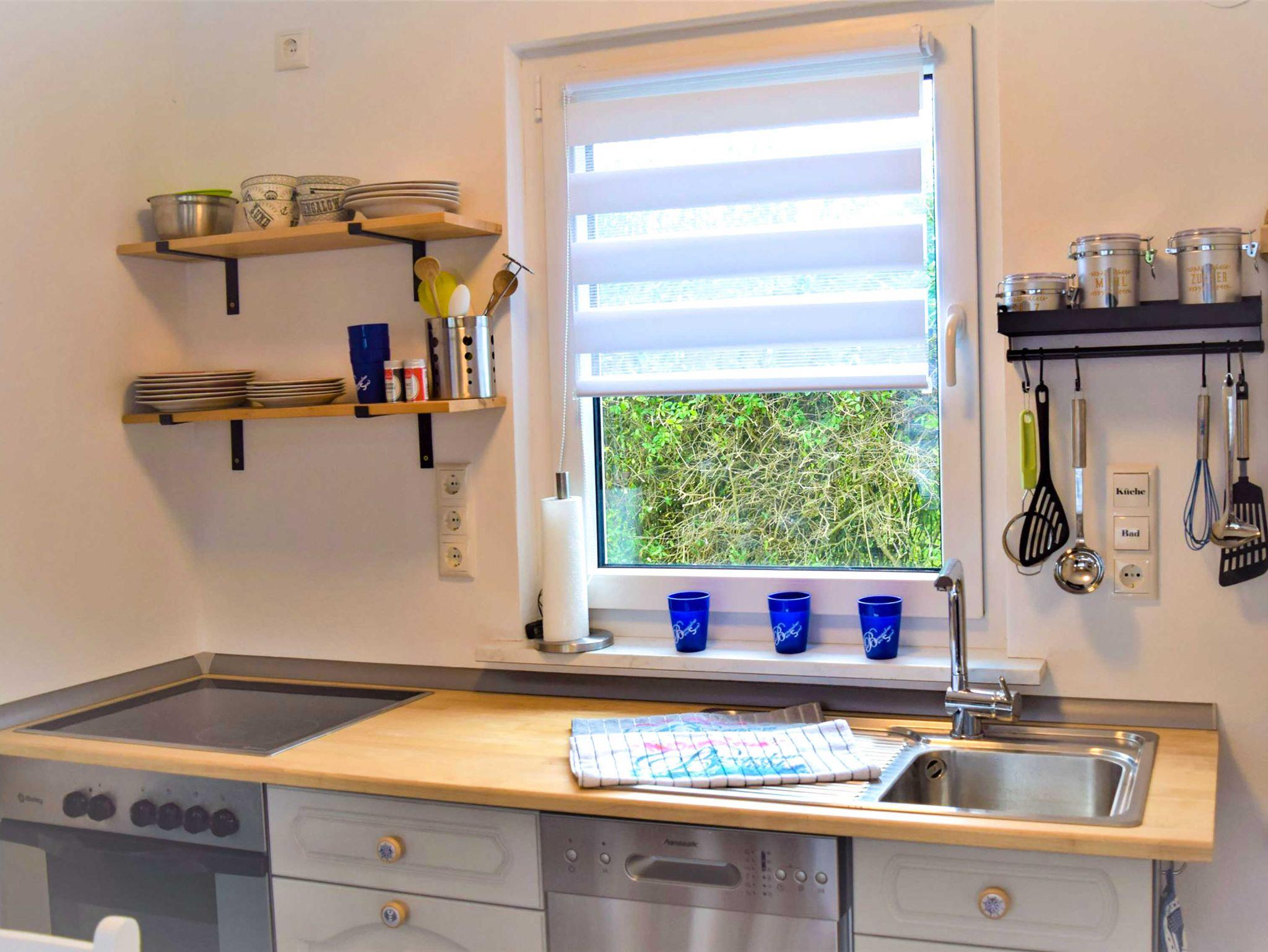 Das offene Wohnzimmer mit Fernseher sowie Radio und die voll ausgestattete Küche mit Kaffeemaschine, Toaster, Wasserkocher, Geschirrspüler, Herd, Backofen und einem Kühlschrank mit Gefrierfach laden zum ausgedehnten Frühstück oder Spieleabend ein. Es stehen Ihnen zwei helle Schlafzimmer mit einem Einzelbett (90x190) und einem Doppelbett (140x200) zur Verfügung. Die Zimmer sind ohne Türen miteinander verbunden. Es gibt lediglich eine verschließbare Tür zum Bad, ausgestattet mit Dusche und WC.