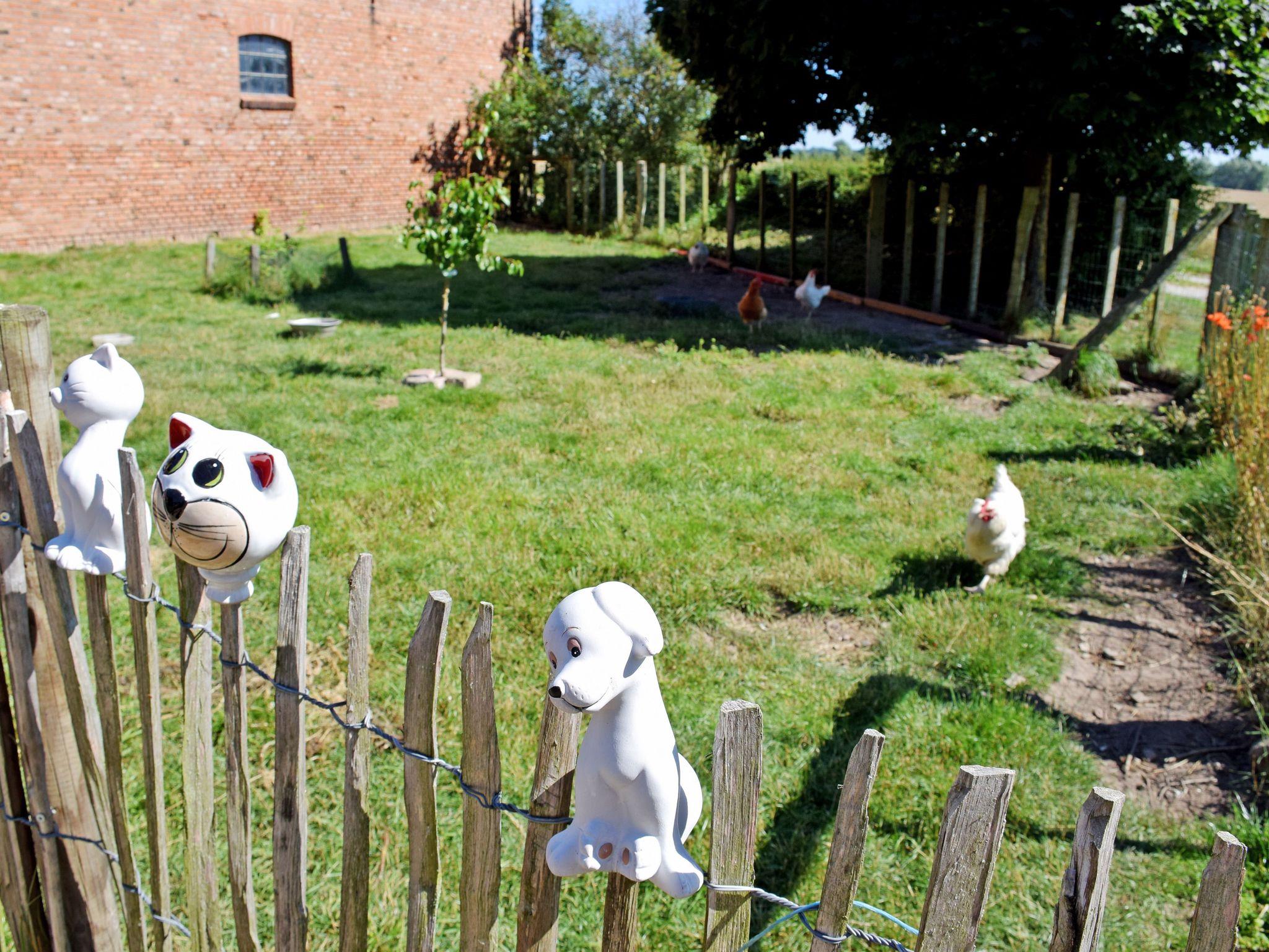 Im hinteren Bereich des Gartens gibt es eine kleine Spielecke, wir haben auch einen kleinen Streichelzoo mit Hühnern, niedlichen Kaninchen und dem Dackel Paule. Gern können wir Ihnen, je nach Vorrat, frische Eier zum Frühstück verkaufen.