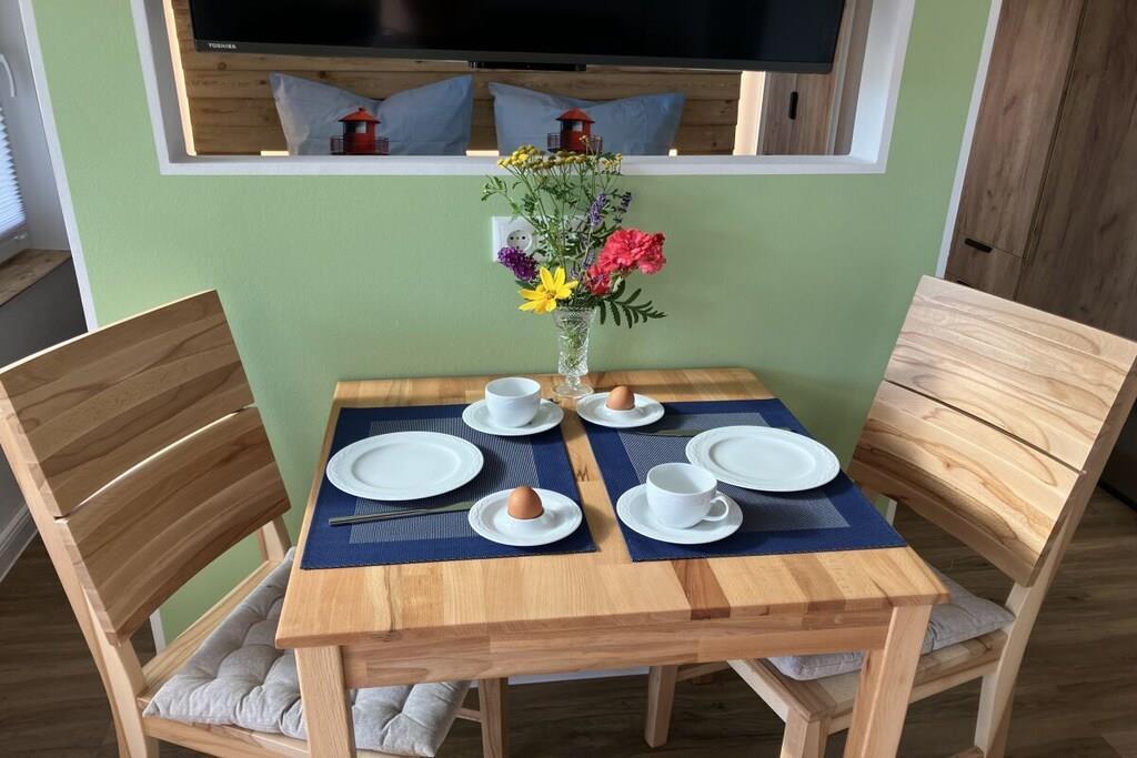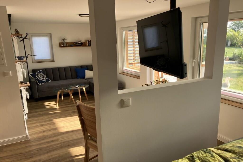 Nur 400 m zum Tremter Naturstrand! Der komplett neue 1- Zimmer-Bungalow "Hühnergott" wurde bis 9/24 grundsaniert, bis auf die Mauern ist alles erneuert worden. Das Tiny-Haus mit Echtholz-Verkleidung und einer grosszügigen Veranda aus Lärche ist nach Westen ausgerichtet und hat eine gesamt-Wohnfläche von insgesamt 32 m2, davon ca 25 m2 im Innenbereich und eine grosszügige überdachte Veranda von 15 m2 Nutzfläche (zu 1/2 angerechnet). Die Massivholz-Veranda ist windgeschützt, möbliert und rechts und links mit beweglichen Holzjalousien ausgestattet. Ein eigener Gartenbereich von ca. 50m2 steht zur Verfügung und ein Parkplatz befindet sich direkt neben dem Gebäude. Der Bungalow befindet sich auf unserem privaten Grundstück (3400 m2) mit einem 2-Familienhaus, in dem wir wohnen und sich noch eine Ferienwohnung befindet. Das Grundstück ist komplett sicher auf 1,60 eingezäunt. Alle Möbel und Einrichtung etc ist neu, die Wände und das Dach sind gedämmt, die Fenster sind 3-fach verglast; die Vermietung startete im September 2024. Der Fernseher ist drehbar und vom Bett, Sofa oder Küche aus zu nutzen, je nach Wunsch. Alle Fenster haben ein Plissee und es gibt 2x Fenster mit Fliegengitter. Die Küche lässt keine Wünsche offen und ist mit Geschirr, Töpfen, Besteck, Kaffeemaschine, Toaster, Eierkocher, Wasserkocher, Kühlschrank, Kochfeld und einer Heissluft-Fritteuse uvm. gut ausgestattet. Am Doppel-Bett (1,60) aus massivem Eichenholz (mit neuer Matratze und Lattenrost) gibt es eine Echtholz-Lärchenvertäfelung für ein gutes Schlaf-Klima. Das Bad ist neu gefliest und mit einer 90cm Dusche komfortabel eingerichtet. Wir wohnen auf dem Grundstück und stehen Ihnen bei Fragen oder Tips gern zur Verfügung. Zu den Kosten: - Ein Hund bis 15 KG darf gerne hier wohnen für 5,-/Nacht. - Die Heizung ist elektrisch (Infrarot- und Konvektorheizungen ohne Gebläse, im Bad in Form eines Handtuchheizkörpers) - im Sommer sind die Stromkosten ca. 1-3 Euro pro Tag, bei niedrigeren Temperaturen ist mit Stromkosten in Höhe von ca. 4-8 Euro pro Tag zu rechnen. Der Strom wird am Ende des Aufenthalts mit der Kaution (100,-) verrechnet, ein eigener Zähler befindet sich im Bungalow. 0,35/kwh Strom. - Verbrauchskosten: Wasser inklusive, Strom extra. - Wlan, Sat-TV und Parkplatz inklusive. - Die Endreinigungsgebühr von 50,- (professionelle Reinigungsfirma) ist obligatorisch - Bettwäsche und Handtücher stellen wir inklusive zur Verfügung (bezogene Betten). Bei Aufenthalten ab 2 Wochen tauschen wir die Bettwäsche/Handtücher auf Wunsch kostenfrei (wir stellen Ihnen ein Korb frischer Wäsche zum Tauschen hin). - keine Kurtaxe. Alle Preise inklusive 7% Mwst. Ein rundum gemütliches Tiny-Haus wartet auf Sie! Wir vermieten auf diesem Portal auch eine 95 m2 Maisonette-Ferienwohnung am gleichen Standort, für bis 4 Personen und bis zu 3 Hunde, Inserat Nr 457600