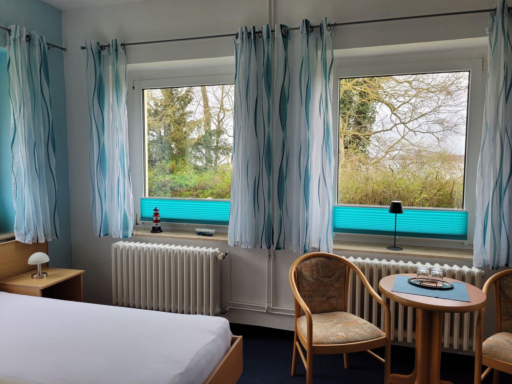 Unsere Doppelzimmer Seeblick liegen ruhig im Erdgeschoss und bieten einen wunderschönen Blick auf den Strelasund.