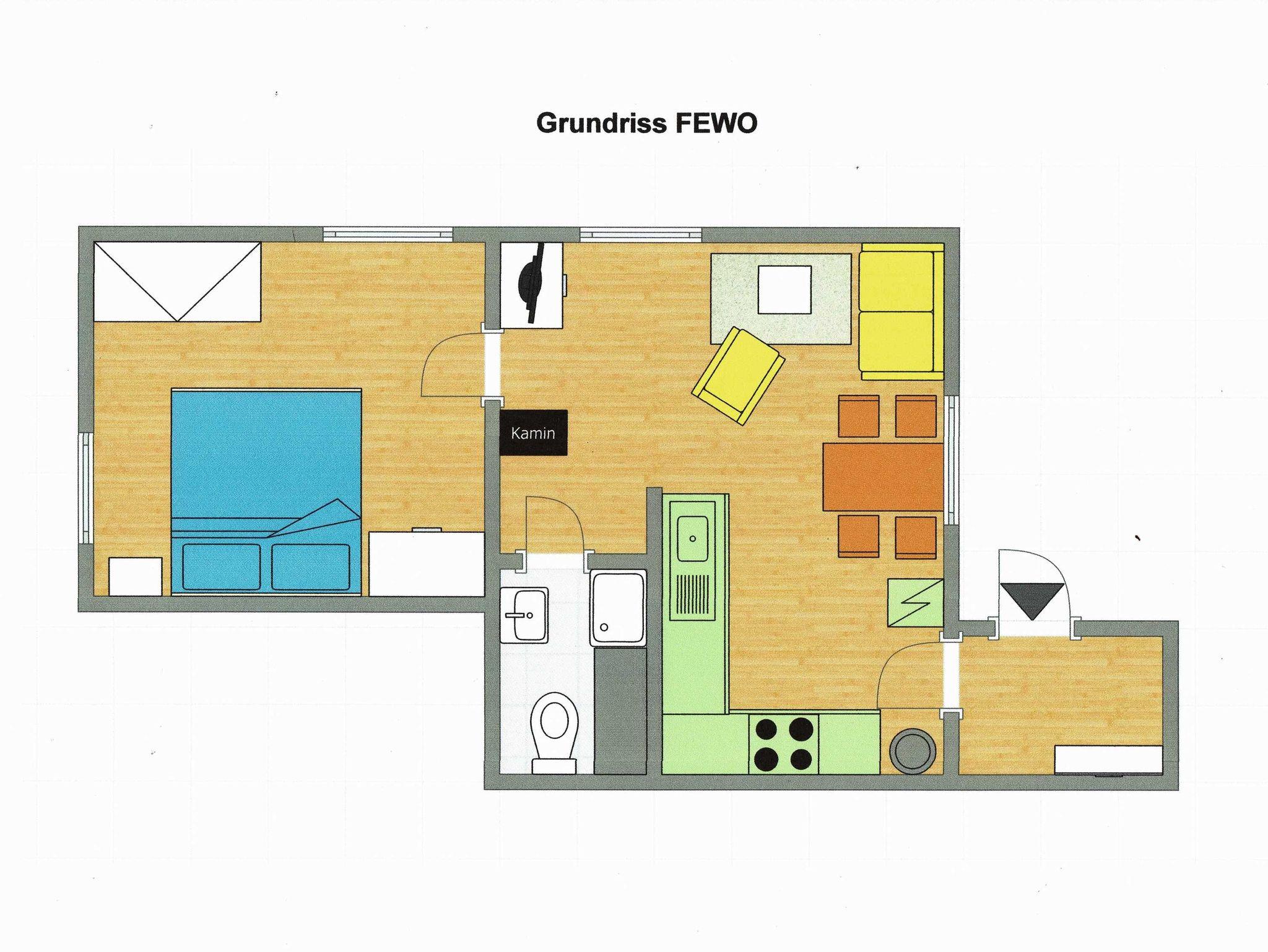 Die Ferienwohnung befindet sich im Haupthaus und hat ihren Eingang über eine großzügige Veranda. Auf ca. 45 m² bietet sie Platz für 2 bis 3 Personen und eine durchdachte Raumaufteilung: kleiner Flur, Wohnzimmer mit offener Küche und Essplatz, ein Schlafzimmer sowie ein Bad mit Dusche/WC. Der Kamin im Wohnbereich sorgt besonders in der kühleren Jahreszeit für eine gemütliche Atmosphäre.