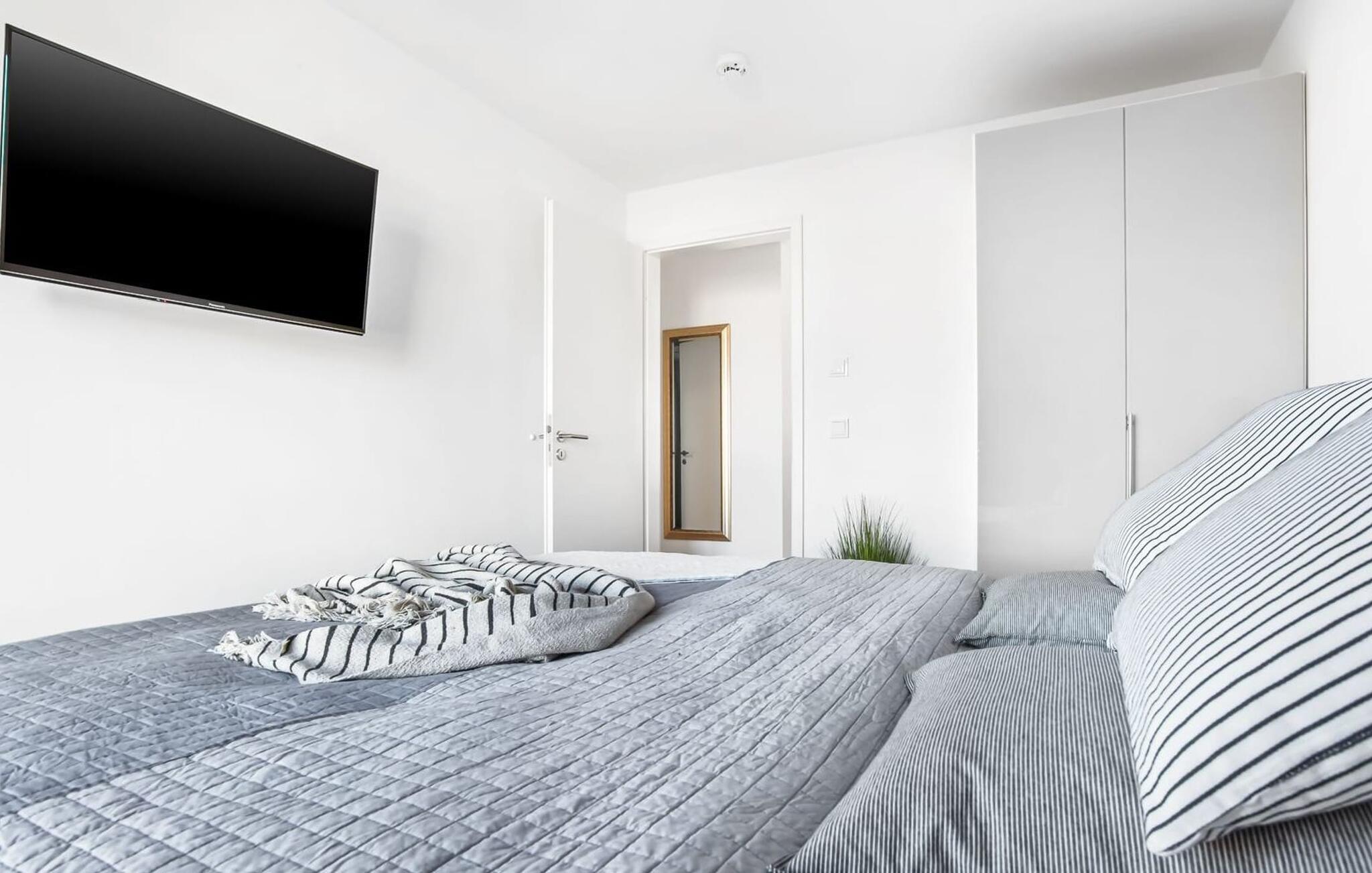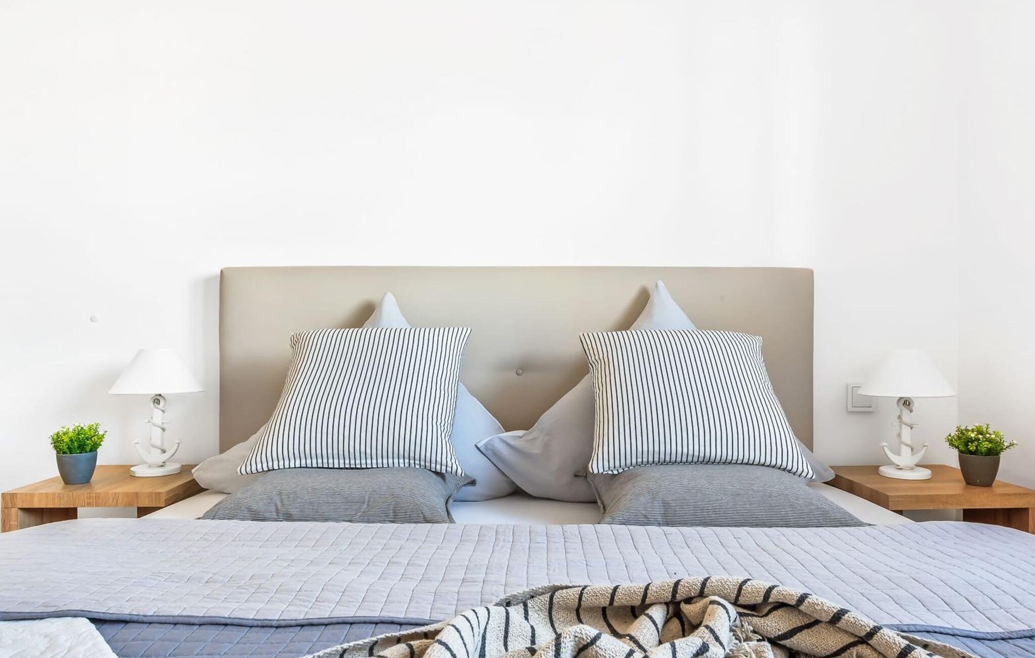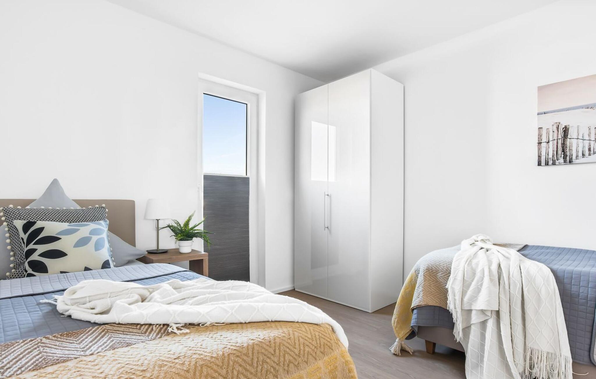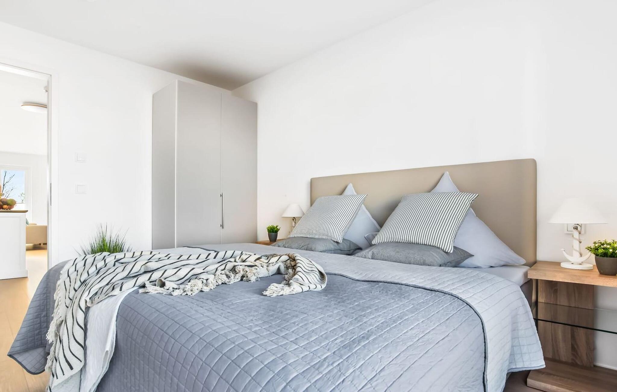 Für einen erholsamen Schlaf stehen zwei Schlafzimmer mit komfortablen Boxspringbetten bereit. Ein Schlafzimmer ist mit einem Doppelbett ausgestattet, während das zweite Schlafzimmer mit zwei Einzelbetten für angenehme Urlaubsträume sorgt.