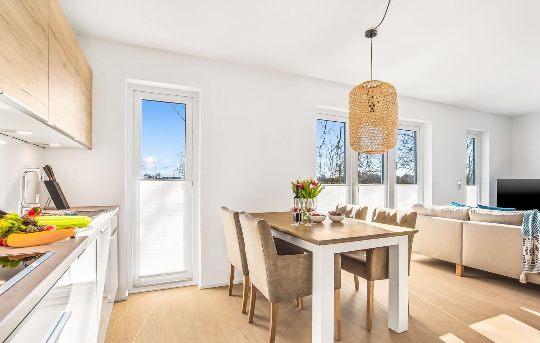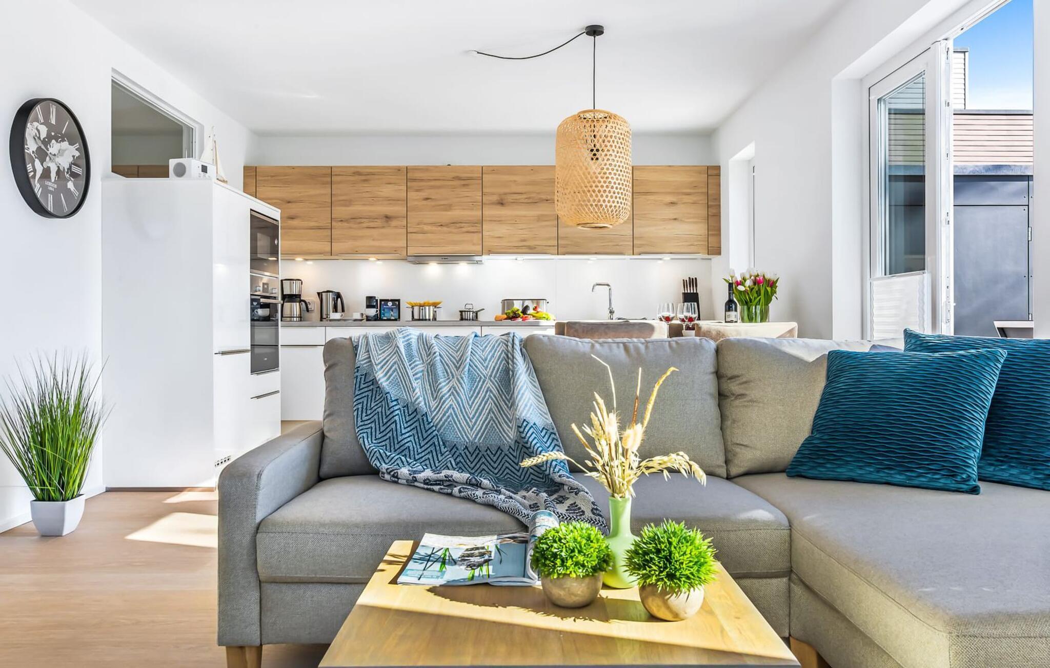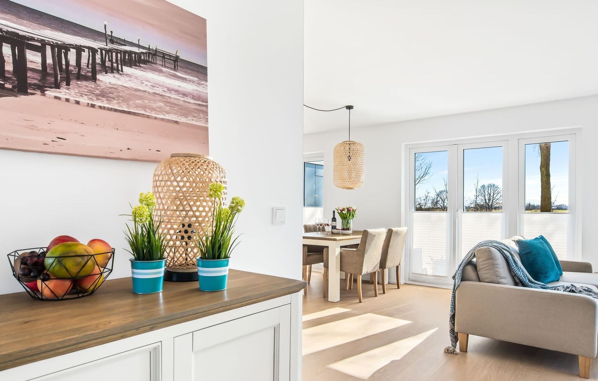 Mit seiner bodentiefen Fensterfront und der angrenzenden großen Terrasse ist der offene Wohn-/Essbereich das Herz der Wohnung. Genießt euren Urlaub und entspannt auf dem gemütlichen L-Sofa. Sollte das Wetter sich einmal von der nordischen Seite zeigen, sorgt der Kaminofen mit seinem prasselnden Feuer für weitere Behaglichkeit.