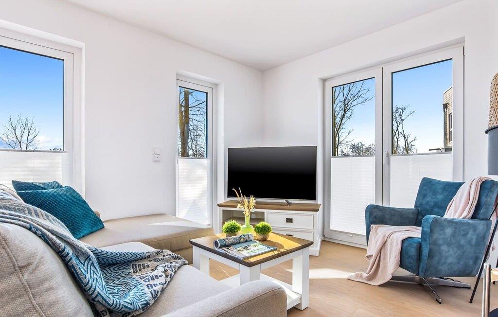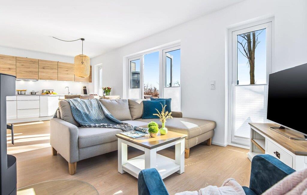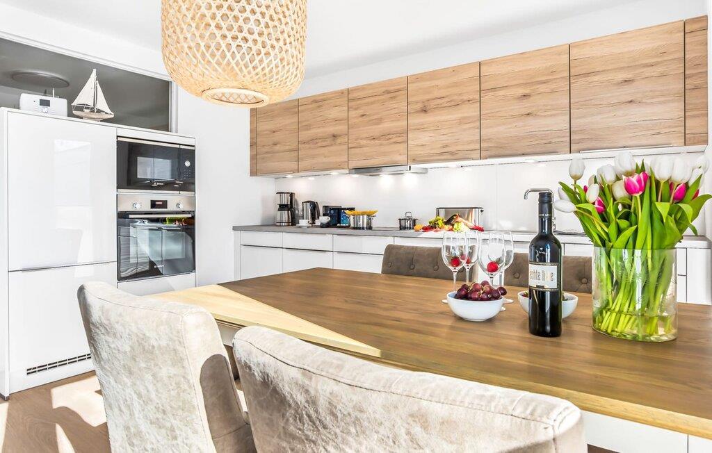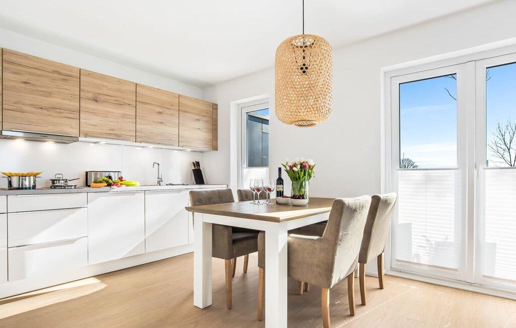 Mit seiner bodentiefen Fensterfront und der angrenzenden großen Terrasse ist der offene Wohn-/Essbereich das Herz der Wohnung. Genießt euren Urlaub und entspannt auf dem gemütlichen L-Sofa. Sollte das Wetter sich einmal von der nordischen Seite zeigen, sorgt der Kaminofen mit seinem prasselnden Feuer für weitere Behaglichkeit.