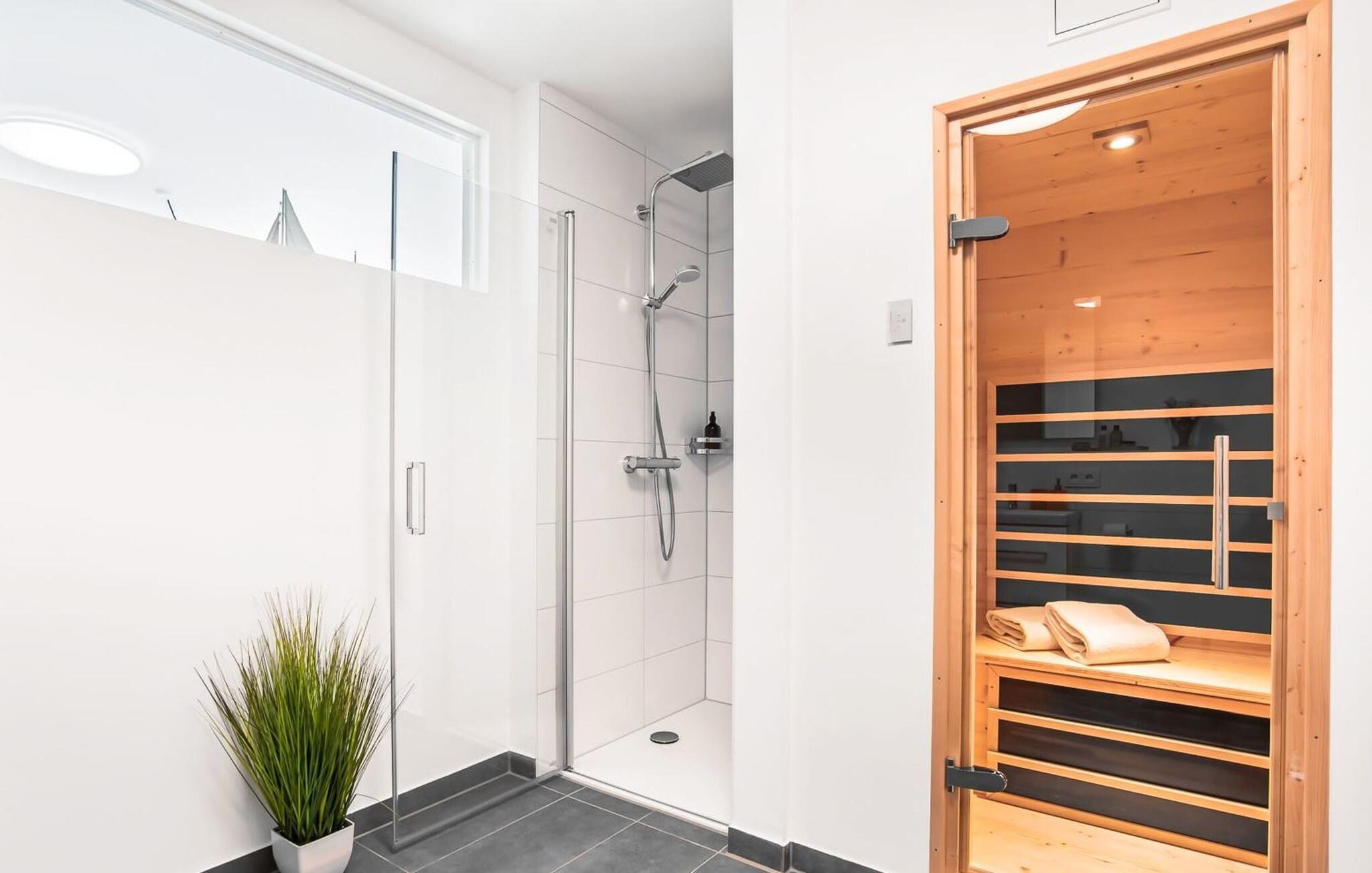 Das Wellnessbad mit der bodengleichen Regen-Dusche und der Infrarotsauna sorgt für einen rundum erholsamen Urlaub.