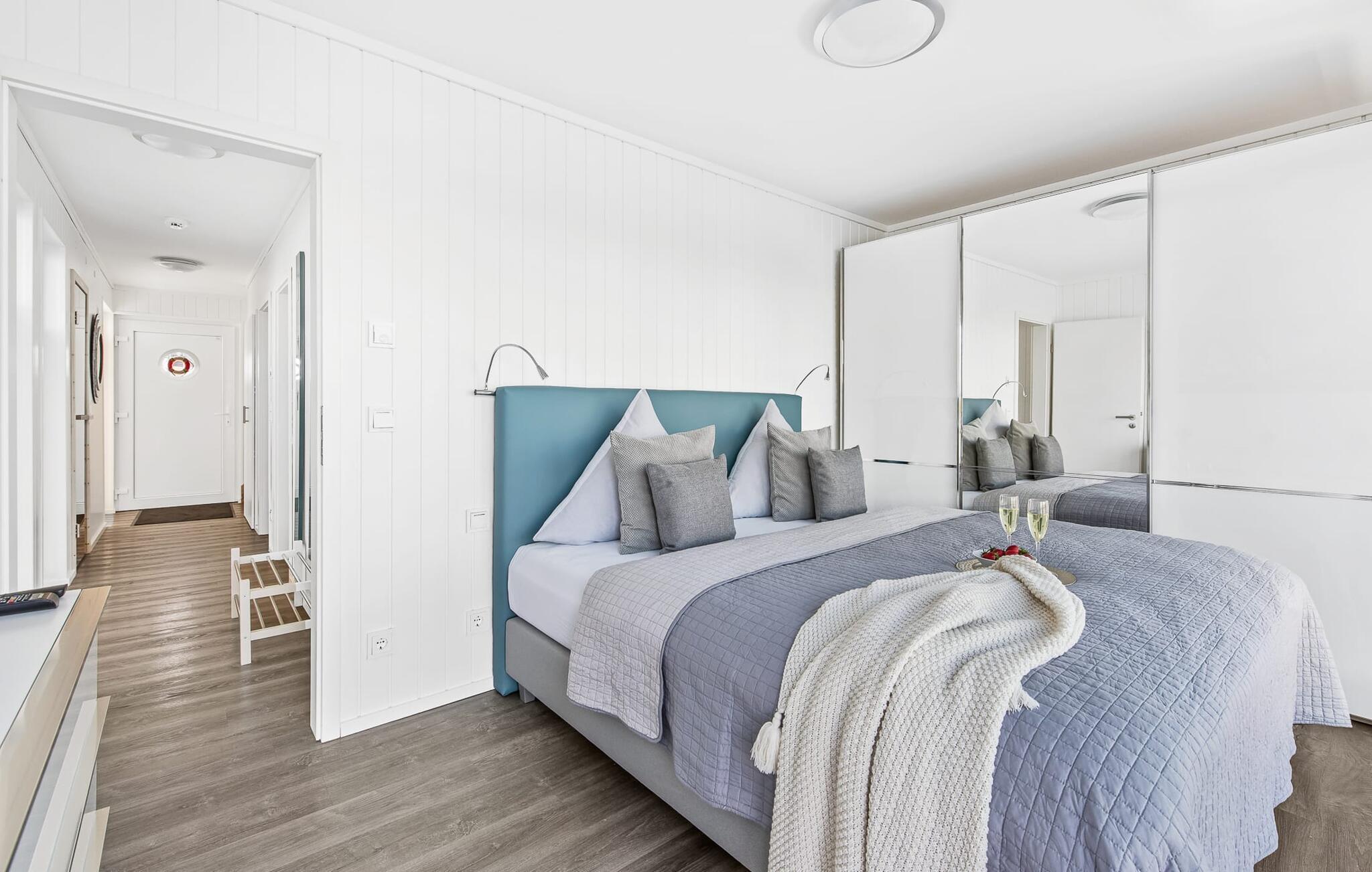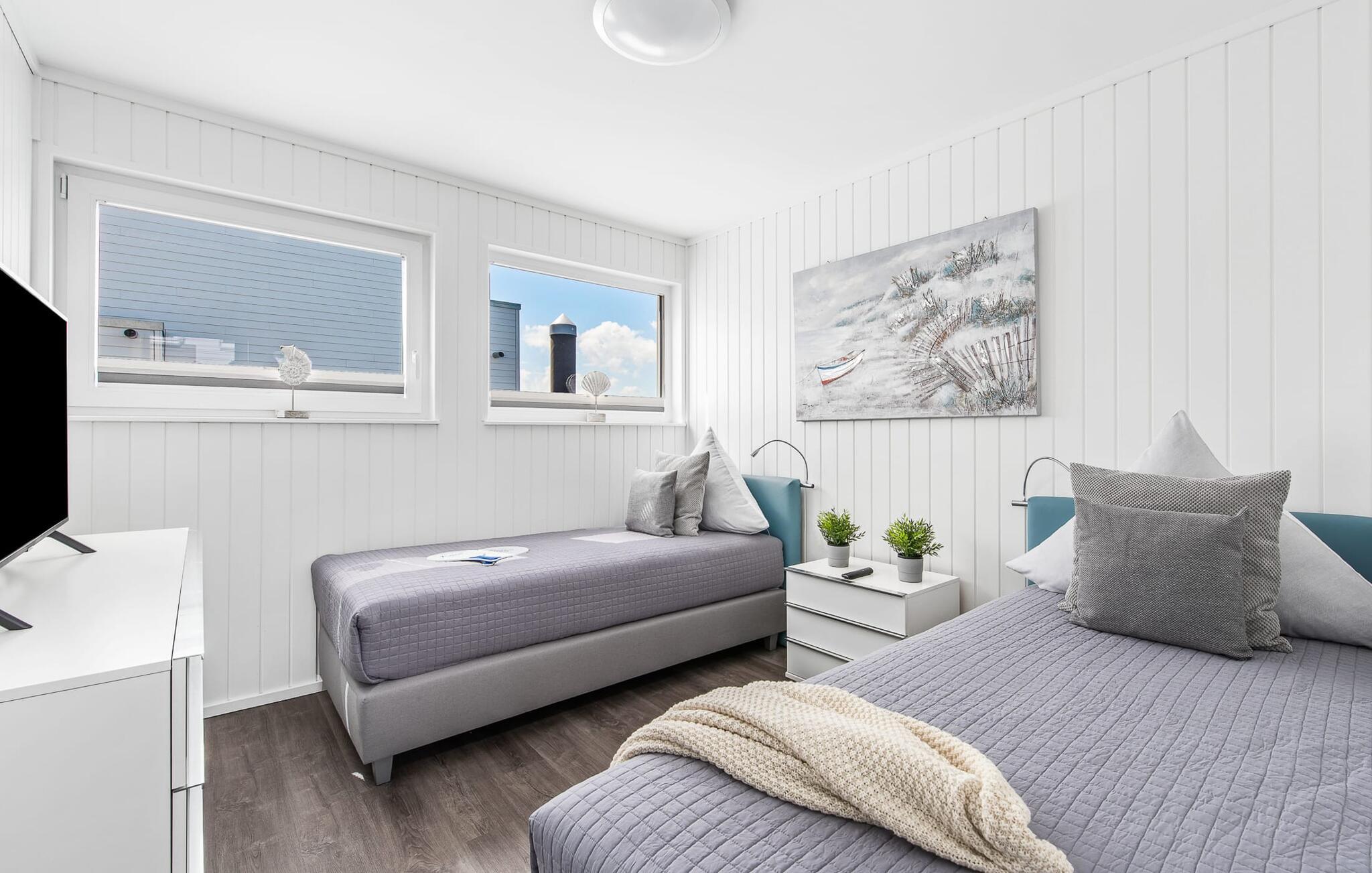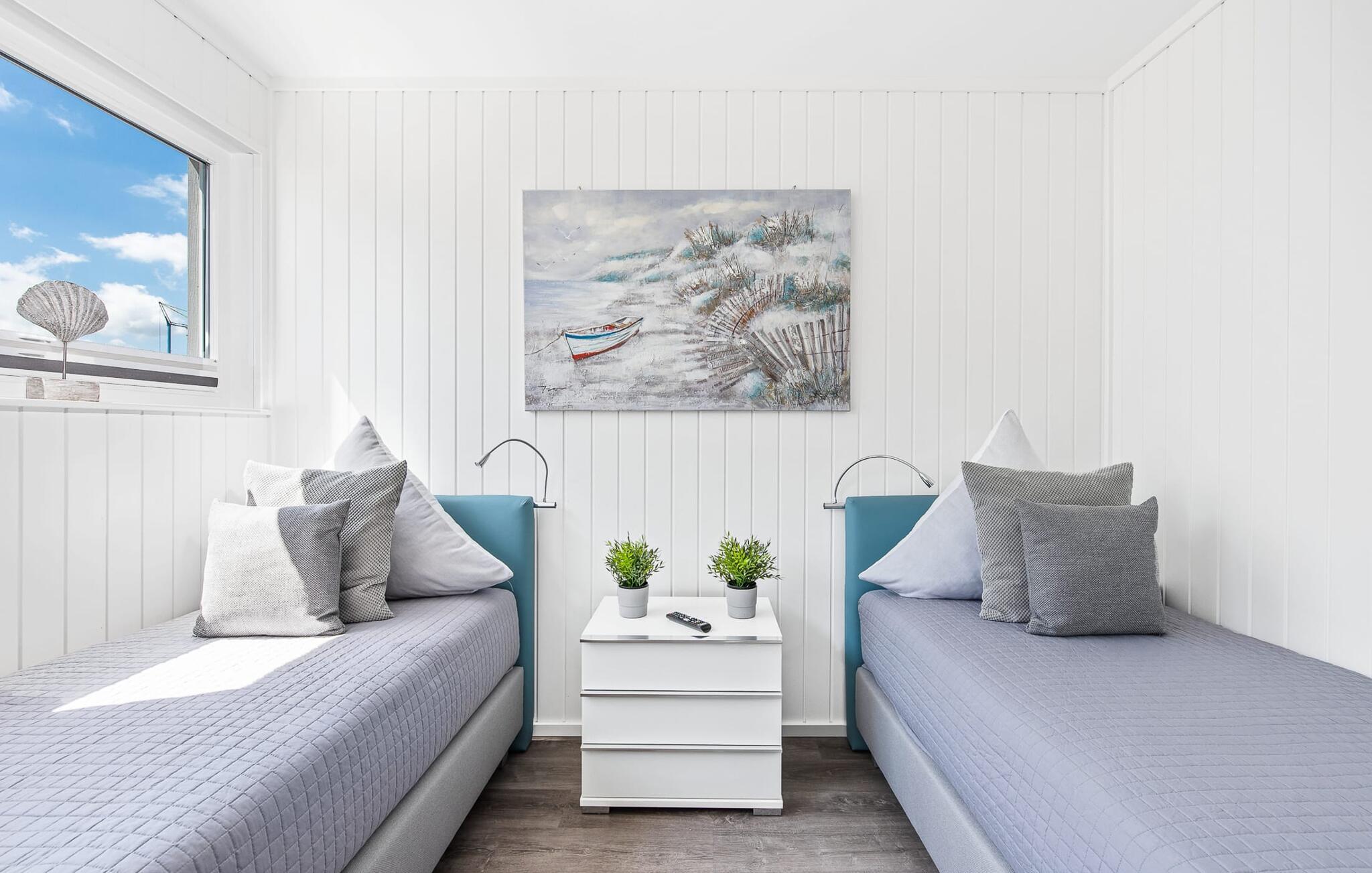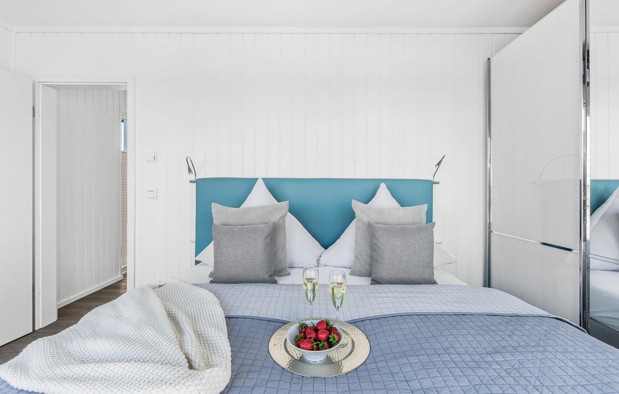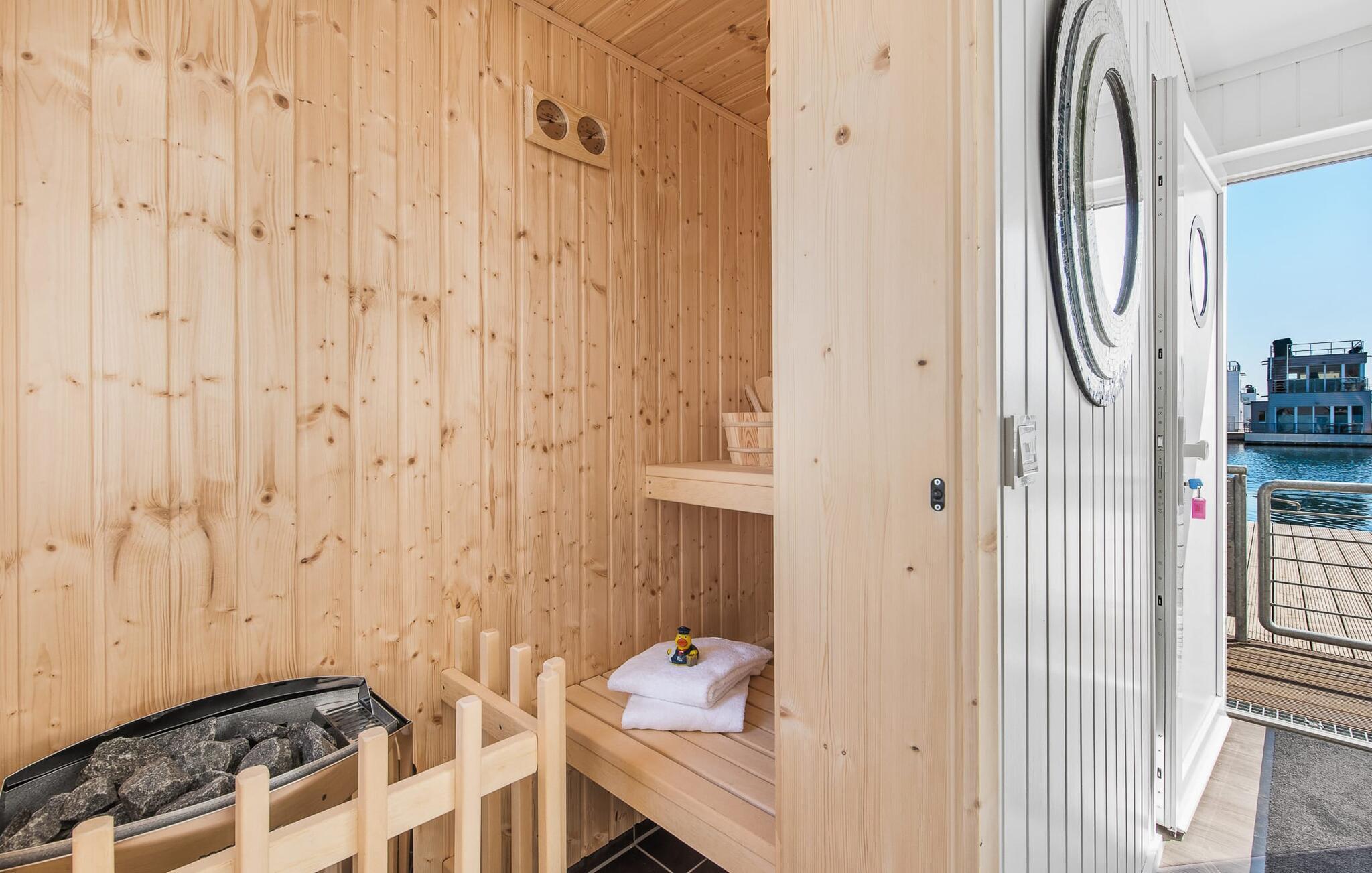 Der Ruhebereich des Hauses befindet sich im Erdgeschoss mit zwei Schlafzimmern, Badezimmer und Sauna. Das Hauptschlafzimmer punktet mit einer bodentiefen Panorama-Fensterfront, durch welche sich die atemberaubende Wasserkulisse genießen lässt und einer angrenzenden umlaufenden Terrasse. Beide Schlafzimmer sind mit Boxspringbetten ausgestattet und verfügen über Flatscreen-TVs mit Home Entertainment Programm.