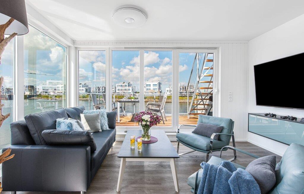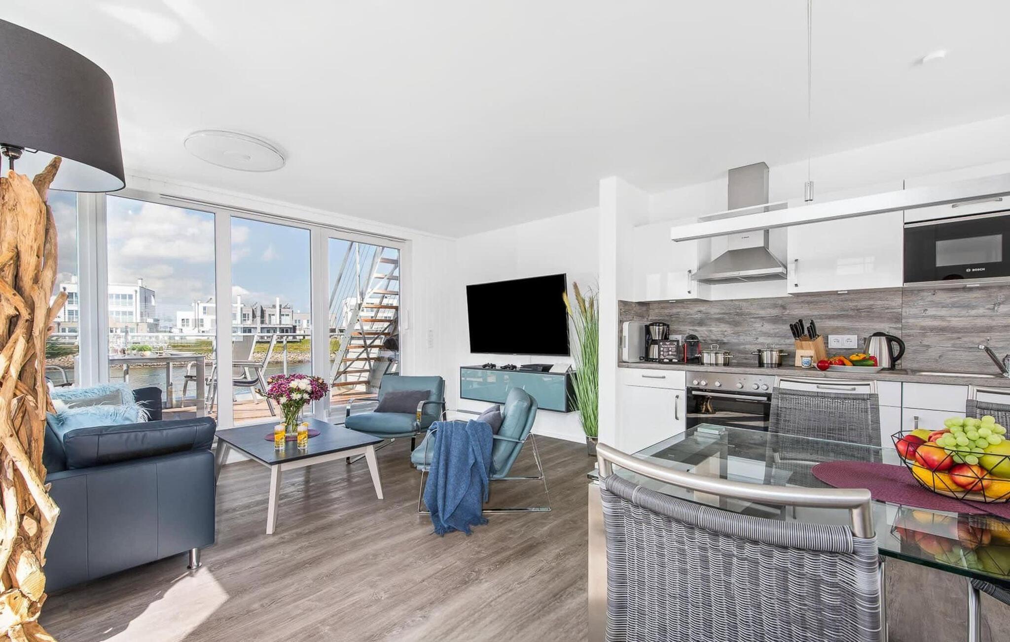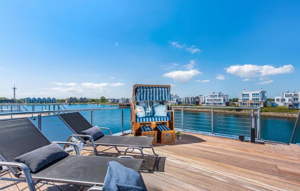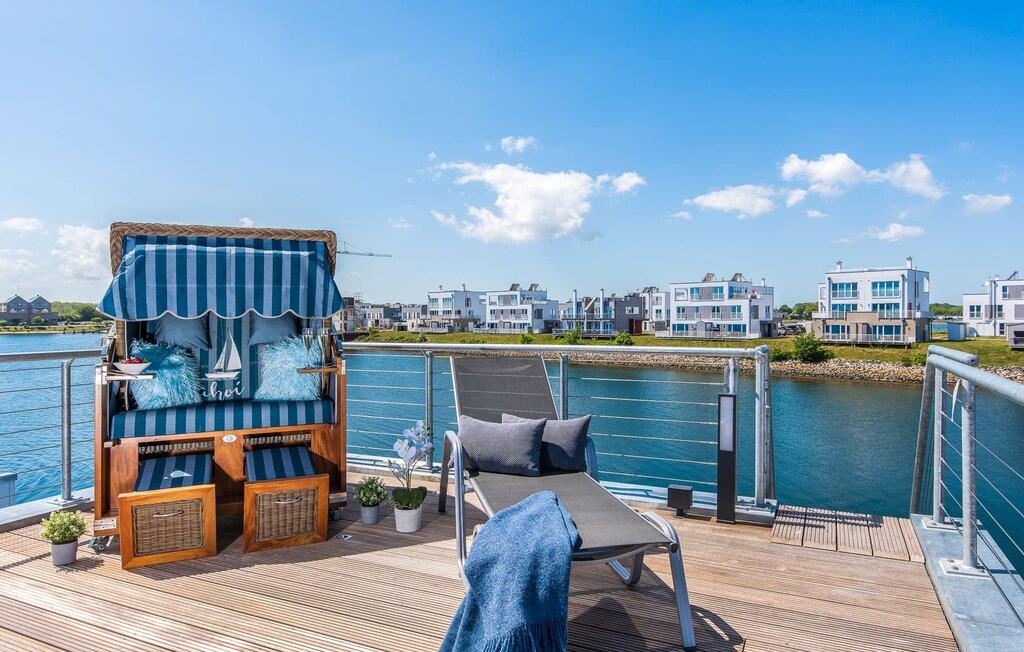 Wasser, wohin das Auge reicht. Durch bodentiefe Panorama-Fensterfronten lässt sich die atemberaubende Kulisse genießen und von der Dachterrasse bieten sich spektakuläre 360-Grad-Ansichten auf Schlei, Ostsee und Marina. Die Ostsee ist nur eine Badeleiter entfernt und der Sandstrand des OstseeResorts zu Fuß zu erreichen. In der dunklen Jahreszeit spenden Fußbodenheizung und Sauna wohligen Komfort, denn an Bord darf das Wellness-Programm nicht fehlen. Neben dem Hafenkino sorgt der Smart TV mit Home Entertainment Programm sowie eine PlayStation 4 für Unterhaltung.