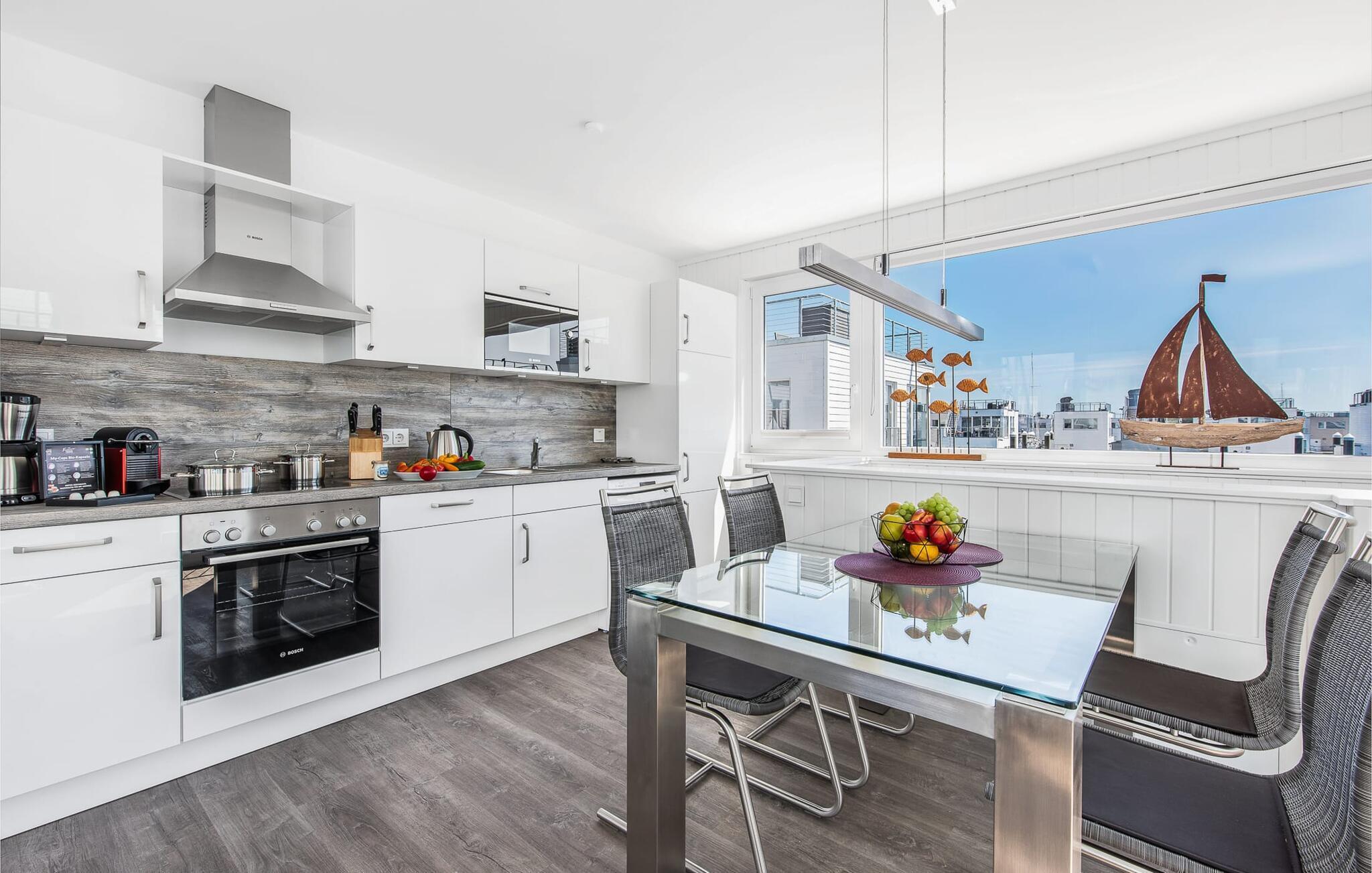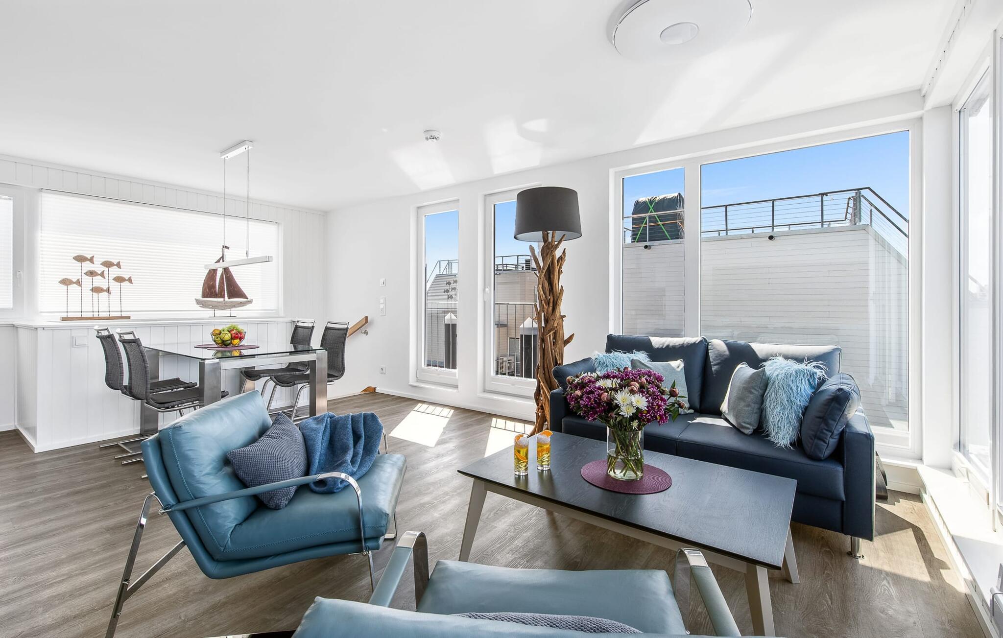 Das schwimmende Haus erstreckt sich über drei Ebenen. Im Obergeschoss befindet sich der offen gestaltete Wohn- und Essbereich mit Rundum-Wasserblick, voll ausgestatteter Wohnküche und angrenzender Terrasse. Von hier aus gelangt man auf die spektakuläre Dachterrasse mit Blick über den Segel- und Sportboothafen, die Schlei und deren Mündung in die Ostsee. Ausgestattet mit hochwertigen Gartenmöbeln inkl. Strandkorb und Lounge sowie Weber Elektrogrill bieten die Terrassen pures Urlaubsfeeling und atemberaubende Sonnenuntergänge.