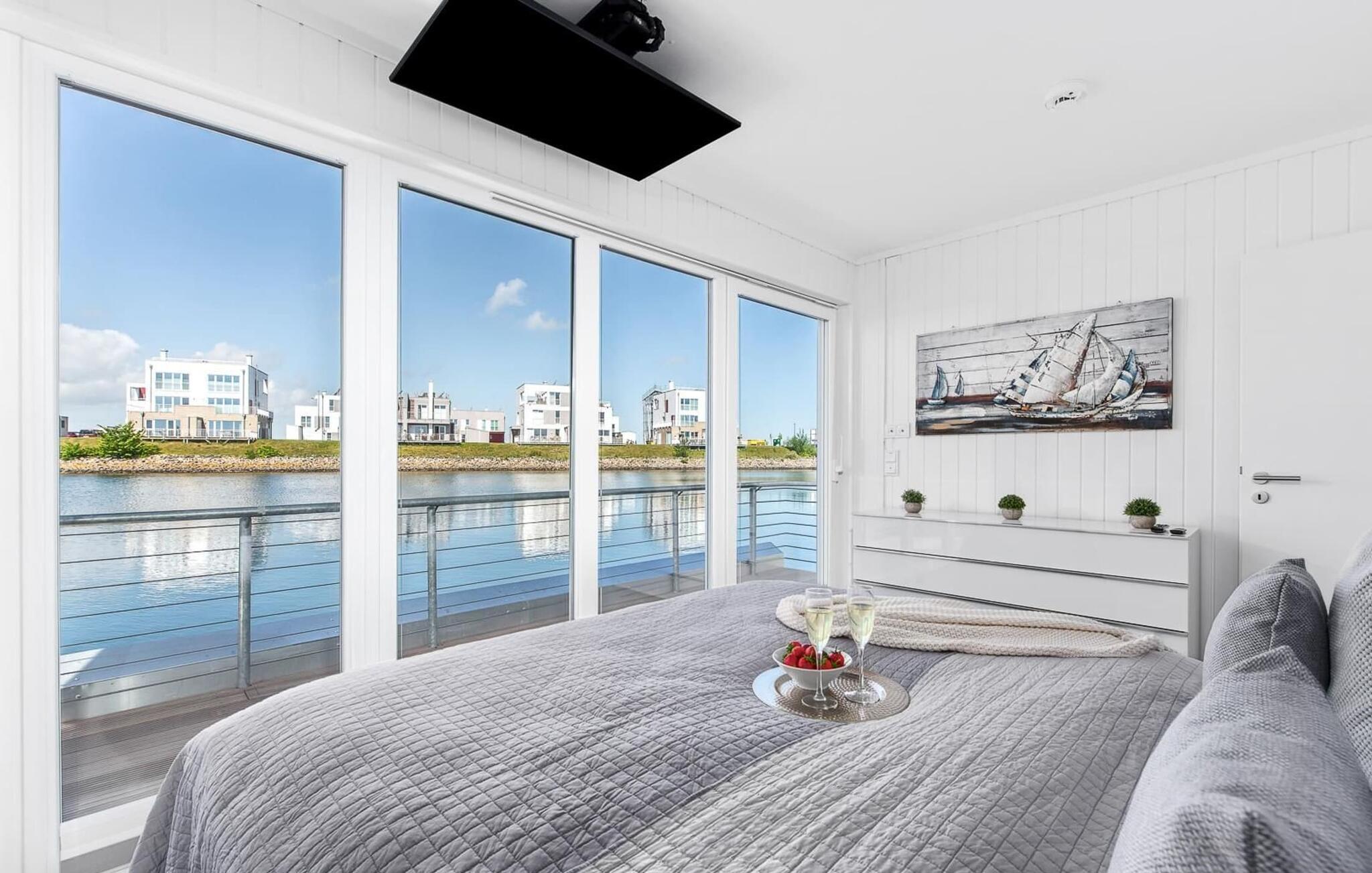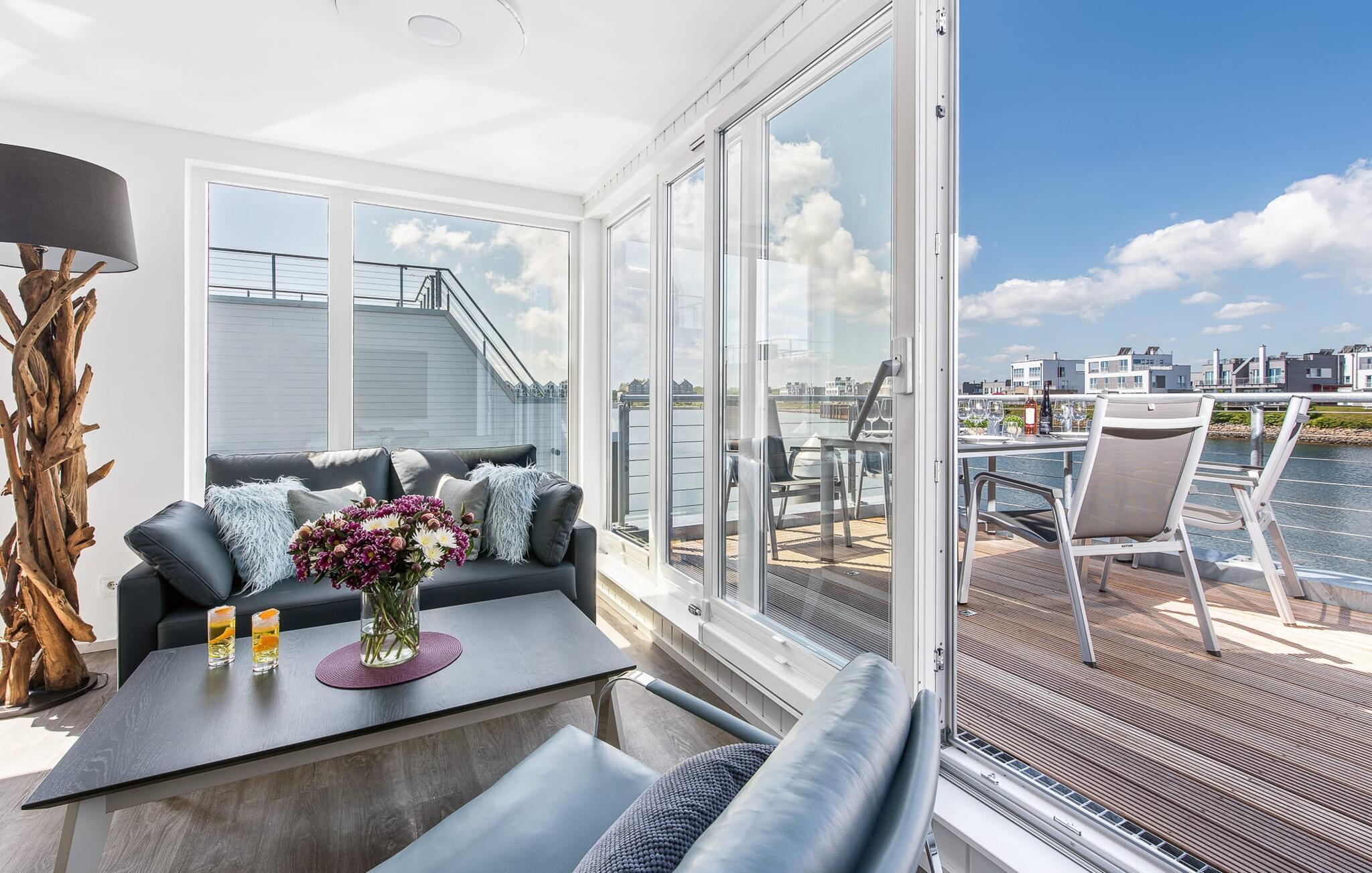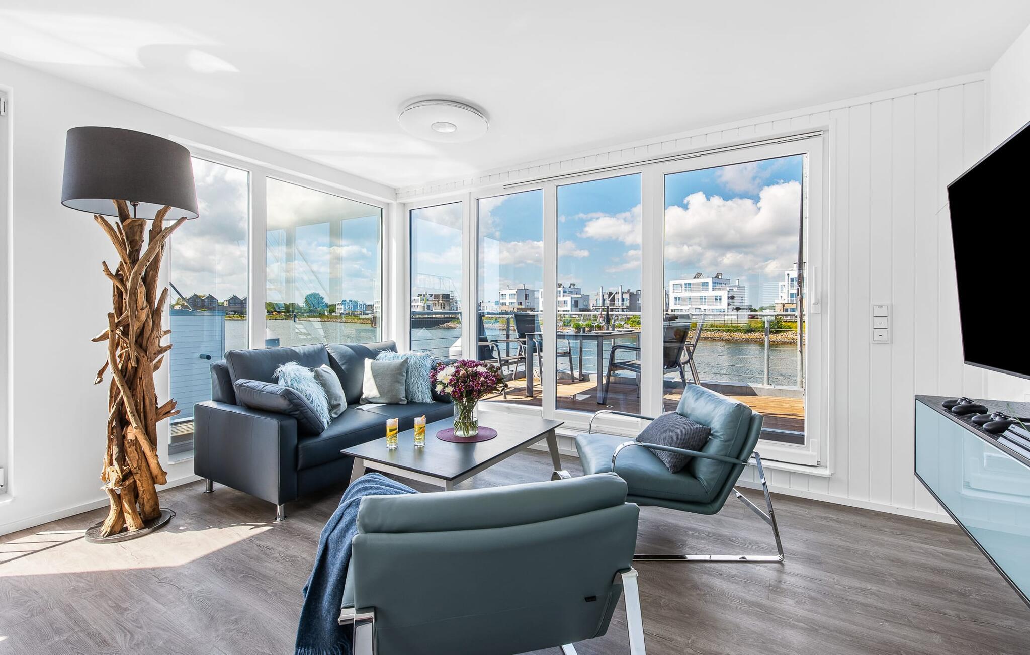 Erleben Sie Luxus und Natur in diesem schwimmenden Ferienhaus mit Panorama-Blick auf Ostsee und Schlei im OstseeResort Olpenitz.