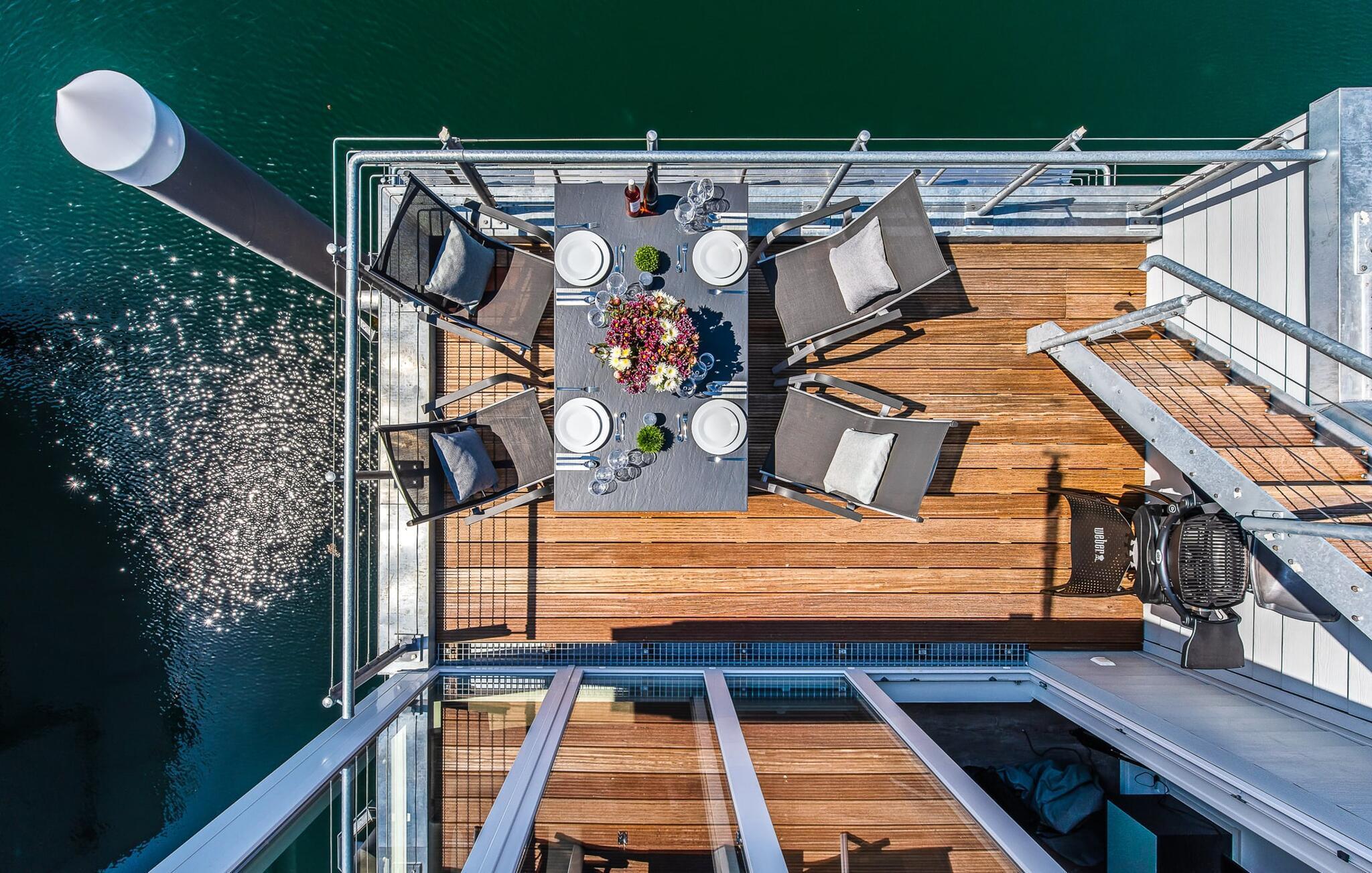 Unser Lieblingsplatz: Mit einem Sundowner auf der Dachterrasse entspannen und den Sonnenuntergang genießen. Bitte beachtet, dass es sich um ein schwimmendes Haus handelt und entsprechende Geräusche durch Strömungen oder Wellengang entstehen können.