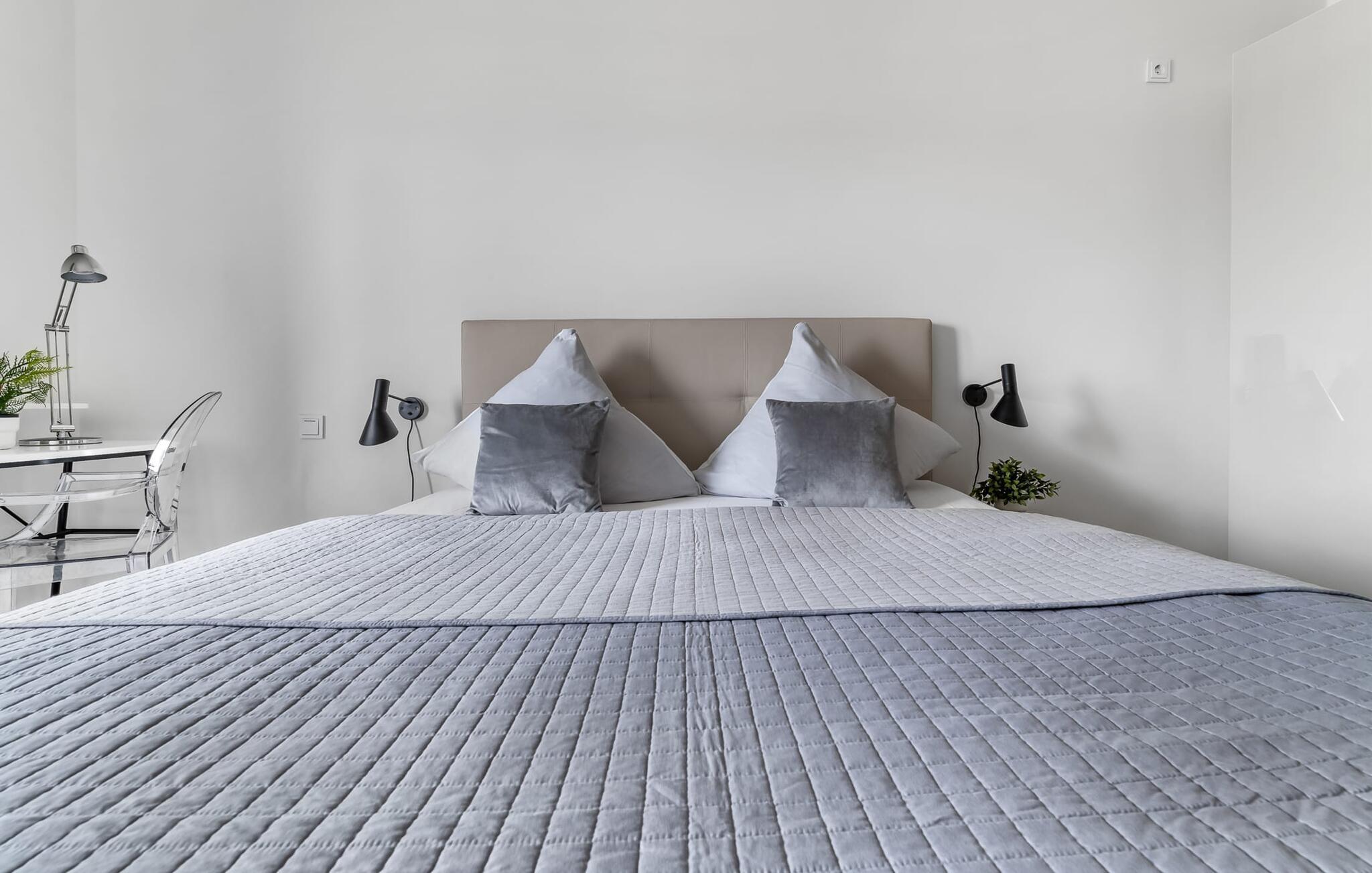 Beide Schlafzimmer bieten eine harmonische Verbindung von Komfort und Funktionalität. Ein Schlafzimmer verfügt über zwei gemütliche Einzelbetten, während das andere ein geräumiges Doppelbett bietet. Zusätzlich verfügt eines der Zimmer über einen eigenen Schreibtisch, der euch ermöglicht, mit kostenfreien WLAN direkt an der Ostsee zu arbeiten. Hier könnt ihr nach einem aufregenden Strandtag zur Ruhe kommen, während ihr den Abend mit den Smart-TVs oder der uneingeschränkten Sicht auf den Hafen aus beiden Zimmern ausklingen lasst.