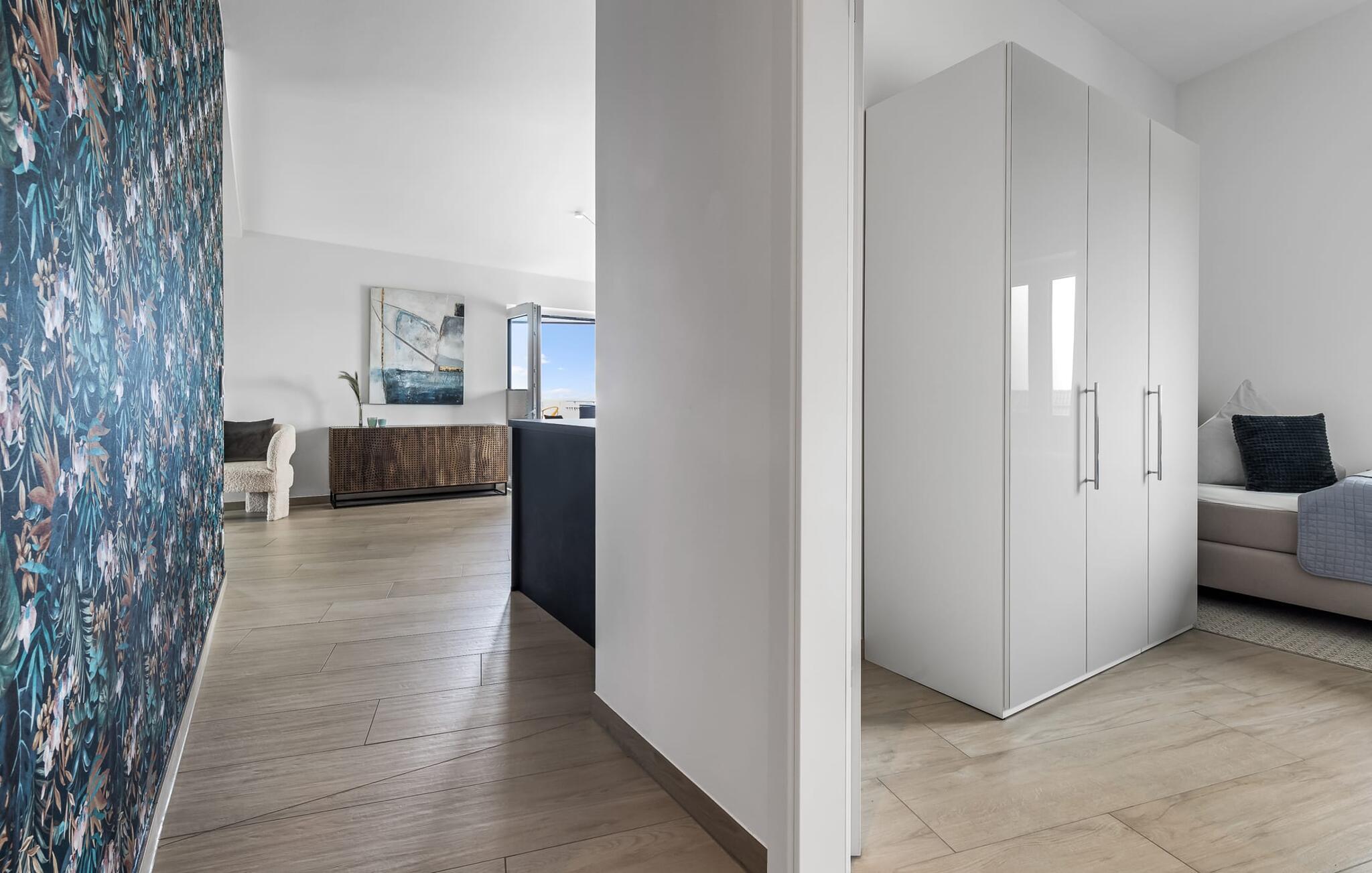 Die Fußbodenheizung in der gesamten Wohnung schafft eine gemütliche Atmosphäre und hüllt Sie an kühleren Abenden in Wärme. Ein reservierter Autostellplatz erwartet Sie direkt vor dem Gebäude und ermöglicht eine reibungslose Anreise. Für diejenigen, die Bequemlichkeit und Komfort suchen, bringt Sie ein Aufzug elegant in den dritten Stock, wo Ihre Oase der Ruhe auf Sie wartet. Dank des Fahrstuhls und des Parkplatzes direkt vor dem Haus sowie der großzügigen Räume ist Sunset Penthouse Teresa barrierefrei.