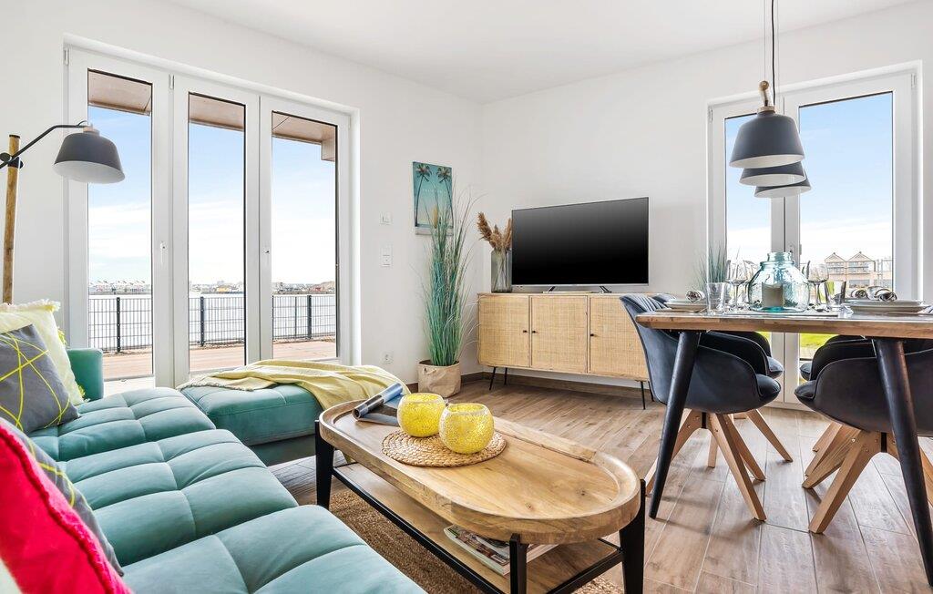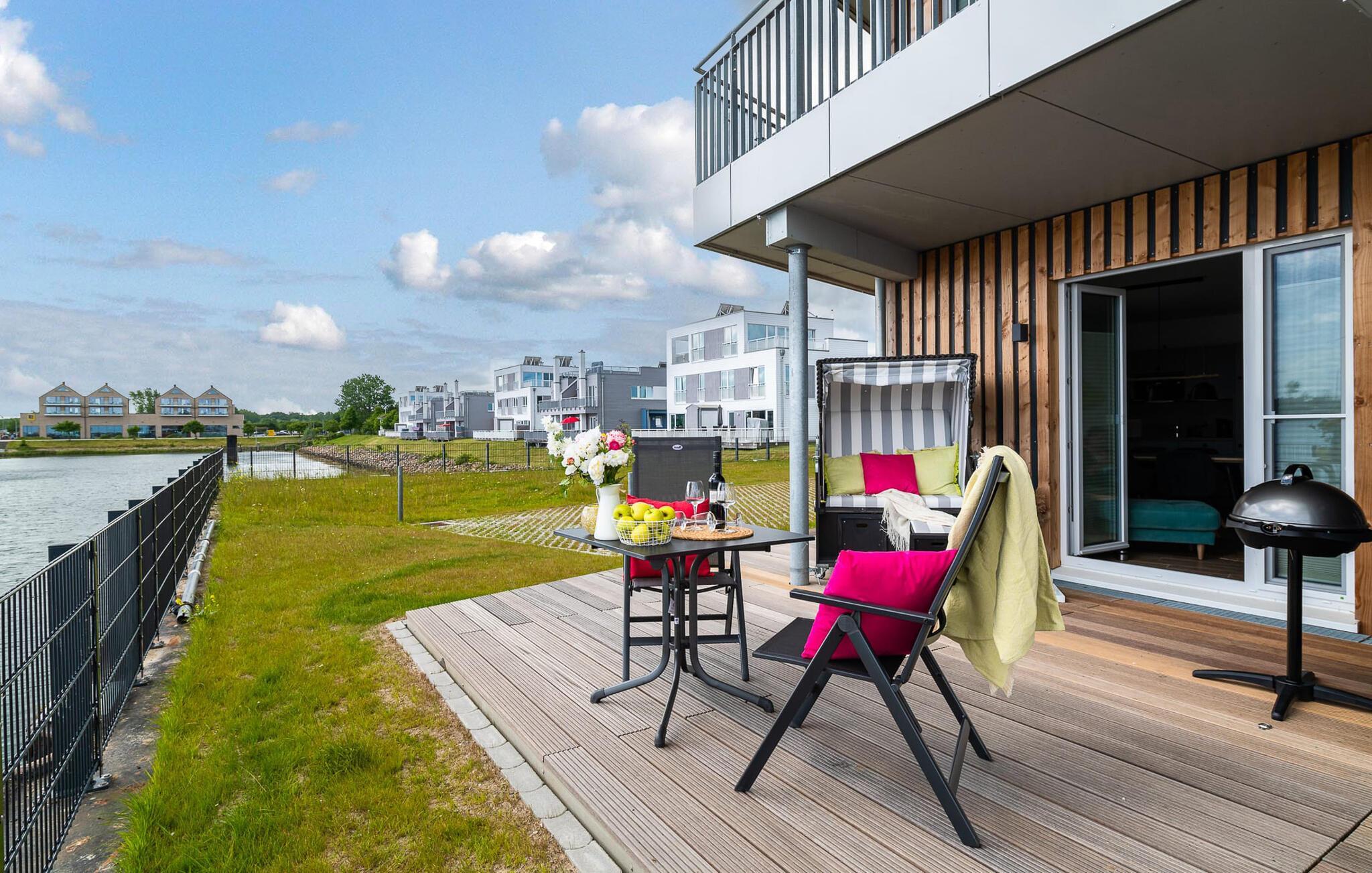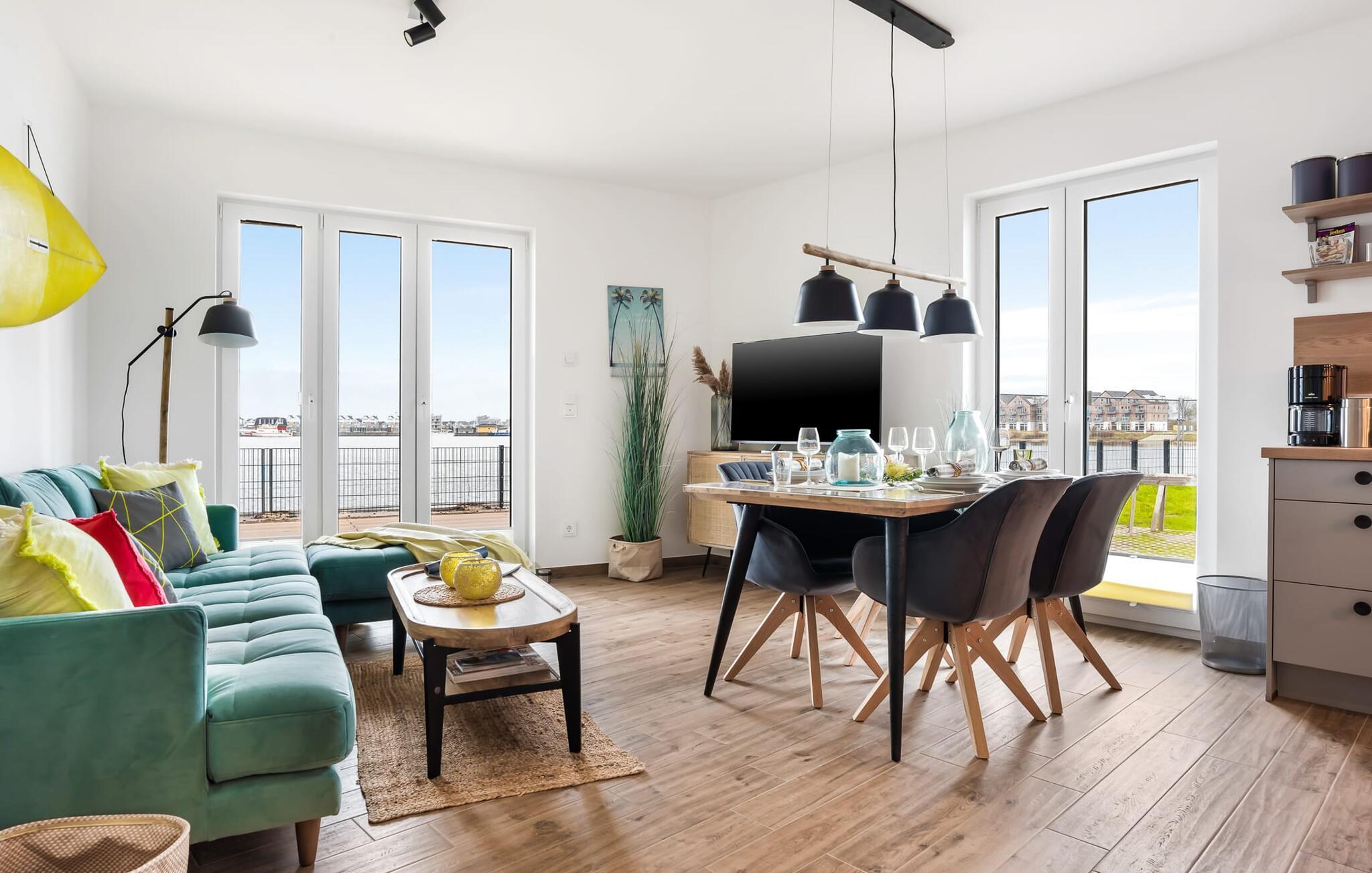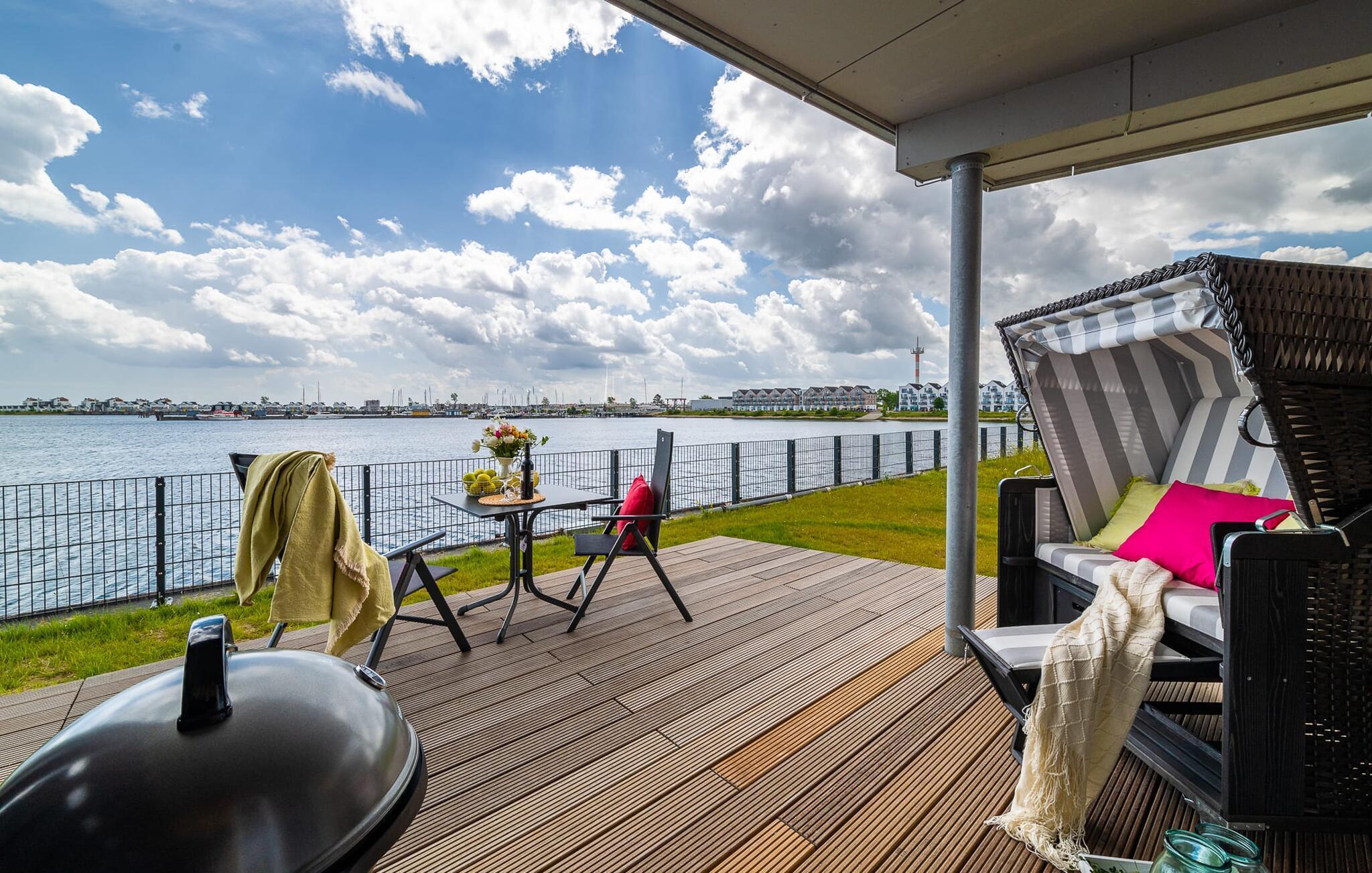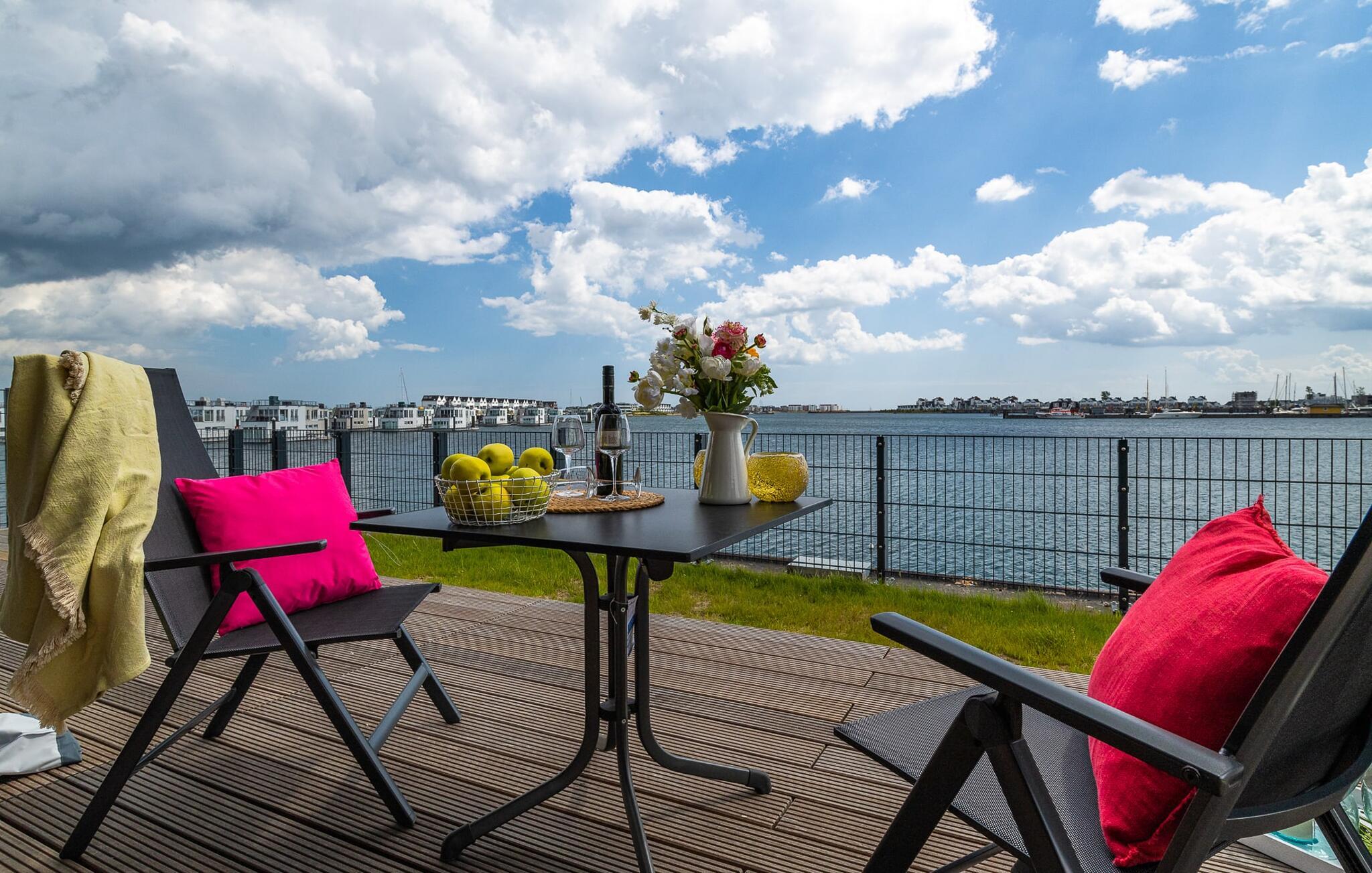 Der offene Wohn- und Essbereich mit integrierter Küche gestaltet sich aufgrund der bodentiefen Fensterfront lichtdurchflutet und die täglichen Sonnenaufgänge zu beobachten wird zu unvergesslichen Ferienerlebnissen. Von hier hat der Gast Zugang zur großen Terrasse. Der Blick auf Hafen, Wasser und Schiffe und die ferne Ostsee vermittelt das Gefühl für eine Weile Kapitän auf großer Fahrt zu sein. Die Terrasse erstreckt sich in verjüngender Form um die gesamte Wohnung und verstärkt das Gefühl an Deck zu sein. Stylische Outdoormöbel stehen bereit, um in dieser einmaligen Atmosphäre genussvoll zu dinieren oder einfach nur zu entspannen.