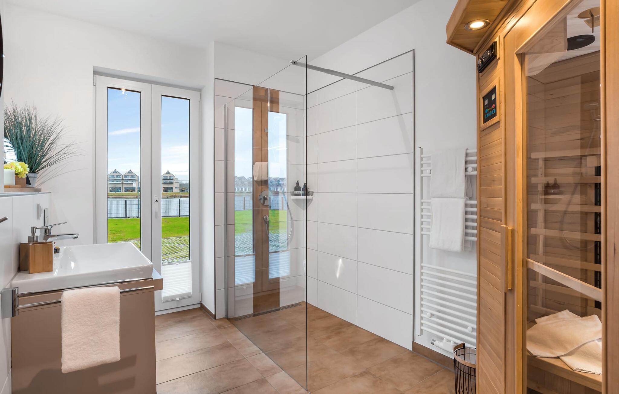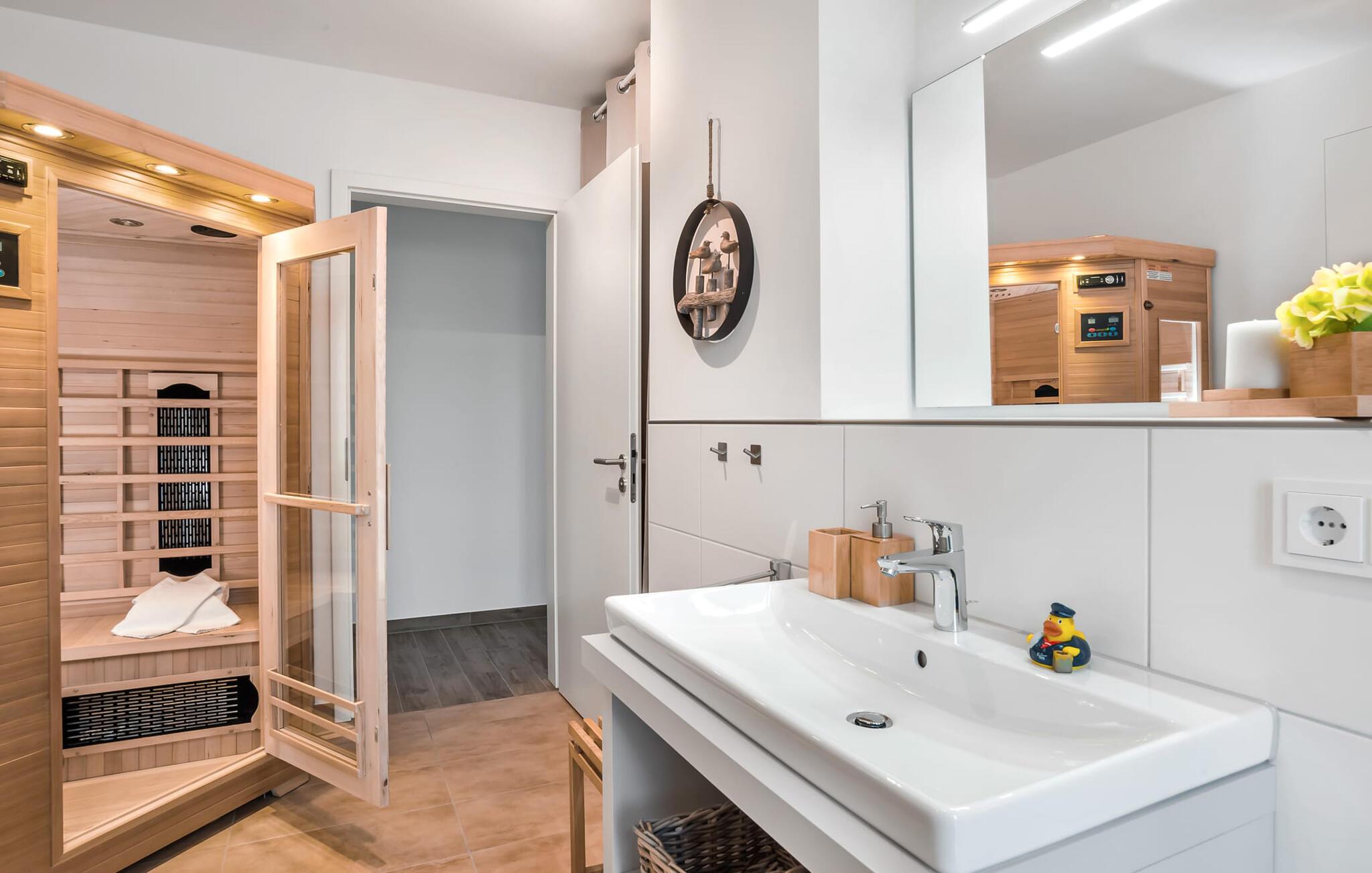 Eine weiteres Highlight ist das Duschbad. Neben allem Nützlichen warten hier eine bodengleiche Dusche und eine Infrarotkabine darauf, die Gäste zu verwöhnen. Sei es nach einem Tag auf stürmischer See oder einem ausgiebigen Strandtag.